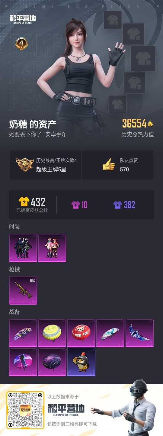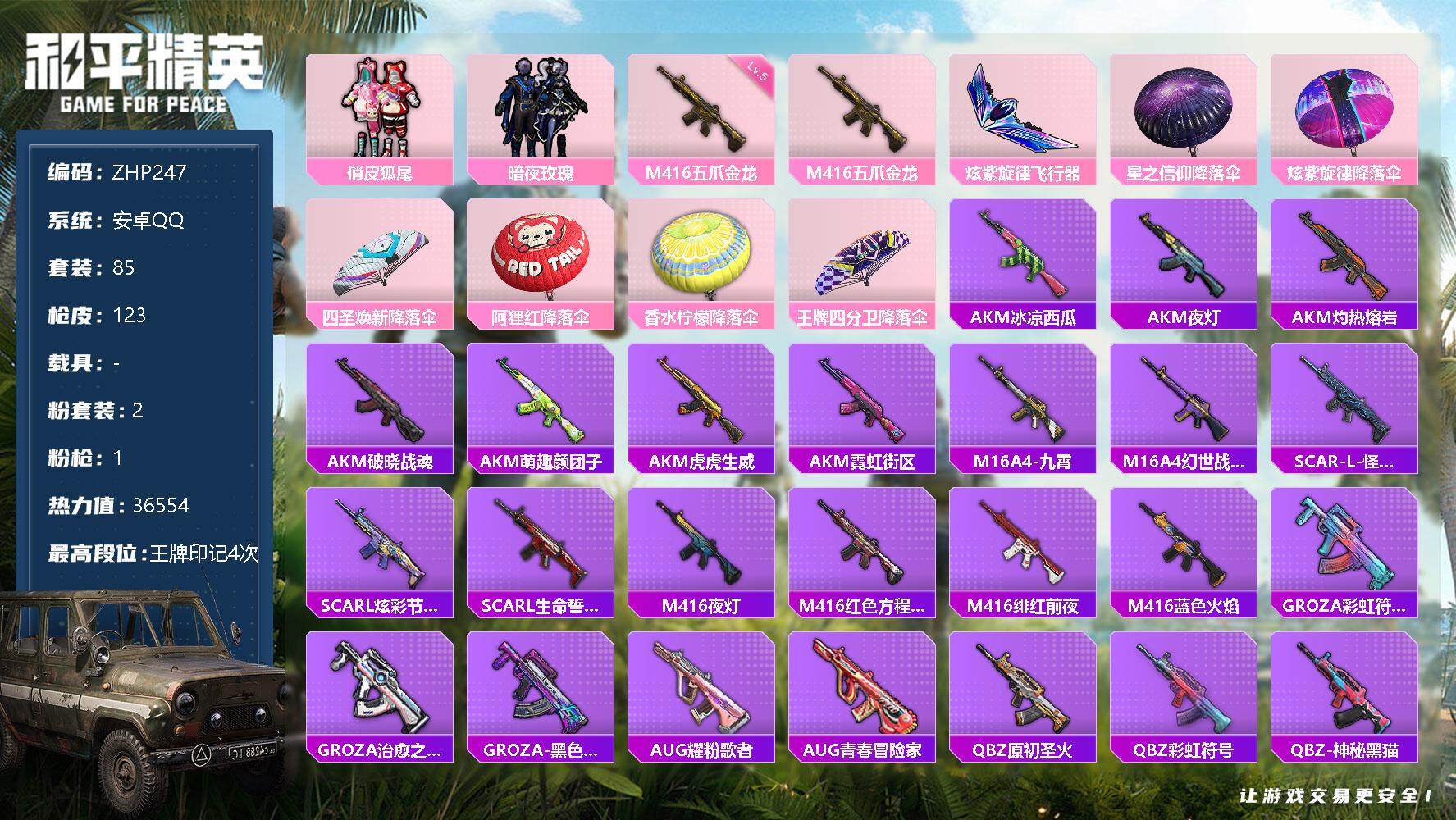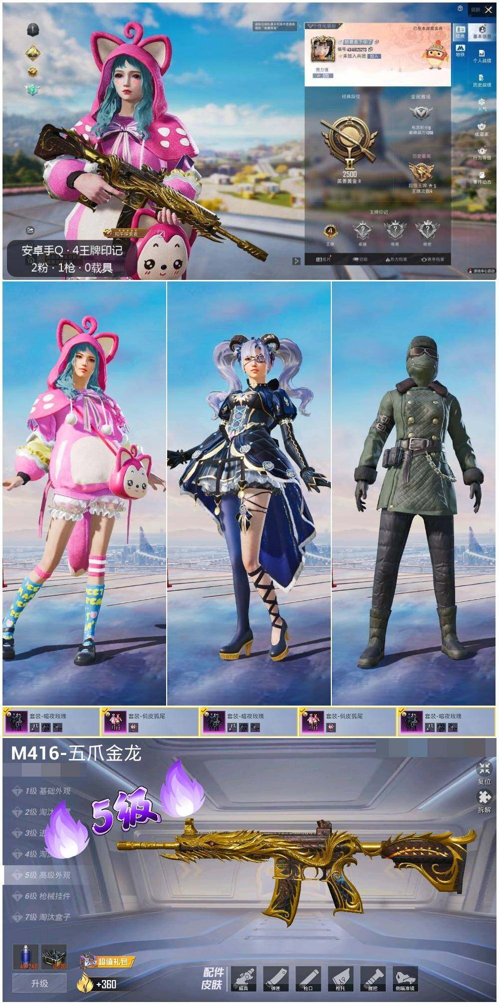 [12685153]安卓 手Q-2粉装-1特效枪-1粉色飞行器-3.6w热力值-4王牌印记-85套装-123枪皮【粉色套装】:粉装-俏皮狐尾,粉装-暗夜玫瑰【粉色枪皮等级】:M416-五爪金龙(五级)【粉色飞行器】:炫紫旋律飞行器