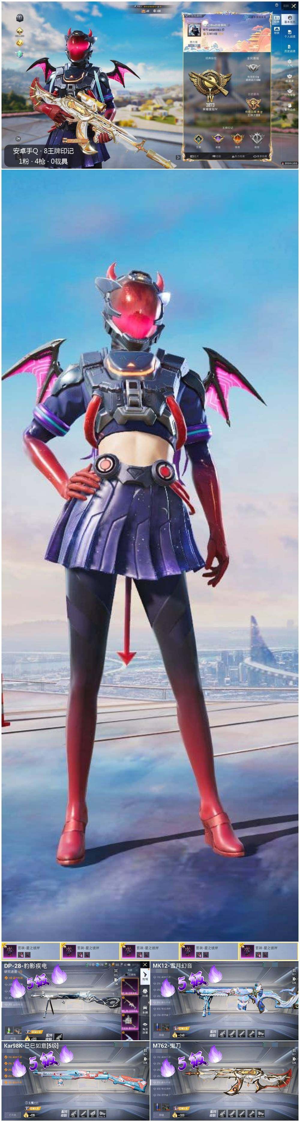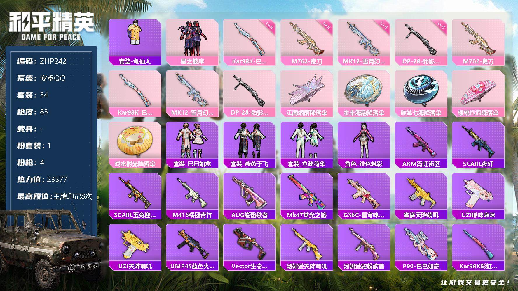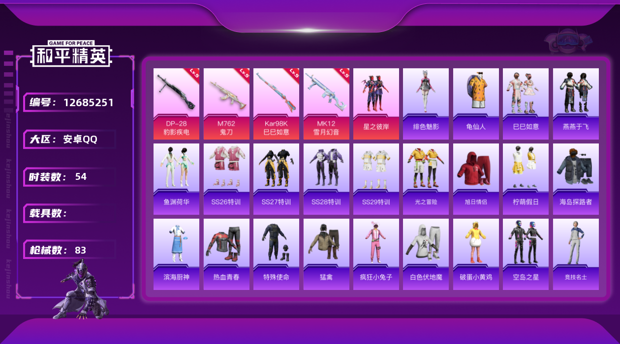 [12685251]地铁满天赋 安卓 手Q-1粉装-4特效枪-2.3w热力值-8王牌印记-54套装-83枪皮【热门品类】:套装-龟仙人【粉色套装】:粉装-星之彼岸【粉色枪皮等级】:M762-鬼刀(五级),Kar98K-巳巳如意(五级),MK12-雪月幻音(五级),DP-28-豹影疾电(五级)