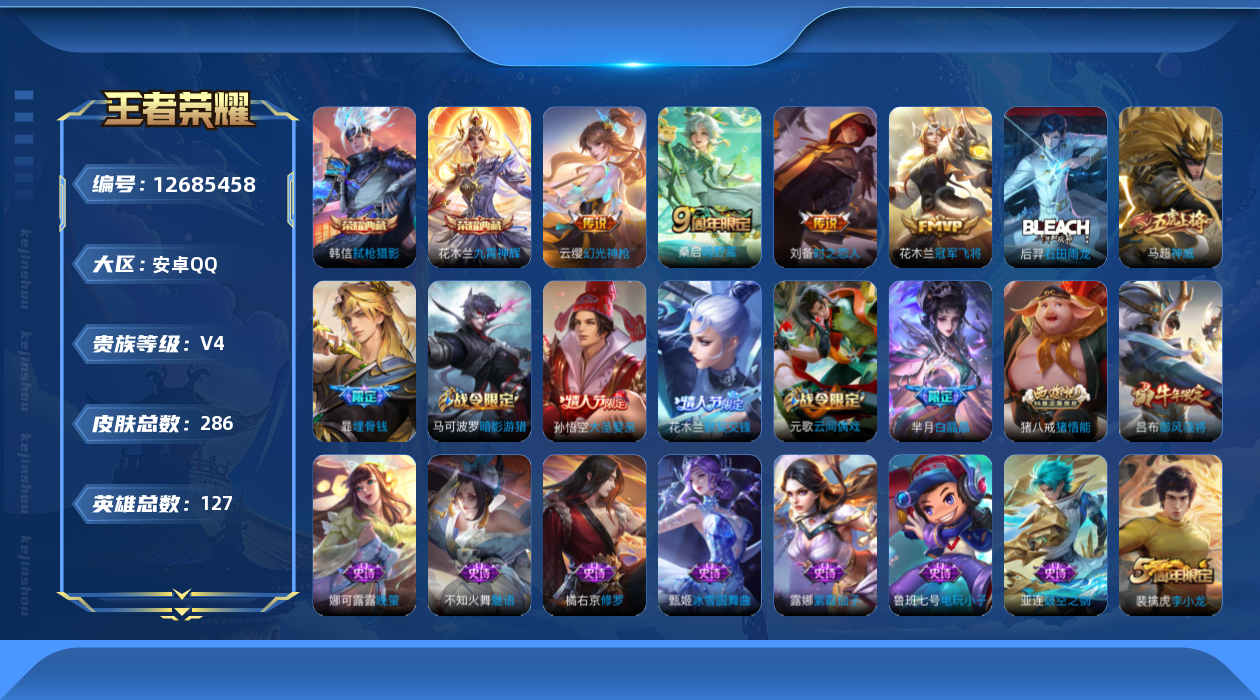 [12685458]安卓Q-V4-永恒钻石IV段位-127英雄-286皮肤-2典藏-4传说-84史诗