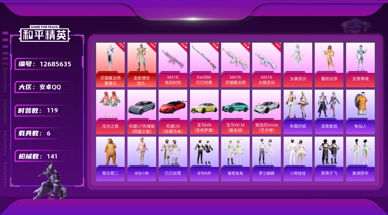 [12685635]素材身法号/地铁满天赋 安卓 手Q-2红装-4粉装-5特效枪-6载具-5.1w热力值-2印记-119套装-141枪皮【角色神装等级】:灵猫魔法师-塞维尔(一级),金蛇镇世-烛九(一级)【稀有载具】:仰望U9(赤霞丹朱),仰望U7(阿盖尔紫),宝马M4(圣保罗黄),宝马X6 M(曼岛绿),帕加尼imola(艺术银),僚机-萌兔起飞【特效枪等级】:M416-电玩时刻(五级),M416-女娲灵识(一级),M416-灵猫魔法师(三级),Kar98K-巳巳如意(五级),MG3-辉羽雀灵(五级Mk14-甜梦熊击)【优质套装】:粉装-炫光之旅,角色-女娲灵识,角色-玄冥寒域,角色-羲和光序【优质飞行器】:沙丘之主天马,凤舞九天飞行器