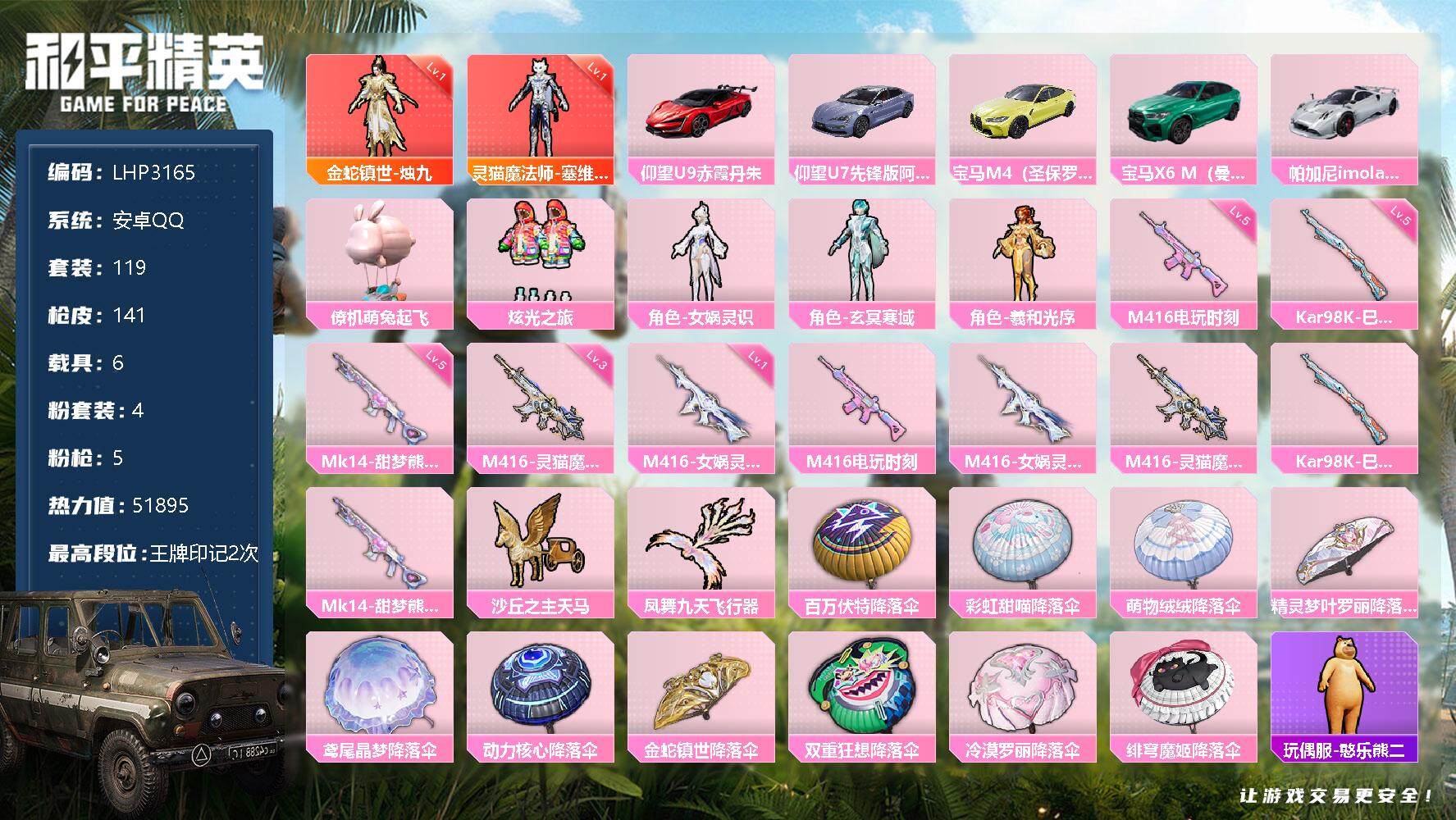 - [13106542]素材身法号【特价急出/详情看图】:安卓 手Q-19粉装-7特效枪-10载具-3粉色飞行器-9.3w热力值-8王牌印记-180套装-224枪皮【热门品类】:粉装-梦幻火箭,粉装-童趣迷兔,套装-浪漫天命,套装-小丑鱼,套装-胖达圆圆,套装-AG战队服,套装-龟仙人,套装-浪漫波比,套装-粉红小猪,角色-Mark.06,熔岩游骑兵面罩,熔岩游骑兵连帽夹克 【粉色载具】:特斯拉Roadster(水滴蓝),阿斯顿马丁DBX(橙),玛莎拉蒂Ghibli(金),玛莎拉蒂Ghibli(粉),迈凯伦570S(天际蓝),灵鼠银迹,萌喵橘座,双人摩托-双刃魅影(绿),鬼马风驰,空客H135-蔚蓝之翼【粉色套装】:粉装-天使彩虹糖,粉装-金曜白虎,粉装-梦幻火箭,粉装-智能音符,粉装-绚金战神,粉装-银刃赛罗,粉装-冰霜白皇,粉装-童趣迷兔,粉装-炙焰红王,粉装-香水柠檬,粉装-暗翼战神,粉装-绮梦青鸾,粉装-星之彼岸,粉装-相思残雪,粉装-甜梦冰蝶,粉装-心之回忆,粉装-未来歌姬,角色-阿尔茜,角色-烟云彩露【粉色枪皮等级】:AKM-甜心宝贝(五级),M416-五爪金龙(七级),M416-电玩时刻(五级),GROZA-香水柠檬(五级),M762-激战未来(七级),汤姆逊-怪笑疯兔(四级),Kar98K-巳巳如意(一级)【粉色飞行器】:激战未来飞行器,终极赛罗飞行器,庄周梦蝶飞行器