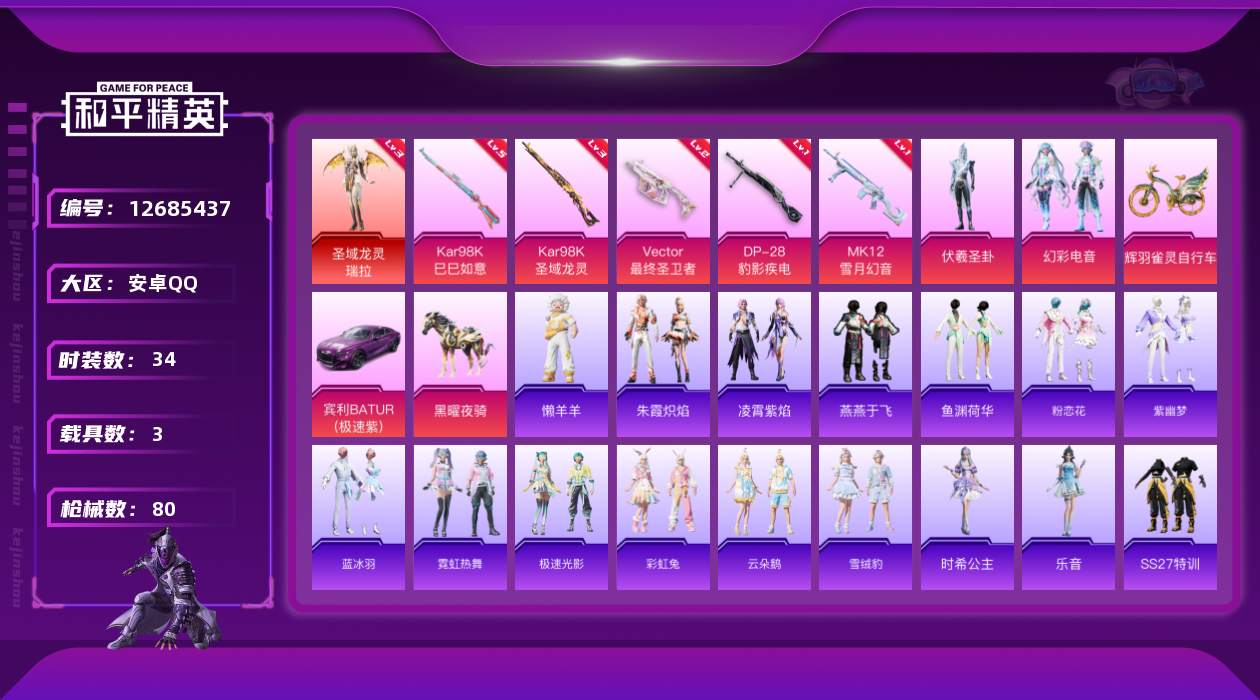 [12685437]素材身法号/扭蛋碎片732/璀璨碎片734 安卓 手Q-1神装-2粉装-5特效枪-3载具-4粉色飞行器-2.8w热力值-3王牌印记-34套装-80枪皮【红色神装等级】:圣域龙灵-瑞拉(三级)【粉色载具】:宾利BATUR(极速紫),黑曜夜骑,辉羽雀灵自行车【粉色套装】:角色-伏羲圣卦,粉装-幻彩电音【粉色枪皮等级】:Vector-最终圣卫者(二级),Kar98K-巳巳如意(五级),Kar98K-圣域龙灵(三级),MK12-雪月幻音(一级),DP-28-豹影疾电(一级)【粉色飞行器】:戏水时光飞行器,圣域金龙飞行器,终晖之翼飞行器,灵猫魔法师飞行器