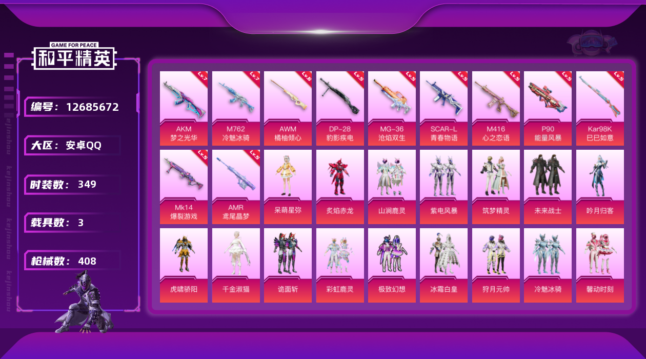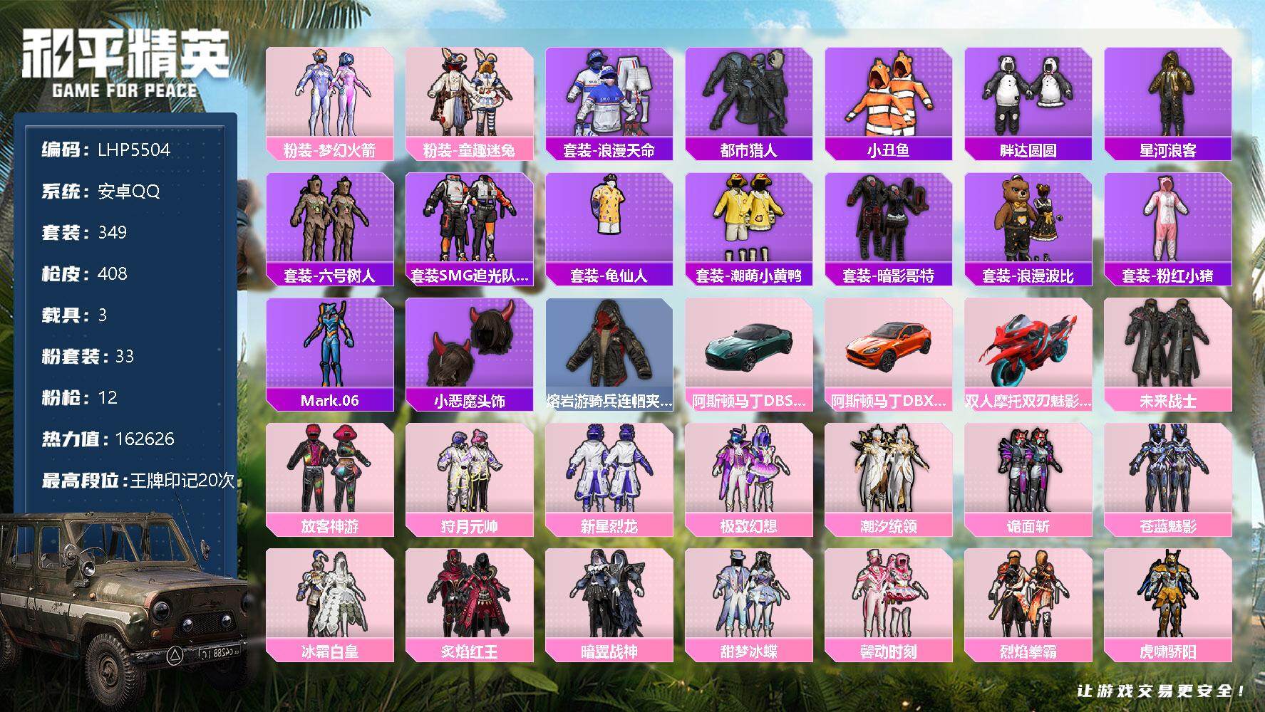 [12685672]素材身法号/地铁满天赋 安卓 手Q-33粉装-12特效枪-3载具-5粉色飞行器-16.2w热力值-20王牌印记-349套装-408枪皮【热门品类】:粉装-梦幻火箭,粉装-童趣迷兔,套装-浪漫天命,套装-都市猎人,套装-小丑鱼,套装-胖达圆圆,套装-星河浪客,套装-六号树人,套装-SMG追光队服,套装-龟仙人,套装-潮萌小黄鸭,套装-暗影哥特,套装-浪漫波比,套装-粉红小猪,角色-Mark.06,小恶魔头饰,熔岩游骑兵连帽夹克【粉色载具】:阿斯顿马丁DBS(绿),阿斯顿马丁DBX(橙),双人摩托-双刃魅影(红)【粉色套装】:粉装-未来战士,粉装-梦幻火箭,粉装-放客神游,粉装-狩月元帅,粉装-新星烈龙,粉装-极致幻想,粉装-潮汐统领,粉装-诡面斩,粉装-苍蓝魅影,粉装-冰霜白皇,粉装-童趣迷兔,粉装-炙焰红王,粉装-暗翼战神,粉装-甜梦冰蝶,粉装-馨动时刻,粉装-烈焰拳霸,粉装-虎啸骄阳,粉装-炙焰赤龙,粉装-彩虹鹿灵,粉装-山涧鹿灵,粉装-吟月归客,粉装-碧影闪光,粉装-薄荷物语,粉装-冷魅冰骑,粉装-赤焰黑爵,粉装-紫电风暴,粉装-筑梦精灵,粉装-冰川红玫,粉装-仲夏莫吉托,粉装-瑰丽时代,角色-呆萌星弥,粉装-闲梦青缨,角色-千金淑猫【粉色枪皮等级】:AKM-梦之光华(七级),SCAR-L-青春物语(五级),M416-心之恋语(五级),M762-冷魅冰骑(七级),P90-能量风暴(五级),Kar98K-巳巳如意(五级),AWM-橘柚倾心(六级),Mk14-爆裂游戏(五级),AMR-鸢尾晶梦(五级),DP-28-豹影疾电(五级),MG-36-沧焰双生(五级)【粉色飞行器】:梦幻火箭飞行器,古堡领主飞行器,暗翼战神飞行器,镜域双华-灵镜之阶,圣域金龙飞行器