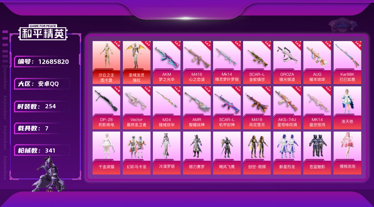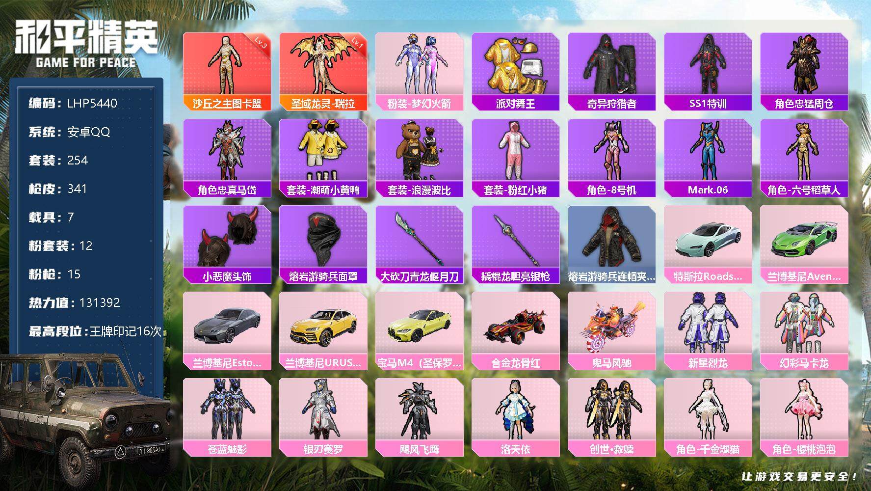 [12685820]素材身法号/地铁满天赋 安卓 手Q-2神装-12粉装-15特效枪-7载具-13粉色飞行器-13.1w热力值-16王牌印记-254套装-341枪皮【红色神装等级】:圣域龙灵-瑞拉(一级),沙丘之主-图卡盟(三级)【热门品类】:粉装-梦幻火箭,套装-派对舞王,套装-奇异狩猎者,套装-SS1特训,角色-忠猛周仓,角色-忠真马岱,套装-潮萌小黄鸭,套装-浪漫波比,套装-粉红小猪,角色-8号机,角色-Mark.06,角色-六号稻草人,小恶魔头饰,熔岩游骑兵面罩,大砍刀-青龙偃月刀,撬棍-龙胆亮银枪,熔岩游骑兵连帽夹克【粉色载具】:特斯拉Roadster(水滴蓝),兰博基尼Aventador SVJ(翡翠绿),兰博基尼Estoque(银翼灰),兰博基尼URUS(明艳黄),宝马M4(圣保罗黄),合金龙骨(红),鬼马风驰【粉色套装】:粉装-梦幻火箭,粉装-新星烈龙,粉装-幻彩马卡龙,粉装-苍蓝魅影,粉装-银刃赛罗,粉装-飓风飞鹰,角色-洛天依,套装-创世·救赎,角色-千金淑猫,角色-樱桃泡泡,角色-智耀战神,角色-冷漠罗丽【粉色枪皮等级】:AKM-梦之光华(七级),SCAR-L-机甲封神(一级),SCAR-L-金蛇镇世(六级),M416-心之恋语(七级),M416-风花雪月(一级),GROZA-镜光银凌(五级),AUG-暖羊咩咩(五级),Vector-最终圣卫者(四级),AKS-74U-星穹咏叹调(一级),Kar98K-巳巳如意(五级),M24-镜域双华(三级),Mk14-精灵梦叶罗丽(七级),Mk14-盛世惊鸿(一级),AMR-智耀战神(三级),DP-28-豹影疾电(四级)【粉色飞行器】:酣梦熊熊飞行器,梦幻火箭飞行器,梦之光华飞行器,沙丘之主天马,镜域双华-灵镜之阶,龙翔九天飞行器,曦光华影飞行器,幽焰列车飞行器,凤舞九天飞行器,万象金身飞行器,圣域金龙飞行器,雀灵庇佑飞行器