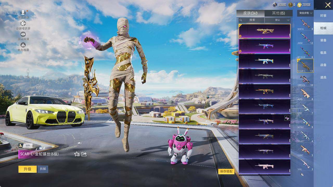 AKM-梦之光华,SCAR-L-机甲封神,SCAR-L-金蛇镇世,M416-心之恋语,M416-风花雪月,GROZA-镜光银凌,AUG-暖羊咩咩,Kar98K-巳巳如意,M24-镜域双华,Mk14-精灵梦叶罗丽,Mk14-盛世惊鸿