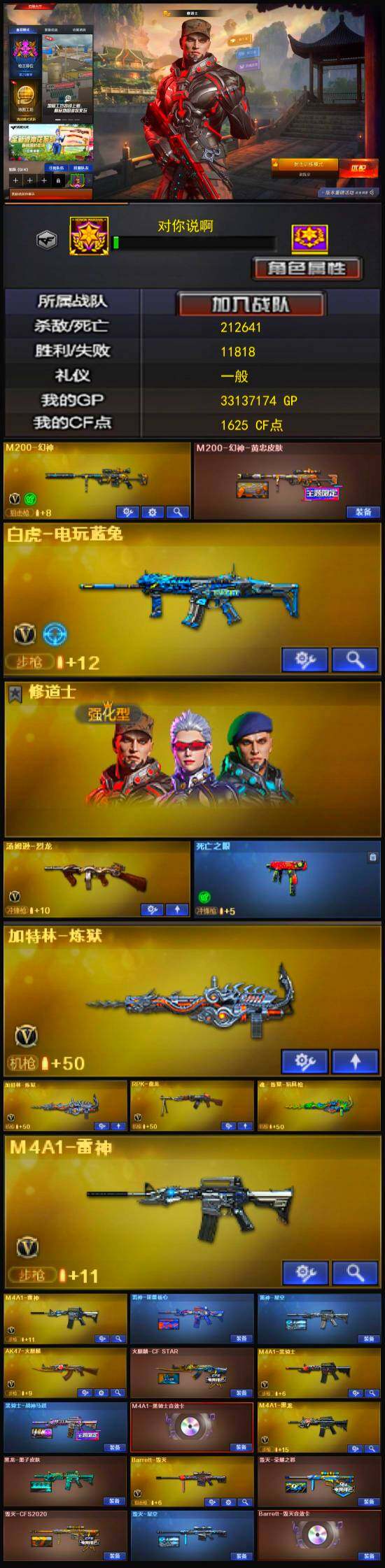 【热门武器】:M200-幻神,死亡之眼,白虎-电玩蓝兔,M4A1-黑骑士,汤姆逊-烈龙,RPK-盘龙,加特林-炼狱*2,沙鹰-修罗*2