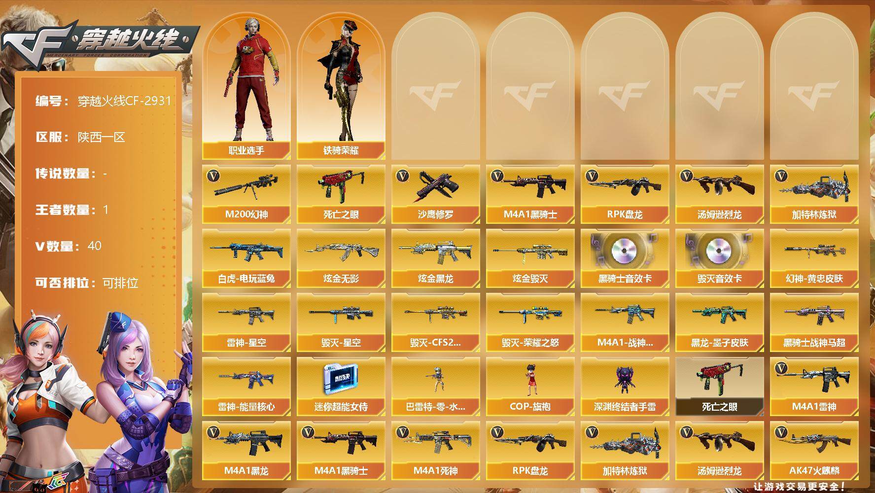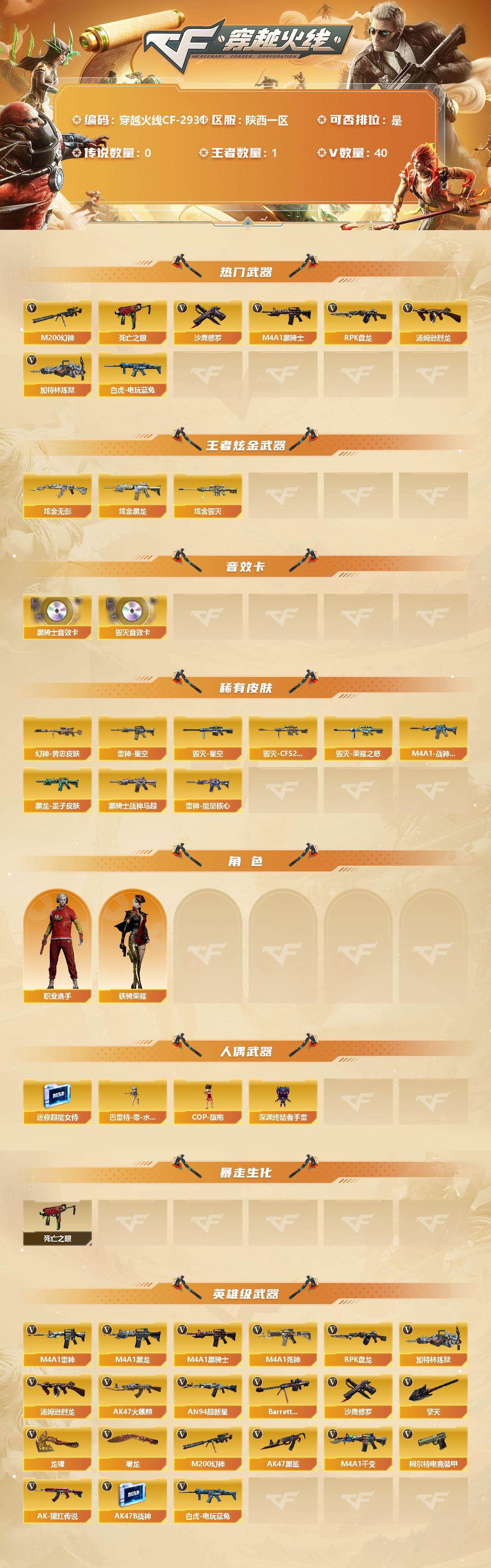[12686340]陕西一区-40V-1王者-4炫金 【热门武器】:M200-幻神,死亡之眼,白虎-电玩蓝兔,M4A1-黑骑士,汤姆逊-烈龙,RPK-盘龙,加特林-炼狱*2,沙鹰-修罗*2 【王者炫金武器】:炫金无影*2,炫金黑龙,炫金毁灭 【音效卡】:M4A1-黑骑士音效卡,Barrett-毁灭音效卡 【稀有皮肤】:M200-幻神-黄忠皮肤,雷神-能量核心,雷神-星空,M4A1-战神赵云,黑骑士-战神马超,黑龙-墨子皮肤,毁灭-荣耀之怒,毁灭-星空,毁灭-CFS2020 【角色】:铁骑荣耀,职业选手 【人偶武器】:巴雷特-零-水下丽影,COP-旗袍,迷你超能女侍,深渊终结者手雷 【暴走生化】:死亡之眼 【英雄级武器】:柯尔特-电竞装甲,白虎-电玩蓝兔,M4A1-雷神*2,M4A1-黑龙,M4A1-黑骑士,M4A1-死神,RPK-盘龙,加特林-炼狱*2,汤姆逊-烈龙,AK47-火麒麟,AN94-超新星,Barrett-毁灭,M200-幻神,AK47-黑鲨,M4A1-千变,AK-47-猩红传说*5,AK47-B-战神,沙鹰-修罗*2,擎天,龙啸,屠龙*3 【特殊枪械】:1黑骑士,1烈龙,1盘龙,2炼狱