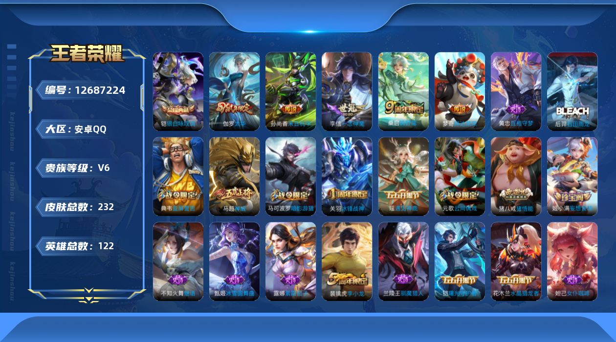[12687224]安卓Q-V6-最强王者段位-122英雄-232皮肤-1典藏-0珍品无双-0无双-0珍品传说-5传说-58史诗