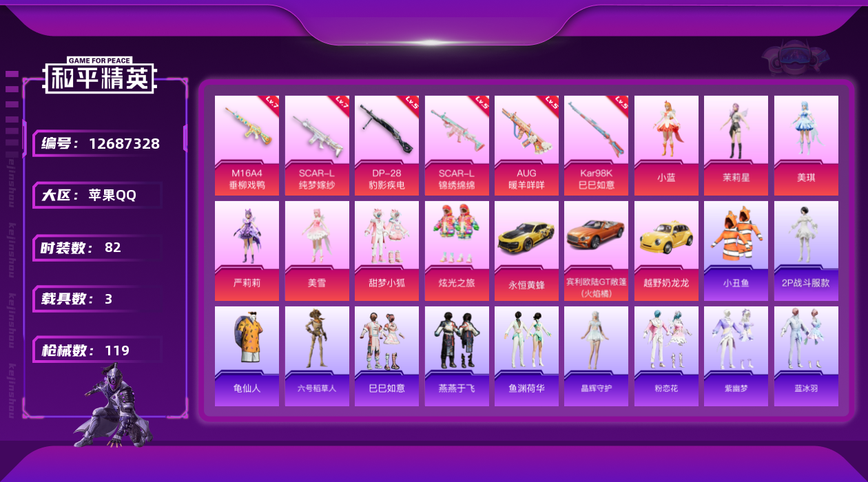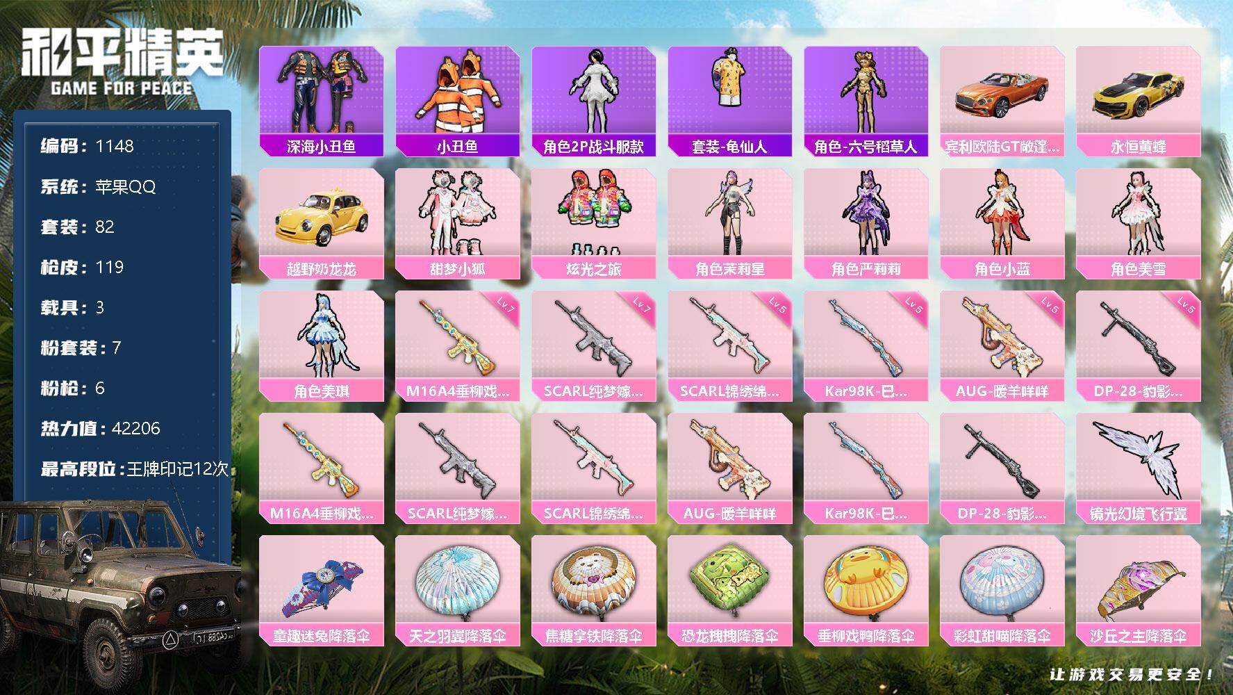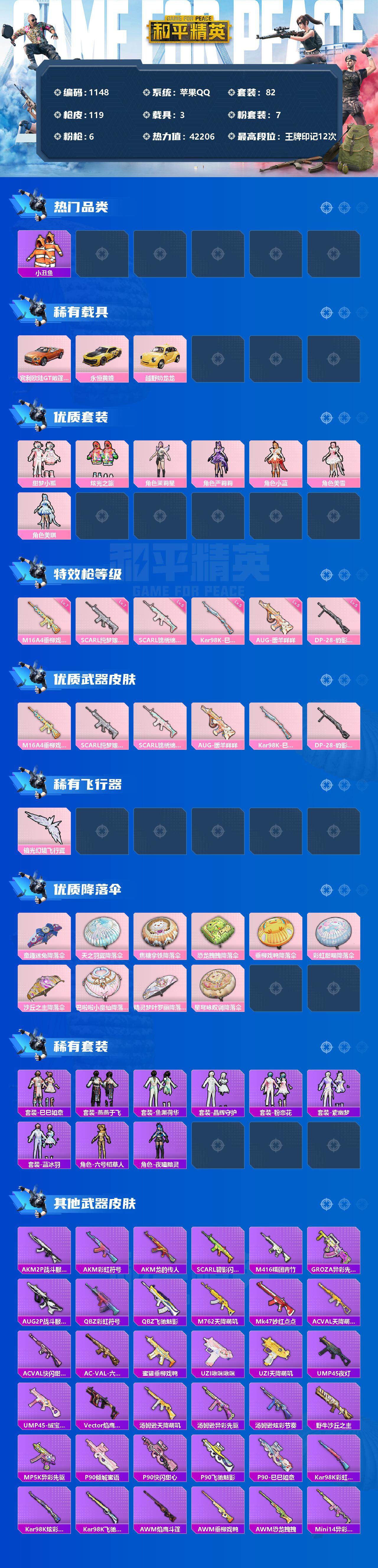 [12687328]苹果 手Q-7粉装-6特效枪-3载具-1粉色飞行器-42206热力值-12王牌印记-82套装-119枪皮 【热门品类】:套装-深海小丑鱼,套装-小丑鱼,角色-2P战斗服款,套装-龟仙人,角色-六号稻草人 【粉色载具】:宾利欧陆GT敞篷(火焰橘),永恒黄蜂,越野奶龙龙 【粉色套装】:粉装-甜梦小狐,粉装-炫光之旅,角色-茉莉星,角色-严莉莉,角色-小蓝,角色-美雪,角色-美琪 【粉色枪皮等级】:M16A4-垂柳戏鸭(七级),SCAR-L-纯梦嫁纱(七级),SCAR-L-锦绣绵绵(五级),AUG-暖羊咩咩(五级),Kar98K-巳巳如意(五级),DP-28-豹影疾电(五级) 【粉色枪皮】:M16A4-垂柳戏鸭,SCAR-L-纯梦嫁纱,SCAR-L-锦绣绵绵,AUG-暖羊咩咩,Kar98K-巳巳如意,DP-28-豹影疾电 【粉色飞行器】:镜光幻境飞行翼 【粉色降落伞】:童趣迷兔降落伞,天之羽翼降落伞,焦糖拿铁降落伞,恐龙拽拽降落伞,垂柳戏鸭降落伞,彩虹甜喵降落伞,沙丘之主降落伞,巴啦啦小魔仙降落伞,精灵梦叶罗丽降落伞,星穹咏叹调降落伞 【稀有套装】:套装-龟仙人,套装-巳巳如意,套装-燕燕于飞,套装-鱼渊荷华,套装-晶辉守护,套装-粉恋花,套装-紫幽梦,套装-蓝冰羽,角色-六号稻草人,角色-夜瞳黯灵 【稀有枪皮】:AKM-2P战斗服款,AKM-彩虹符号,AKM-龙的传人,SCAR-L-碧影闪光,M416-糯团青竹,GROZA-异彩先驱,AUG-2P战斗服款,QBZ-彩虹符号,QBZ-飞驰魅影,M762-天降萌叽,Mk47-妙红点点,AC-VAL-天降萌叽,AC-VAL-快闪甜心,AC-VAL-六号稻草人,蜜獾-垂柳戏鸭,UZI-啾咪啾咪,UZI-天降萌叽,UMP45-夜灯,UMP45-绒宝小鹅,Vector-焰鹰斗篷,汤姆逊-天降萌叽,汤姆逊-异彩先驱,汤姆逊-炫彩节奏,野牛-沙丘之主,MP5K-异彩先驱,P90-倾城蜜语,P90-快闪甜心,P90-飞驰魅影,P90-巳巳如意,Kar98K-彩虹符号,Kar98K-炫彩节奏,Kar98K-飞驰魅影,AWM-焰鹰斗篷,AWM-垂柳戏鸭,AWM-恐龙拽拽,Mini14-异彩先驱,AMR-妙红点点,M417-惊鸿侠骨,MK20-H-快闪甜心,M200-惊鸿侠骨,M200-六号稻草人,S686-蜜语绒猫,S1897-碧影闪光,S