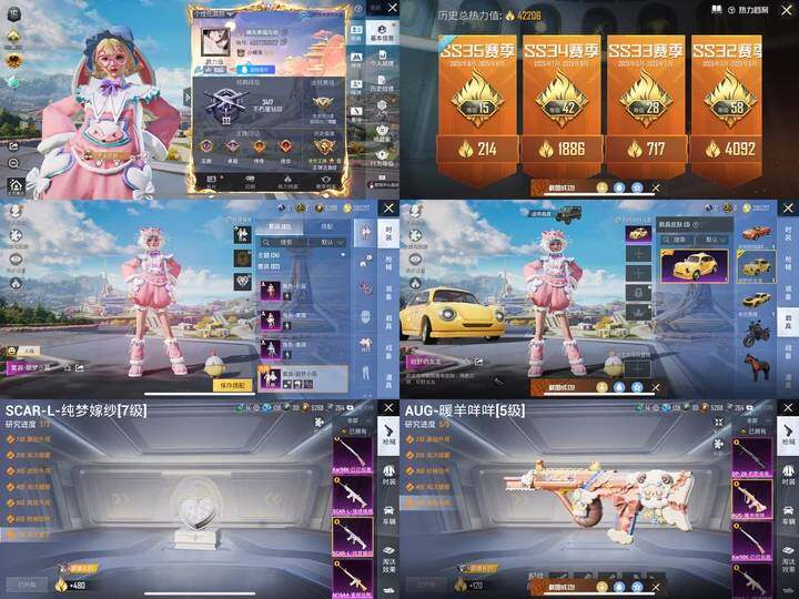 【粉色枪皮等级】:M16A4-垂柳戏鸭(七级),SCAR-L-纯梦嫁纱(七级),SCAR-L-锦绣绵绵(五级),AUG-暖羊咩咩(五级),Kar98K-巳巳如意(五级),DP-28-豹影疾电(五级)