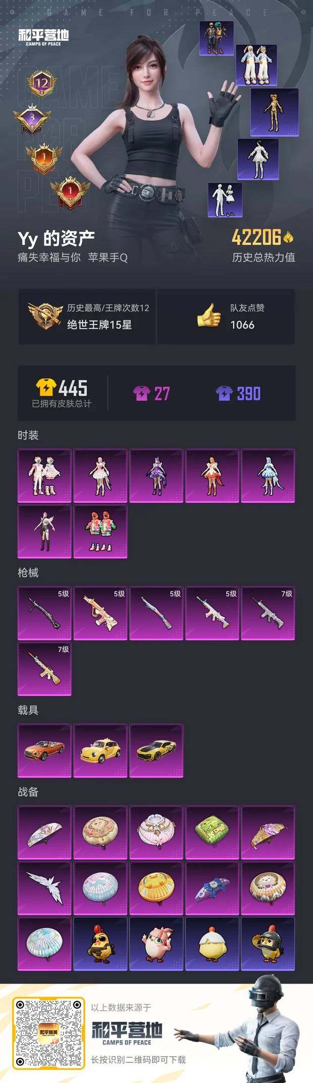 - PX_2107688-苹果QQ 历史总热力值:88921 粉装数量:15 特效枪数量:8 载具数量:1 王牌印记:19 历史最高段位:超级王牌16星 套装数量:166 时装数量:607 枪械数量:243 战备数量:179 装备数量:323 载具:玛莎拉蒂Ghibli(粉) 时装:套装-傲傲奶龙,套装-冰霜白皇,套装-垂柳戏鸭,套装-天使彩虹糖,套装-宝贝奶油派,套装-幻情紫藤,套装-恐龙拽拽,套装