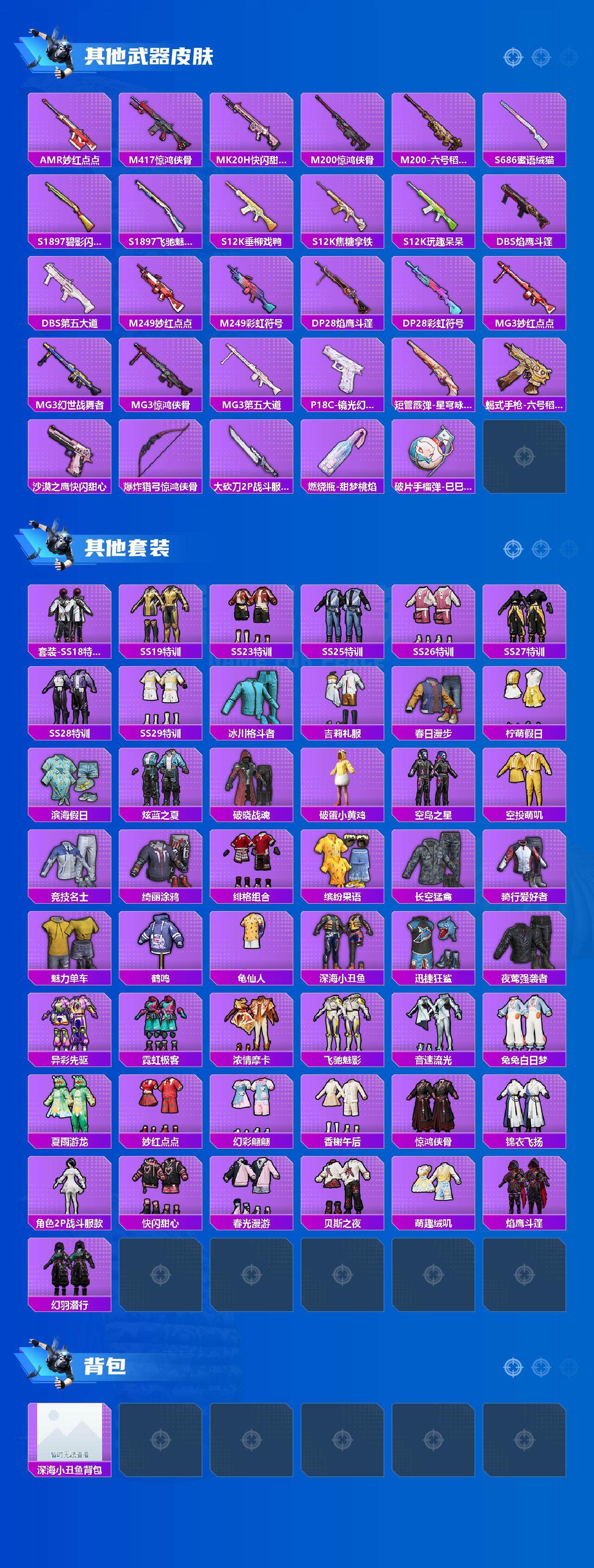 - [12193678]13粉装 10特效枪 1载具 13印记 可二次 可修改实名 优质装备:MG3洛神天依,蝶舞迷情,宝贝奶油派,缤纷油彩(猪妹猪脸妹),王牌四分卫,M249彩虹甜喵(M249-彩虹甜喵),M417第五大道,雪月幻音,星穹咏叹调,AKS-74U-星穹咏叹调,烟雾弹-甜梦果泡,MG-36-幻彩电音,时光之吻,羊梦糖心,Kar98K-巳巳如意 热门装扮:恐龙拽拽,妙趣可丽,仲夏莫吉托,第五大道,暗夜玫瑰,软萌银虎,迅捷狂鲨,呆萌铁蟹,爱崽白熊,东方飞龙,暗夜魅影 载具:冰绡玉鳞 稀有枪皮:DP-28-豹影疾电,平底锅仲夏莫吉托 六级特效枪:六级M249-彩虹甜喵 五级特效枪:五级Kar98K-巳巳如意,五级烟雾弹-甜梦果泡,五级DP-28-豹影疾电 四级特效枪:四级AKS-74U-星穹咏叹调,四级M417-第五大道,四级MG3-洛神天依 三级特效枪:三级MG-36-幻彩电音 二级特效枪:二级平底锅-仲夏莫吉托 紫色装扮:SS31特训套装,云朵鹅,彩虹兔,雪绒豹,SS33特训套装,青涩时光,旭日情侣,诡诞巡游,SS21特训,摩登艾咪,SS22特训,莱茵河畔,香榭午后,白兰地假日,顶瓜瓜,圣诞大吉,冷焰舞者,凛冬战士,刚毅裁决者,北国孤狼,千禧之恋,坚韧舞者,夏日音浪,完美偶像,帅气教官,幻世战舞者,冰川特警,兰香蝶语,萌趣咩咩,,SS5特训,人气偶像,伏击者,军械专家,冰原使者,暖心熊熊,娇憨猪猪,时空追击者,暴风机械师,星辰守护者,SS16特训,电音精灵,天籁歌者,瑞龙福将,团圆交子,SS17特训,炫光向阳,SS14特训,诡面顽熊,萌趣颜团子,特种颜团子,青春冒险家,潮流游乐家,SS15特训,暗夜傀儡,SS20特训,甜心亚梦,虚音幻奏,粉团憨憨,梦幻奶油,酸甜橘柚,俏皮奶喵,怒火燎原,软羊咩咩,异彩先驱,SS18特训,英勇保护者,SS19特训,战地菁英,黄色名流,风行保卫者,飞行日记,骑行爱好者,魅力单车,鹤鸣,麻辣教官,黑色伏地魔,龙腾端午,霓虹街区,酷潮明星,跃动心情,迎春赐吉,都市魅力,酒红色名流,酷萌兔限定,霓虹极客,金鼠迎春,长空猛禽,雪山征服者,雪山精英,绛羽幽主,街头潮人,海滨突袭者,滨海假日,滨海厨神,潮流炫酷,灰色格斗者,灼焰舞者,热血青春,牛气冲天,牛气满满,海岛探路者,战地督导,暗黑骑手,极地朋克,极速红龙,格斗先锋,沙漠探路者,翡翠奔狼,竞技达人朋克,