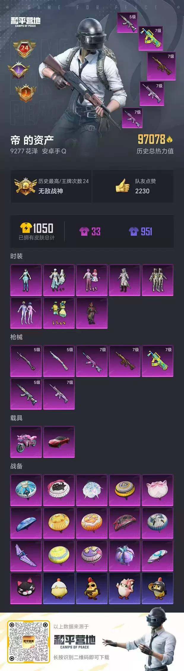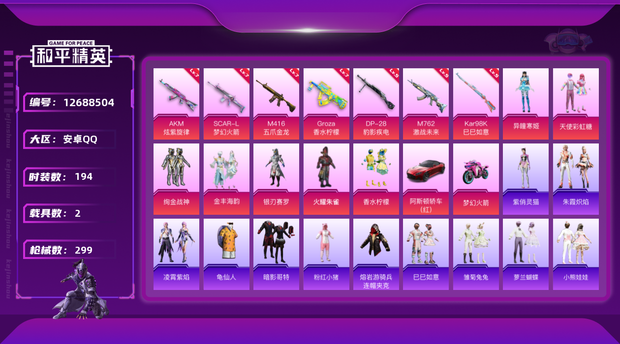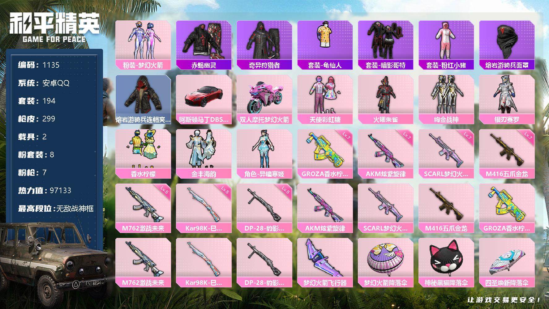 [12688504]安卓 手Q-无敌战神框-8粉装-7特效枪-2载具-1粉色飞行器-97133热力值-24王牌印记-194套装-299枪皮