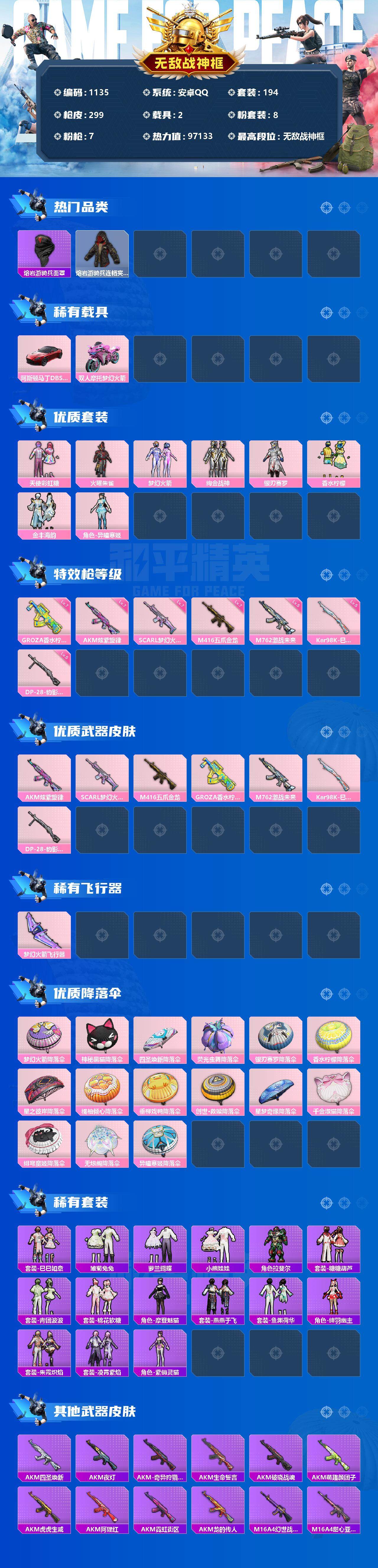 [12688504]安卓 手Q-无敌战神框-8粉装-7特效枪-2载具-1粉色飞行器-97133热力值-24王牌印记-194套装-299枪皮 【热门品类】:粉装-梦幻火箭,套装-赤蝎幽灵,套装-奇异狩猎者,套装-龟仙人,套装-暗影哥特,套装-粉红小猪,熔岩游骑兵面罩,熔岩游骑兵连帽夹克 【粉色载具】:阿斯顿马丁DBS(红),双人摩托-梦幻火箭 【粉色套装】:粉装-天使彩虹糖,粉装-火曜朱雀,粉装-梦幻火箭,粉装-绚金战神,粉装-银刃赛罗,粉装-香水柠檬,粉装-金丰海韵,角色-异瞳寒姬 【粉色枪皮等级】:AKM-炫紫旋律(七级),SCAR-L-梦幻火箭(七级),M416-五爪金龙(七级),GROZA-香水柠檬(七级),M762-激战未来(五级),Kar98K-巳巳如意(五级),DP-28-豹影疾电(五级) 【粉色枪皮】:AKM-炫紫旋律,SCAR-L-梦幻火箭,M416-五爪金龙,GROZA-香水柠檬,M762-激战未来,Kar98K-巳巳如意,DP-28-豹影疾电 【粉色飞行器】:梦幻火箭飞行器 【粉色降落伞】:梦幻火箭降落伞,神秘黑猫降落伞,四圣焕新降落伞,荧光虫舞降落伞,银刃赛罗降落伞,香水柠檬降落伞,星之彼岸降落伞,橘柚倾心降落伞,垂柳戏鸭降落伞,创世·救赎降落伞,星梦奇缘降落伞,千金淑猫降落伞,绯穹魔姬降落伞,无垠阁降落伞,异瞳寒姬降落伞 【稀有套装】:套装-龟仙人,套装-巳巳如意,套装-雏菊兔兔,套装-萝兰蝴蝶,套装-小熊娃娃,角色-拉斐尔,套装-糖糖葫芦,套装-青团波波,套装-棉花软糖,角色-摩登魅猫,套装-燕燕于飞,套装-鱼渊荷华,角色-绛羽幽主,套装-朱霞炽焰,套装-凌霄紫焰,角色-紫俏灵猫 【稀有枪皮】:AKM-四圣焕新,AKM-夜灯,AKM-奇异狩猎者,AKM-生命誓言,AKM-破晓战魂,AKM-萌趣颜团子,AKM-虎虎生威,AKM-阿狸红,AKM-霓虹街区,AKM-龙的传人,M16A4-幻世战舞者,M16A4-甜心亚梦,M16A4-红色方程式,M16A4-千金淑猫,SCAR-L-怪兽之王,SCAR-L-暗夜玫瑰,SCAR-L-未来战士,SCAR-L-玉兔迎春,SCAR-L-王牌四分卫,SCAR-L-红色方程式,SCAR-L-黄金龙骨,M416-仓鼠灰灰,M416-夜灯,M416-滑板小狐,M416-糯团青竹,M416-红色方程式,M416-蓝色火焰,GROZA-异