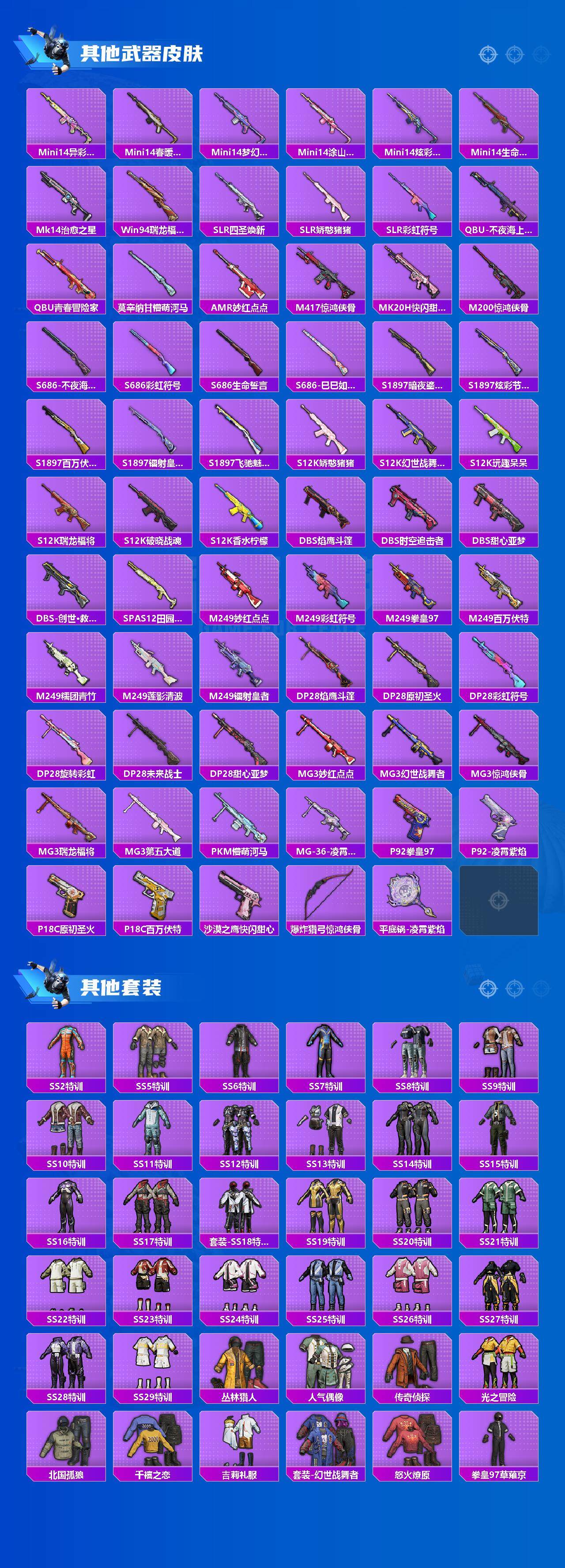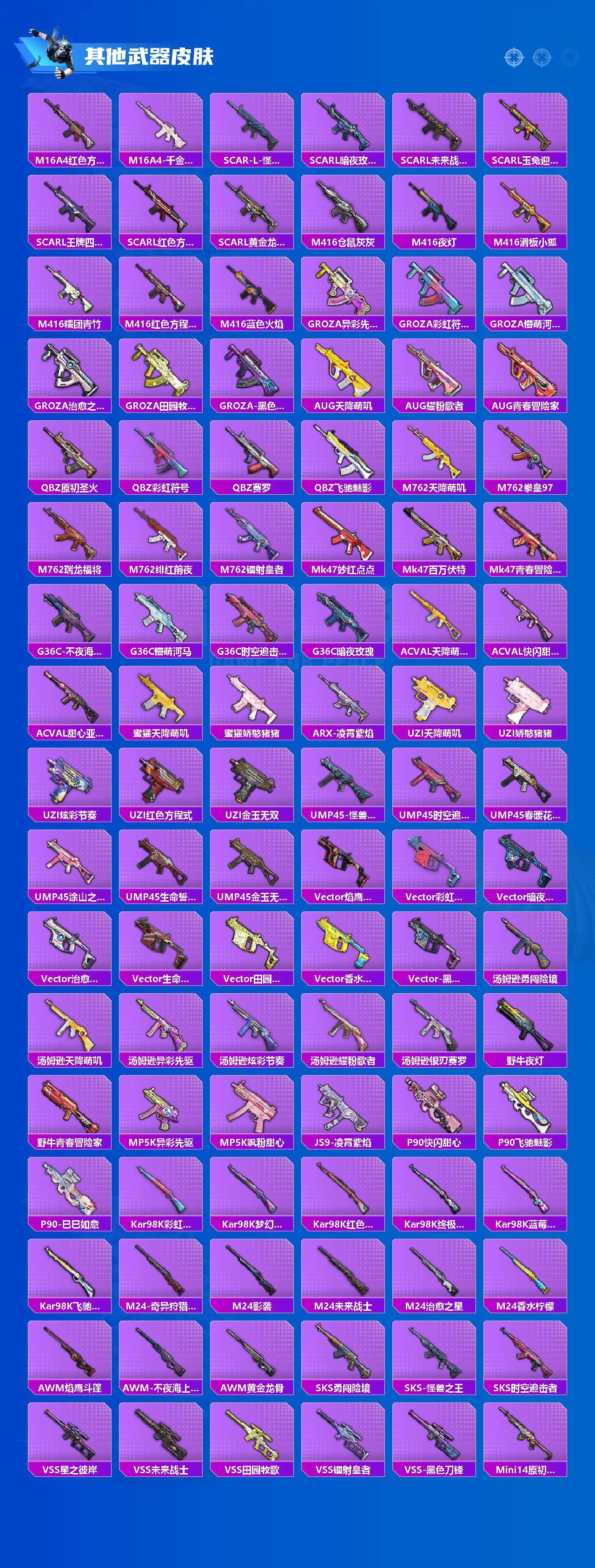 【稀有枪皮】:AKM-四圣焕新,AKM-夜灯,AKM-奇异狩猎者,AKM-生命誓言,AKM-破晓战魂,AKM-萌趣颜团子,AKM-虎虎生威,AKM-阿狸红,AKM-霓虹街区,AKM-龙的传人,M16A4-幻世战舞者,M16A4-甜心亚梦,M16A4-红色方程式,M16A4-千金淑猫,SCAR-L-怪兽之王,SCAR-L-暗夜玫瑰,SCAR-L-未来战士,SCAR-L-玉兔迎春,SCAR-L-王牌四分卫,SCAR-L-红色方程式,SCAR-L-黄金龙骨,M416-仓鼠灰灰,M416-夜灯,M416-滑板小狐,M416-糯团青竹,M416-红色方程式,M416-蓝色火焰,GROZA-异