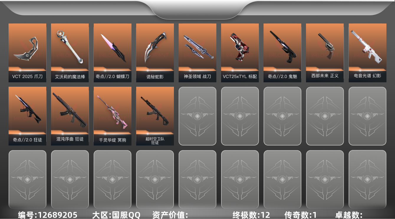 [12689205]【套装】:VCT 2025 赛季套装,奇点//2.0套装 【英雄】:幻棱,炼狱,维斯,暮蝶,钛狐,壹决,铁臂,捷风,雷兹,幽影,不死鸟,贤者,猎枭,蝰蛇,零,芮娜,奇乐,尚勃勒,霓虹,斯凯,夜露,星礈,K/O,海神,盖可,黑梦,钢锁 【近战 武器】:近战武器-奇点//2.0 蝴蝶刀,近战武器-VCT 2025 爪刀,近战武器-艾沃莉的魔法棒,近战武器-诡秘蛇影 军刀,近战武器-神圣领域 战刀 【狂徒】:狂徒-超时空卫队,狂徒-混沌序曲,狂徒-奇点//2.0,狂徒-诡秘蛇影 【幻影】:幻影-电音光谱,幻影-神圣领域,幻影-末日之翼,幻影-电音光谱 【戍卫】:戍卫-月球哨兵,戍卫-折光棱晶 【獠犬】:獠犬-神圣领域 【冥驹】:冥驹-千灵华绽,冥驹-星云暗涌 【飞将】:飞将-末日之翼 【莽侠】:莽侠-诡秘蛇影,莽侠-月球哨兵 【战神】:战神-神圣领域 【奥丁】:奥丁-末日之翼 【判官】:判官-诡秘蛇影 【雄鹿】:雄鹿-月球哨兵 【骇灵】:骇灵-星云暗涌 【蜂刺】:蜂刺-星云暗涌,蜂刺-折光棱晶 【标配】:标配-折光棱晶 【VCT手枪】:标配-VCT25 x TYL 【正义】:正义-西部未来,正义-纳米打击,正义-月球哨兵 【鬼魅】:鬼魅-奇点//2.0,鬼魅-诡秘蛇影,鬼魅-星云暗涌 【狂怒】:狂怒-神圣领域 【短炮】:短炮-末日之翼 【卡面】:终章:激斗汉堡 卡面,进入射程 卡面,《双城之战》拥抱 卡面,精灵大战 卡面,欢迎来到底城 卡面,南瓜盛典 卡面,奇点//2.0 卡面,修车达人 卡面,正义的化身 卡面,树懒大作战 卡面,比比看谁快? 卡面,无垠星环 卡面,《双城之战》金克丝 卡面,代号红色 卡面,新兵报到 卡面,V契约 卡面,无畏契约 卡面 【喷漆】:嗨宝南瓜灯 喷漆,嘭! 喷漆,都算到了 喷漆,控场勿近 喷漆,小丑猫 喷漆,奇点//2.0 喷漆,熊抱 喷漆,霓光四射 喷漆,红鳞 喷漆,松叶 喷漆,放下武器 喷漆,胜利属于无畏契约 喷漆,GLHF 喷漆,无畏契约 喷漆 【挂饰】:终章:猫猫木乃伊 挂饰,悠闲鸡块 挂饰,伞绳 挂饰,《双城之战》小蛋糕 挂饰,第九季//第三幕 纪念币 挂饰,工具腰带 挂饰,无畏契约GO!第一卷 芮娜 挂饰,奇点//2.0 挂饰,熔岩灯 挂饰,第九季//第二幕 纪念币 挂饰,Z世代特饮 挂饰,动力机箱 挂饰,无畏契约 纪念币 挂饰