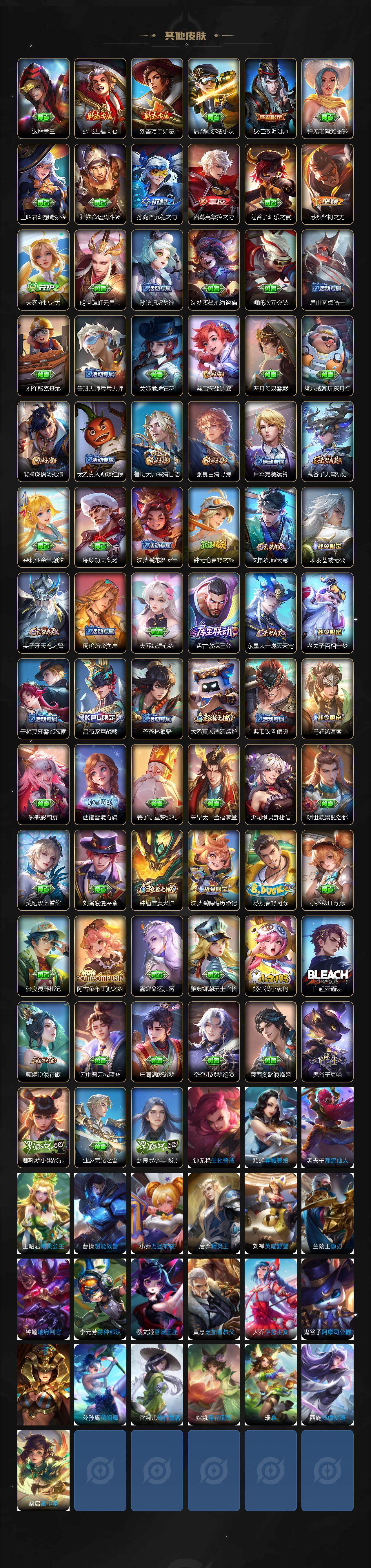 【其他皮肤】:项羽海滩派对,韩信教廷特使,露娜哥特玫瑰,赵云忍炎影,白起白色死神,牛魔西部大镖客,扁鹊救世之瞳,安琪拉玩偶对对碰,孙膑天使之翼,妲己少女阿狸,典韦黄金武士,亚瑟死亡骑士,达摩拳王,张飞五福同心,刘备万事如意,后羿阿尔法小队,狄仁杰阴阳师,钟无艳海滩丽影,王昭君幻想奇妙夜,狂铁命运角斗场,孙尚香沉稳之力,诸葛亮掌控之力,鬼谷子幻乐之宴,苏烈坚韧之力,大乔守护之力,明世隐虹云星官,孙膑归虚梦演,沈梦溪鲨炮海盗猫,哪吒次元突破,盾山圆桌骑士,刘禅秘密基地,鲁班大师乓乓大师,戈娅危途狂花,桑启海盐诗旅,海月幻泉雾影,猪八戒潮玩探月行,裴擒虎擒涛扼浪,太乙真人劲辣红锅,鲁班大师探海日志,张良古海寻踪,后羿完美运算,鬼谷子天穹祈灯,朵莉亚金色潮汐,廉颇功夫炙烤,沈梦溪龙舞盛年,钟无艳春野之旅,刘邦剑