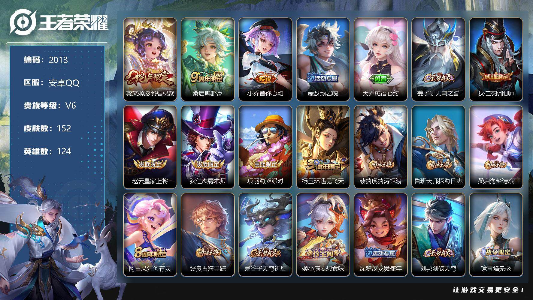 [12689278]安卓Q-V5-永恒钻石I段位-124英雄-152皮肤-0典藏-0珍品无双-0无双-0珍品传说-3传说-40史诗 【英雄全皮】:空空儿全皮,影全皮 【传说皮肤】:蔡文姬愿照福禄聚,桑启鸣野蒿,小乔音你心动 【限定皮肤】:蒙犽顽岩魄,大乔绒语心约,姜子牙天穹之誓,狄仁杰阴阳师,赵云皇家上将,狄仁杰魔术师,项羽海滩派对,杨玉环遇见飞天,裴擒虎擒涛扼浪,鲁班大师探海日志,桑启海盐诗旅,阿古朵江河有灵,张良古海寻踪,鬼谷子天穹祈灯,姬小满妄想食味,沈梦溪龙舞盛年,刘邦剑破天穹,镜青焰无极,项羽苍威无极,周瑜熔金海岸 【赛季限定】:张良古海寻踪,裴擒虎擒涛扼浪,鲁班大师探海日志,桑启海盐诗旅,鬼谷子天穹祈灯,刘邦剑破天穹,姜子牙天穹之誓 【战令限定】:镜青焰无极,项羽苍威无极 【史诗皮肤】:露娜紫霞仙子,赵云皇家上将,貂蝉圣诞恋歌,甄姬冰雪圆舞曲,狄仁杰魔术师,宫本武藏鬼剑武藏,孙尚香水果甜心,嬴政摇滚巨星,妲己魅力维加斯,妲己女仆咖啡,曹操幽灵船长,花木兰水晶猎龙者,夏侯惇乘风破浪,小乔缤纷独角兽,兰陵王暗隐猎兽者,亚瑟心灵战警,雅典娜冰冠公主,百里守约特工魅影,蔡文姬舞动绿茵,李元芳逐浪之夏,杨玉环遇见飞天,孙策猫狗日记,狄仁杰鹰眼统帅,瑶遇见神鹿,西施诗语江南,钟馗乐园奇幻夜,阿古朵江河有灵,姬小满妄想食味,镜青焰无极,蒙犽顽岩魄,艾琳陌上桑,百里守约百相守梦,孙膑茶境仙,赵怀真器灵浮梦炉,阿轲化蝶舞,刘禅鸭鸭历险记,狂铁龙之律动,黄忠百相守梦,西施织梦人,女娲万灵启世 【其他皮肤】:项羽海滩派对,韩信教廷特使,露娜哥特玫瑰,赵云忍炎影,白起白色死神,牛魔西部大镖客,扁鹊救世之瞳,安琪拉玩偶对对碰,孙膑天使之翼,妲己少女阿狸,典韦黄金武士,亚瑟死亡骑士,达摩拳王,张飞五福同心,刘备万事如意,后羿阿尔法小队,狄仁杰阴阳师,钟无艳海滩丽影,王昭君幻想奇妙夜,狂铁命运角斗场,孙尚香沉稳之力,诸葛亮掌控之力,鬼谷子幻乐之宴,苏烈坚韧之力,大乔守护之力,明世隐虹云星官,孙膑归虚梦演,沈梦溪鲨炮海盗猫,哪吒次元突破,盾山圆桌骑士,刘禅秘密基地,鲁班大师乓乓大师,戈娅危途狂花,桑启海盐诗旅,海月幻泉雾影,猪八戒潮玩探月行,裴擒虎擒涛扼浪,太乙真人劲辣红锅,鲁班大师探海日志,张良古海寻踪,后羿完美运算,鬼谷子天穹祈灯,朵莉亚金色潮汐,廉颇功夫炙烤,沈梦溪龙舞盛年,钟无艳春野之旅,刘邦剑