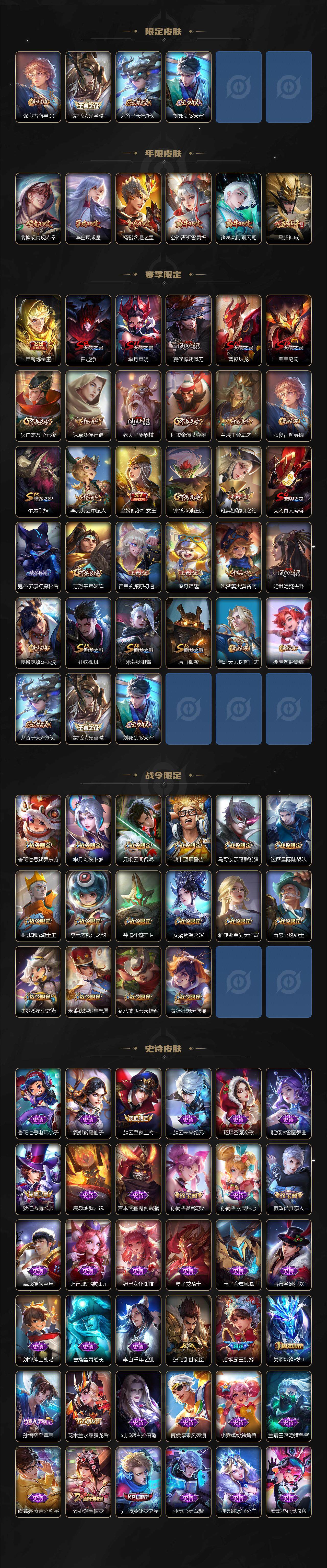 【限定皮肤】:白起狰,狄仁杰阴阳师,虞姬凯尔特女王,赵云皇家上将,嬴政优雅恋人,孙尚香蔷薇恋人,鲁班七号狮舞东方,庄周高山流水,高渐离死亡摇滚,扁鹊炼金王,芈月重明,芈月幻夜卜梦,元歌云间偶戏,夏侯惇朔风刀,甄姬游园惊梦,曹操烛龙,曹操天狼征服者,典韦穷奇,典韦蓝屏警告,马可波罗逐梦之星,马可波罗暗影游猎,狄仁杰魔术师,狄仁杰万华元夜,达摩星际陆战队,达摩沙漠行僧,项羽海滩派对,老夫子醍醐杖,关羽冰锋战神,程咬金演武夺筹,兰陵王金庭之子,花木兰青春决赛季,亚瑟潮玩骑士王,孙悟空至尊宝,牛魔御旌,李元芳银河之约,李元芳云中旅人,虞姬霸王别姬,虞姬启明星使,钟馗神迹守卫,钟馗驱傩正仪,杨玉环遇见飞天,杨戬永曜之星,女娲朔望之晖,哪吒逐梦之翼,雅典娜单词大作战,雅典娜黎明之约,蔡文姬繁星吟游,太乙真人饕餮,太乙真人华丽摇滚,鬼谷子原初探秘者,鬼谷子五谷丰年,诸葛亮时雨天司,黄忠火炮绅士,苏烈千军破阵,百里玄策原初追逐者,弈星混沌棋,梦奇顽趣,公孙离祈雪灵祝,沈梦溪星空之诺,沈梦溪大漠名商,明世隐疑决卦,裴擒虎天狼狩猎者,裴擒虎李小龙,裴擒虎寅虎赤拳,裴擒虎擒涛扼浪,狂铁御狮,米莱狄御霄,米莱狄胡桃异想国,云中君纤云弄巧,盾山御銮,猪八戒西部大镖客,上官婉儿梁祝,嫦娥拒霜思,蒙犽狂想玩偶喵,鲁班大师探海日志,镜匿光追影者,桑启海盐诗旅,艾琳女武神,张良古海寻踪,蒙恬荣光圣徽,鬼谷子天穹祈灯,刘邦剑破天穹