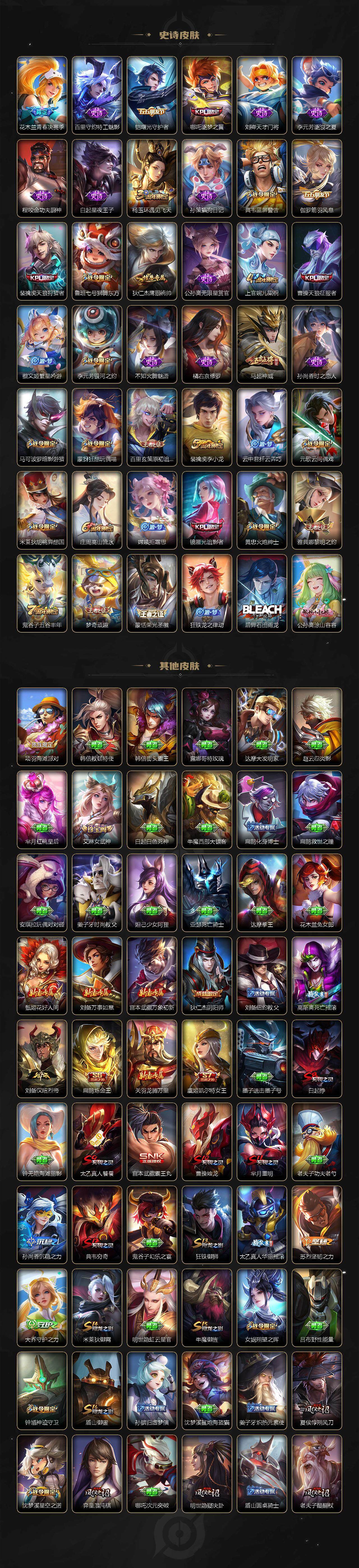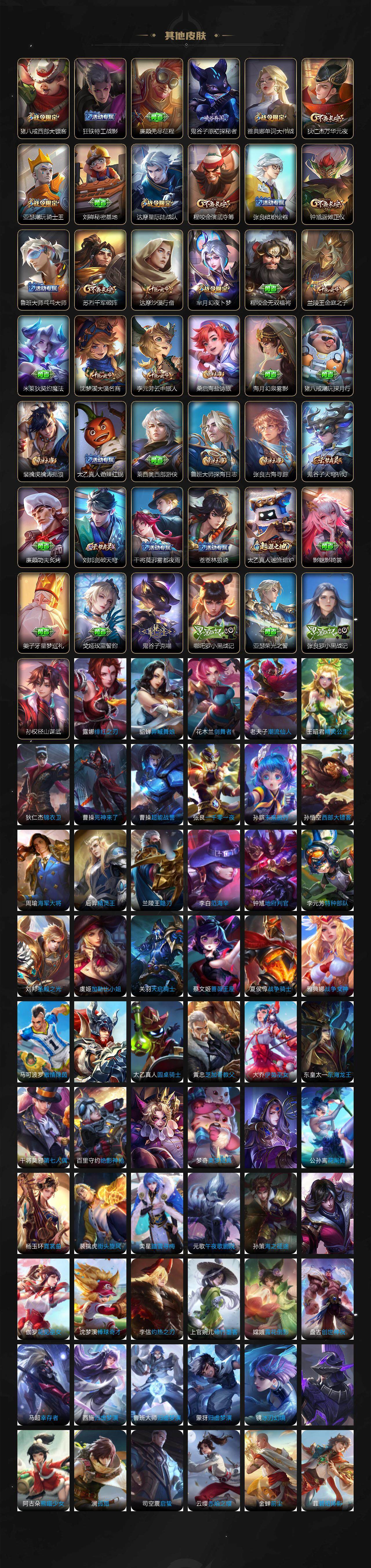 扁鹊炼金王,虞姬凯尔特女王,白起狰,太乙真人饕餮,曹操烛龙,芈月重明,典韦穷奇,狂铁御狮,米莱狄御霄,牛魔御旌,盾山御銮,夏侯惇朔风刀,明世隐疑决卦,老夫子醍醐杖,鬼谷子原初探秘者,狄仁杰万华元夜,程咬金演武夺筹,钟馗驱傩正仪,苏烈千军破阵,女娲朔望之晖,典韦蓝屏警告,钟馗神迹守卫,鲁班七号狮舞东方,沈梦溪星空之诺,李元芳银河之约,马可波罗暗影游猎,蒙犽狂想玩偶喵,元歌云间偶戏,弈星混沌棋,达摩沙漠行僧,兰陵王金庭之子,沈梦溪大漠名商,李元芳云中旅人,桑启海盐诗旅,裴擒虎擒涛扼浪,鲁班大师探海日志,张良古海寻踪
