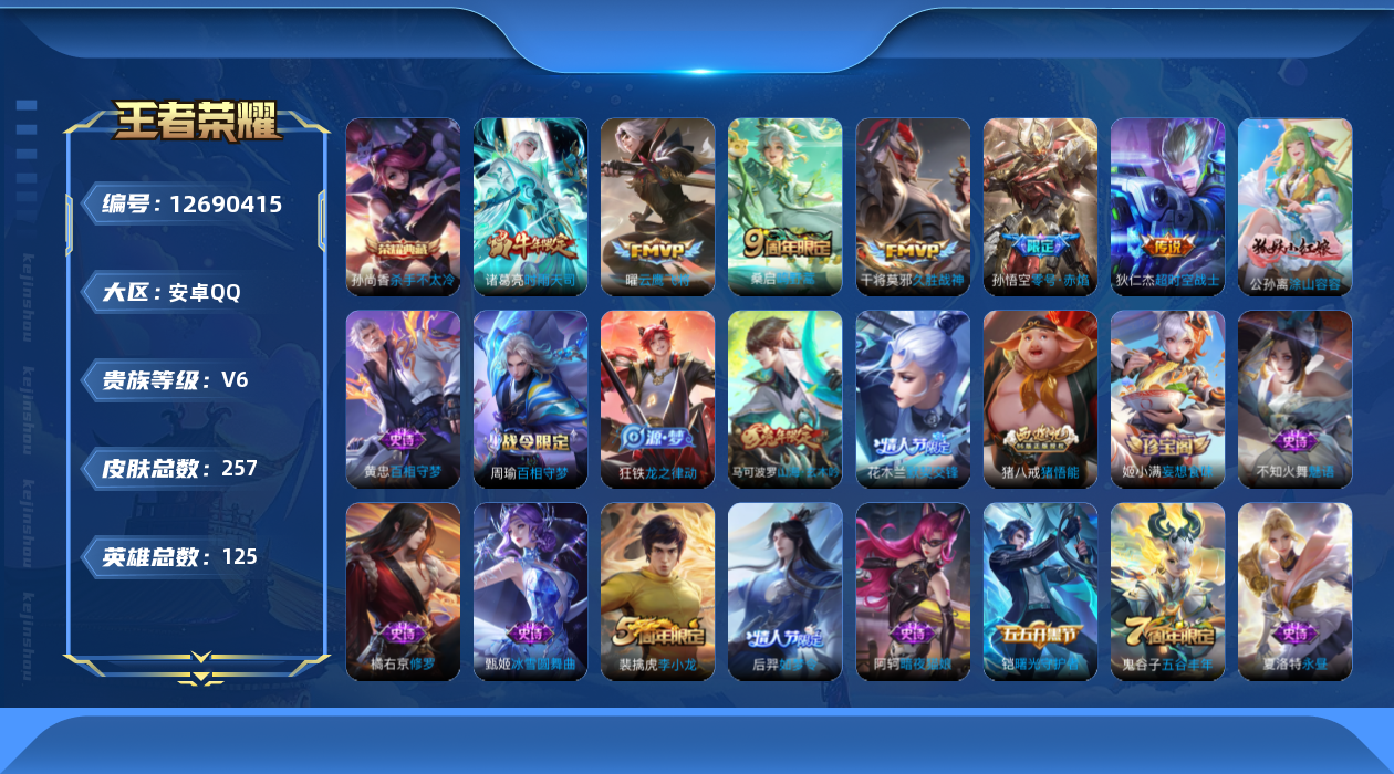 [12690415]安卓Q-V6-最强王者段位-125英雄-257皮肤-1典藏-0珍品无双-0无双-0珍品传说-6传说-74史诗