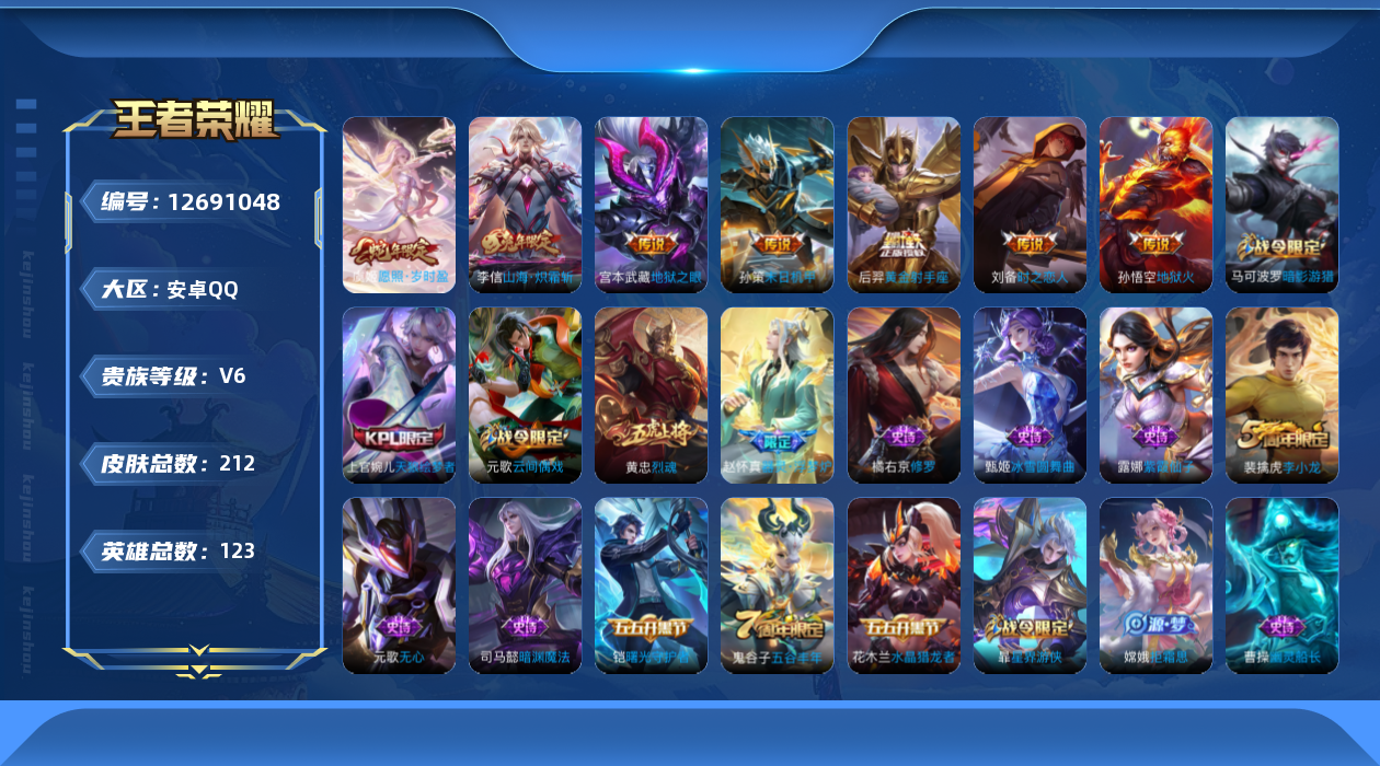 [12691048]安卓Q-V6-至尊星耀V段位-123英雄-212皮肤-0典藏-0珍品无双-0无双-0珍品传说-7传说-57史诗