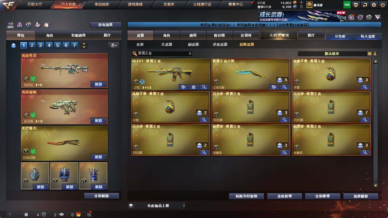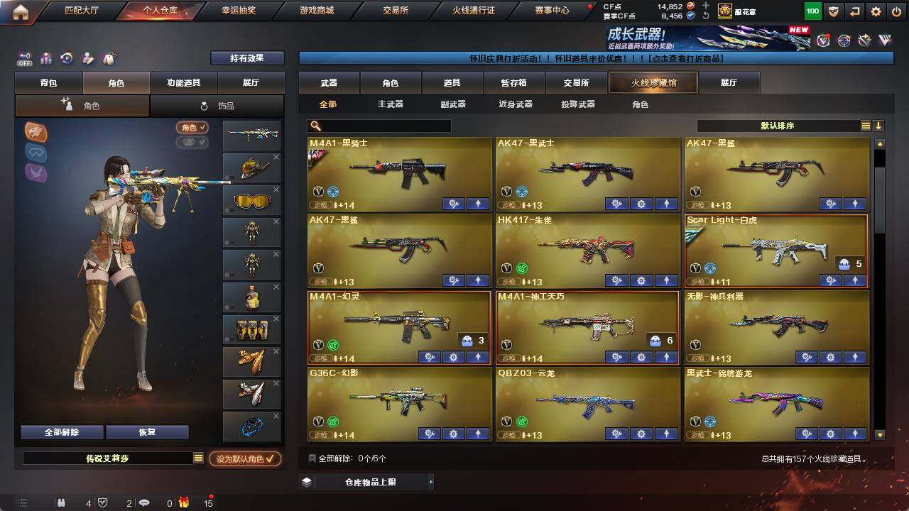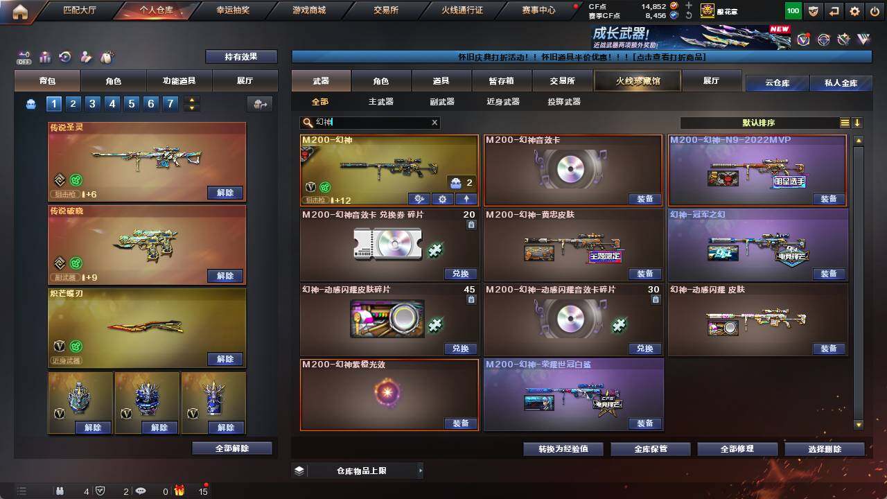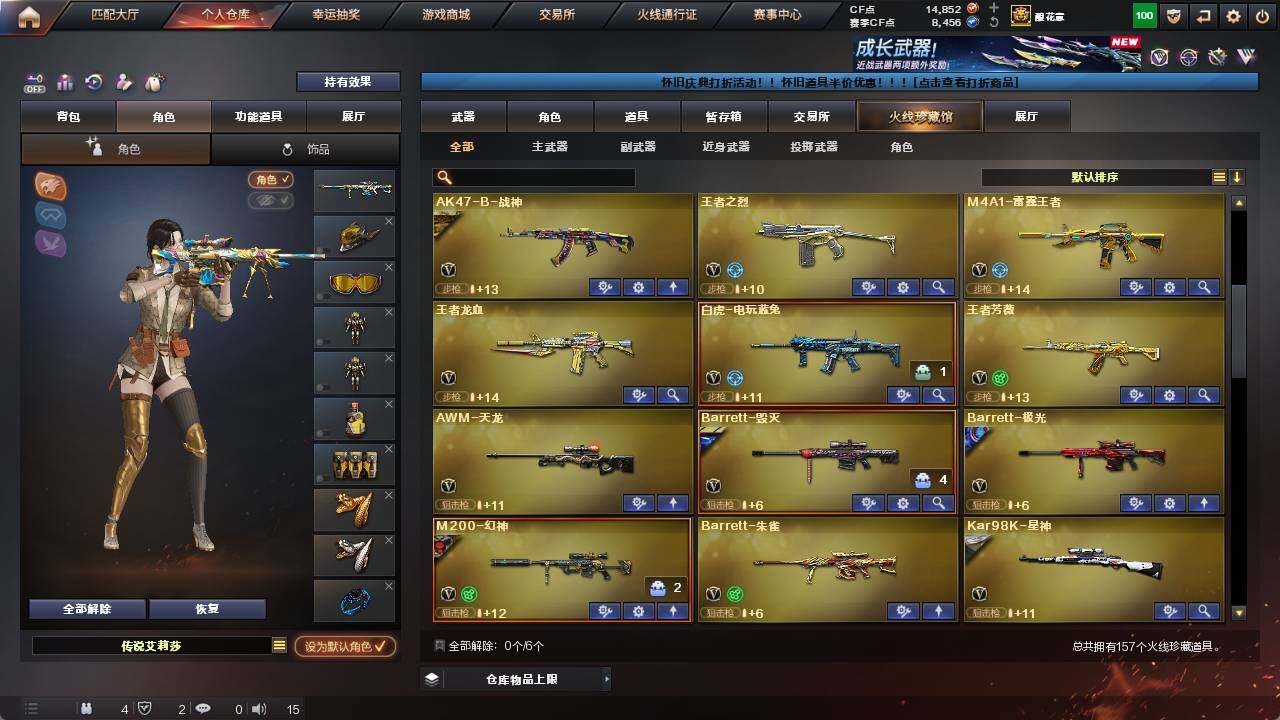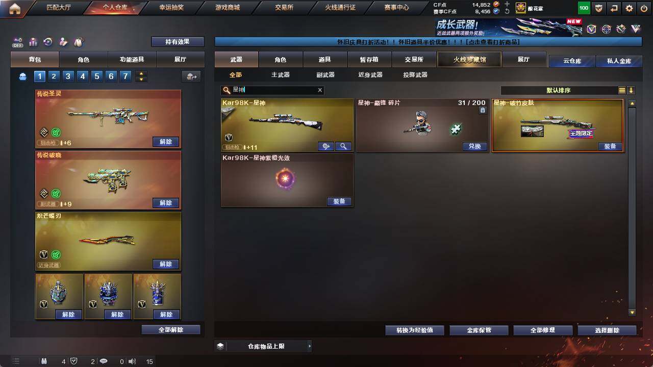 【热门武器】:传说圣灵,传说破晓,G36C-幻影,QBZ03-金色蔷薇,Scar Light-白虎,HK417-朱雀,M200-幻神,白虎-电玩蓝兔,柯尔特-冠军之特,Kar98K-星神,Cat-刀锋,M4A1-黑骑士*2,汤姆逊-烈龙*6,加特林-炼狱*2,羊驼玩偶*2,雷神-小红,毁灭-孙三炮,裁决-雪莉杨,COP-白鲨,COP 357-幻灵*3,沙鹰-修罗*3,Knife-冠军之刃,炽芒蝶刃,金刚伞