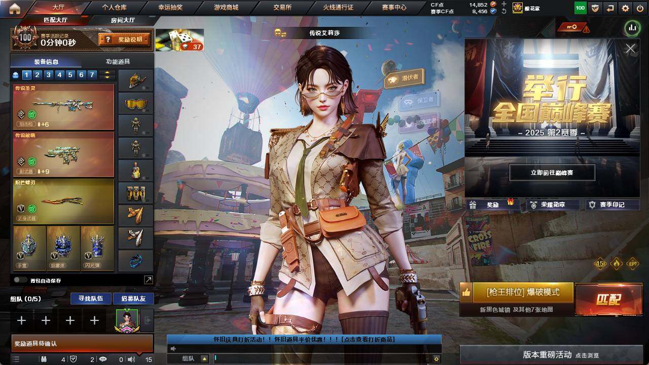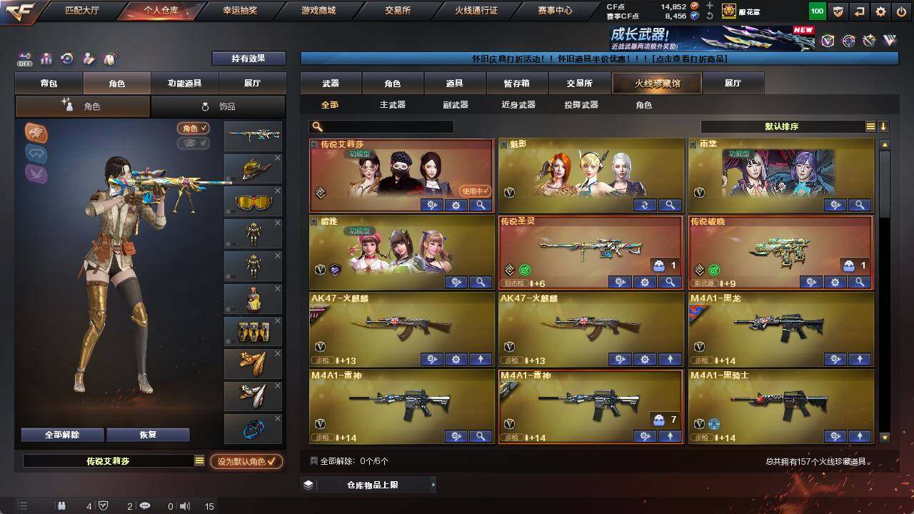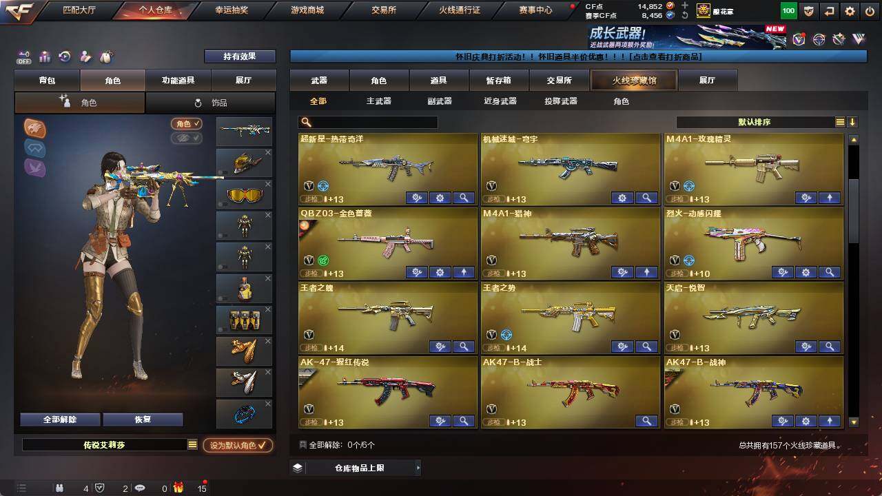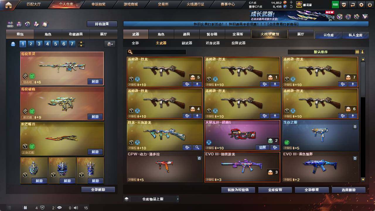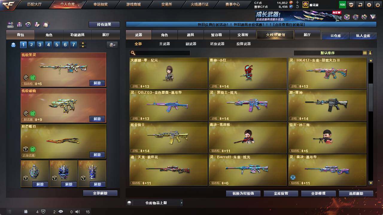 【热门武器】:传说圣灵,传说破晓,G36C-幻影,QBZ03-金色蔷薇,Scar Light-白虎,HK417-朱雀,M200-幻神,白虎-电玩蓝兔,柯尔特-冠军之特,Kar98K-星神,Cat-刀锋,M4A1-黑骑士*2,汤姆逊-烈龙*6,加特林-炼狱*2,羊驼玩偶*2,雷神-小红,毁灭-孙三炮,裁决-雪莉杨,COP-白鲨,COP 357-幻灵*3,沙鹰-修罗*3,Knife-冠军之刃,炽芒蝶刃,金刚伞