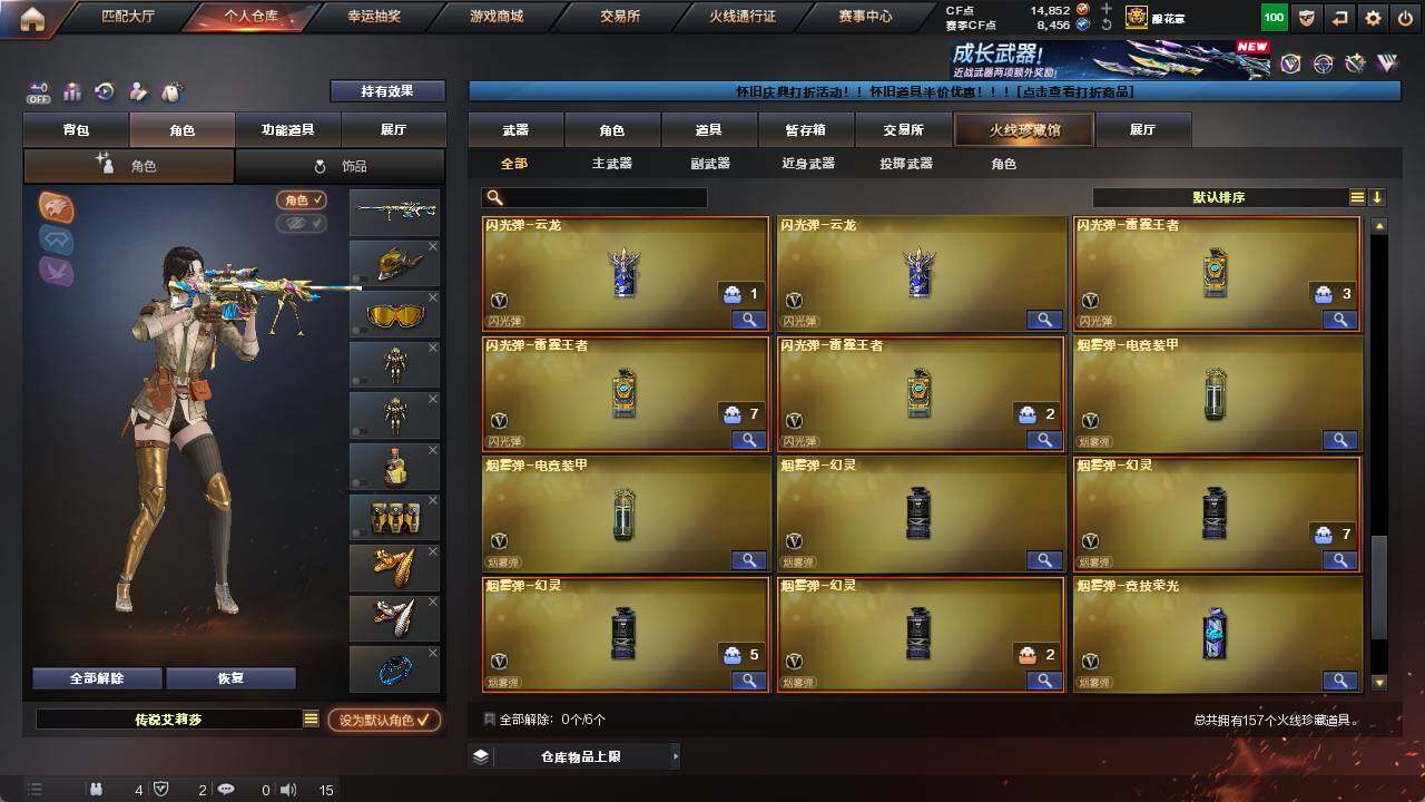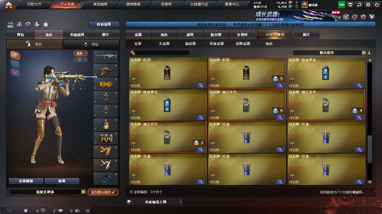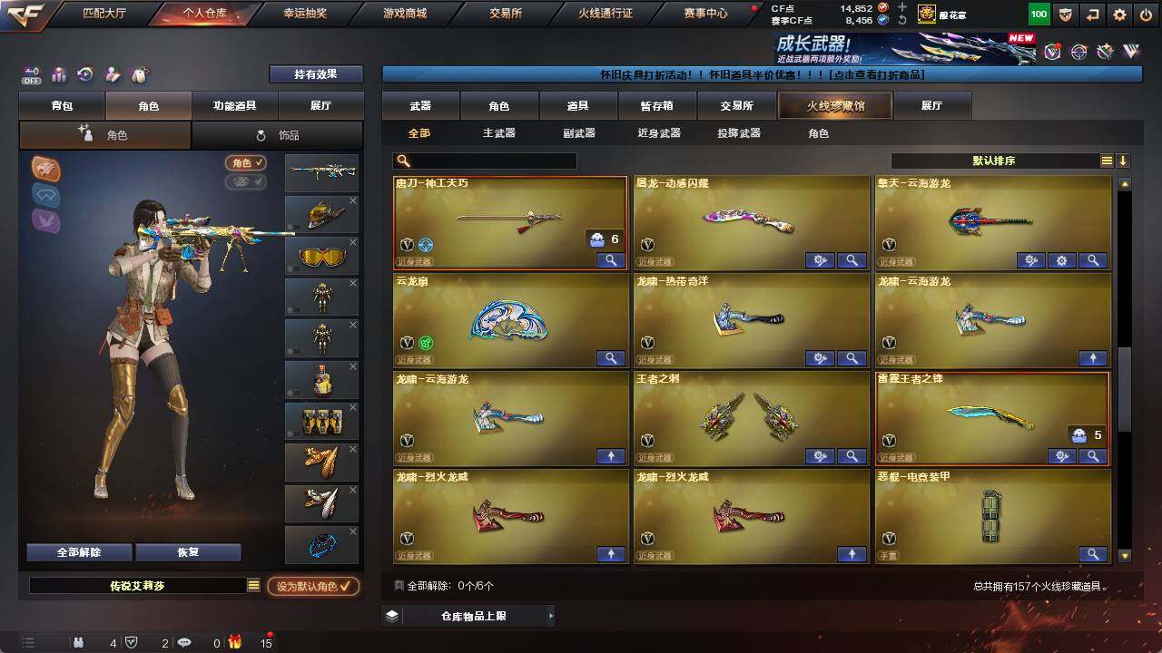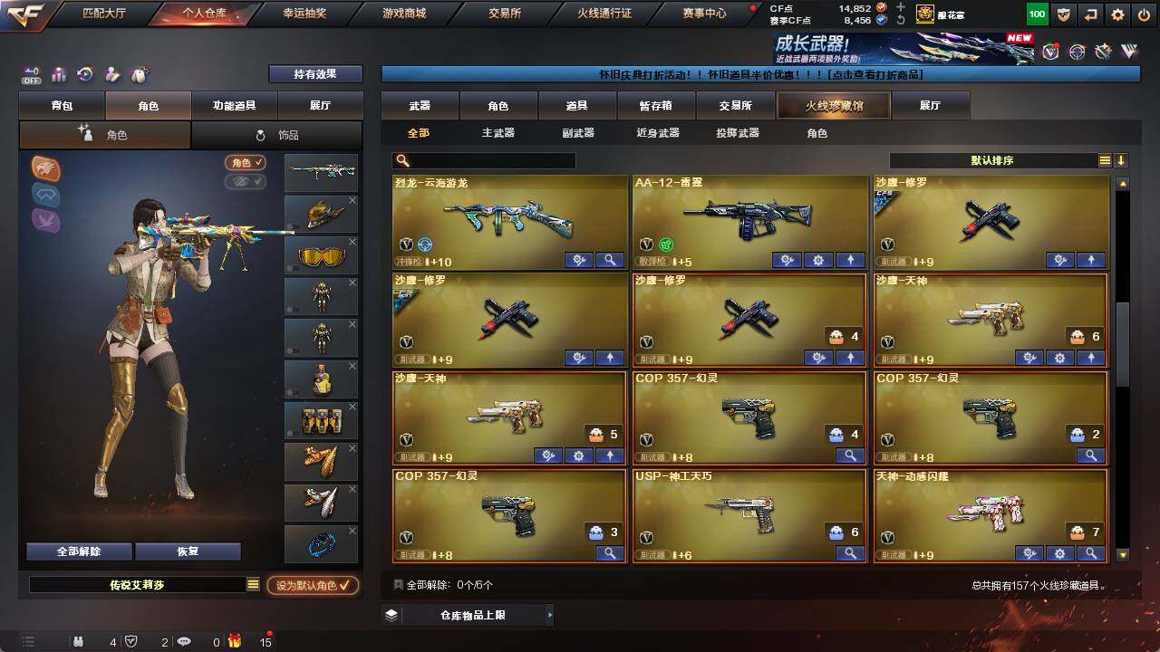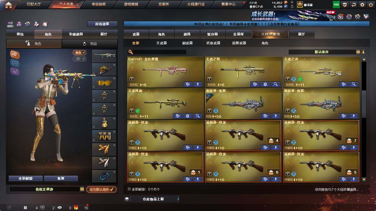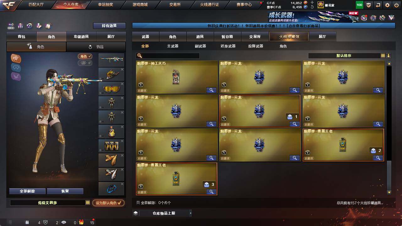 【人偶武器】:雷神-小红,COP-白鲨,毁灭-孙三炮,裁决-雪莉杨,巴雷特-零-水下丽影,AWM-灵狐-15周年嘉年华,M4A1-雷神-精英刀锋,Cat-刀锋,黄金迷你深渊冰龙*2,迷你深渊冰龙,迷你超能女侍,迷你波特博士,迷你牛牛,闪光弹-小乔