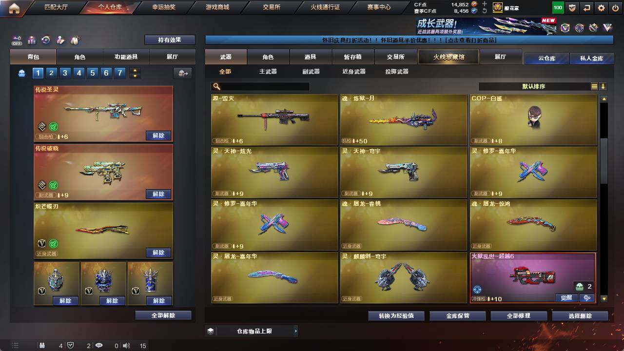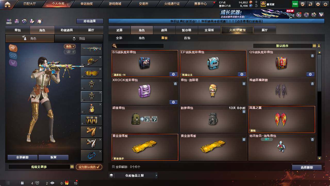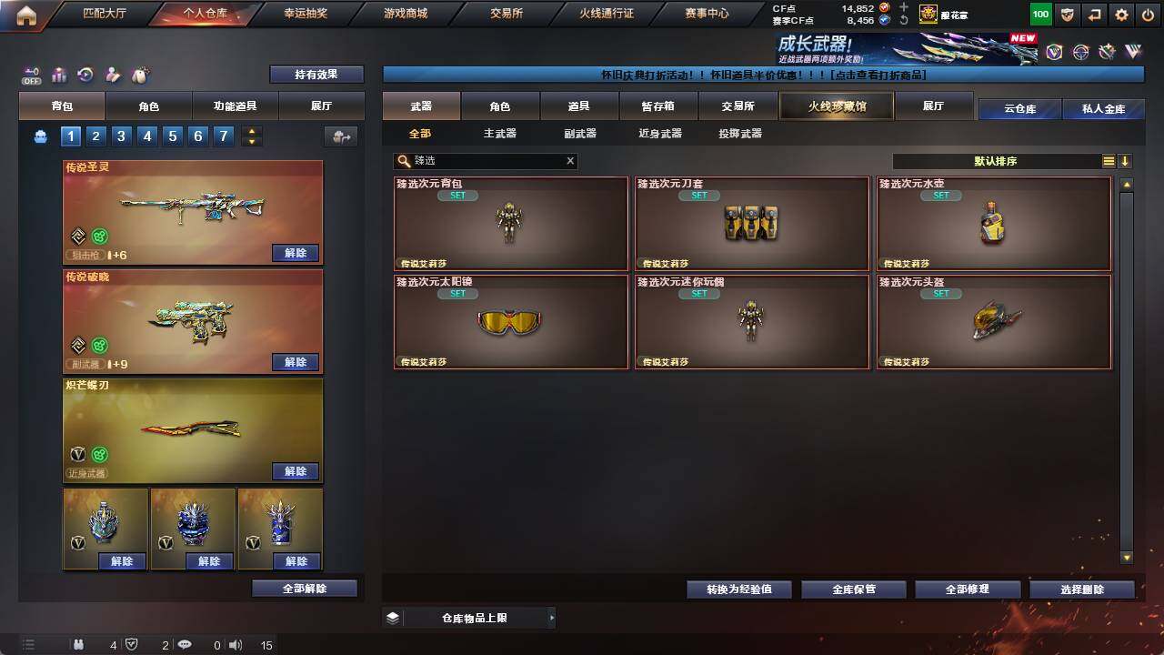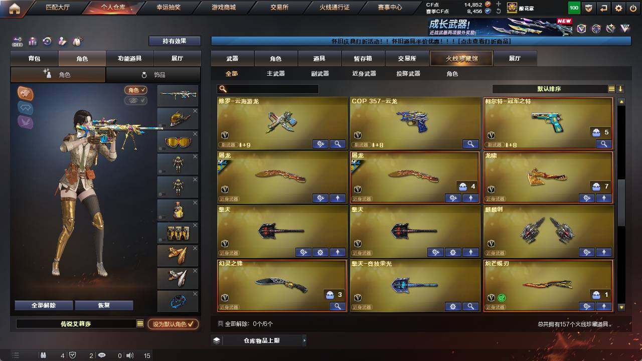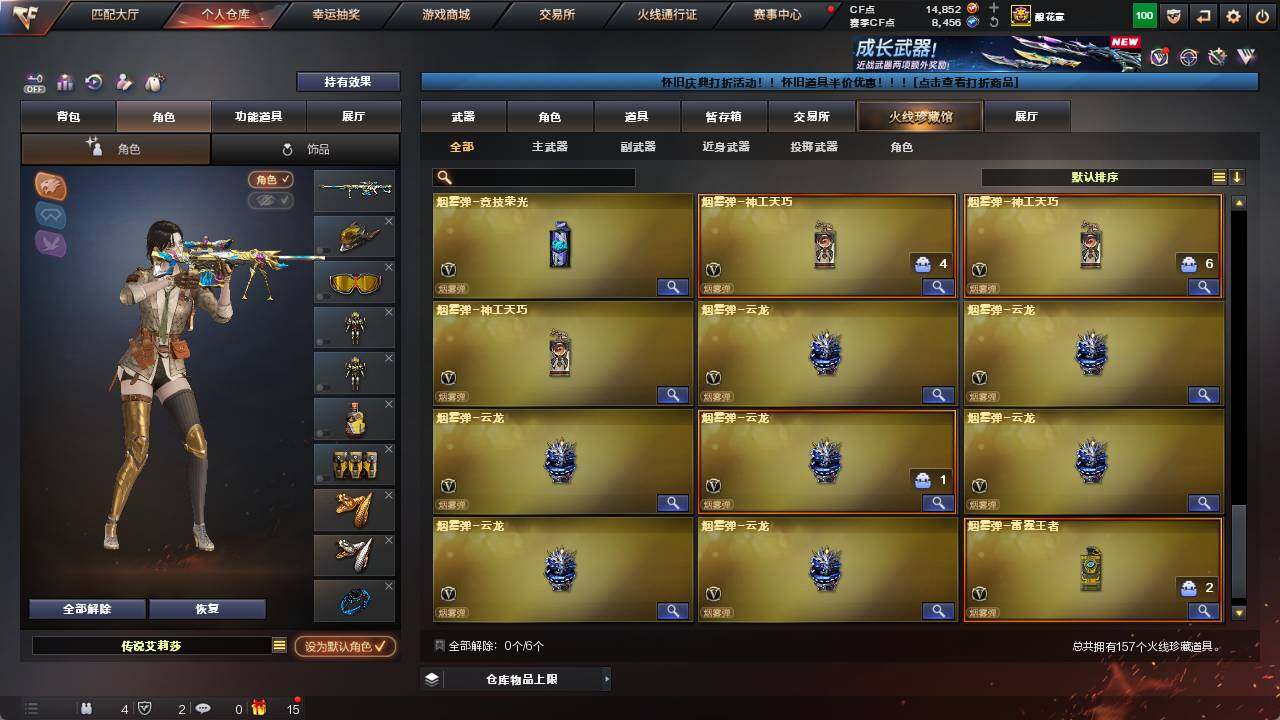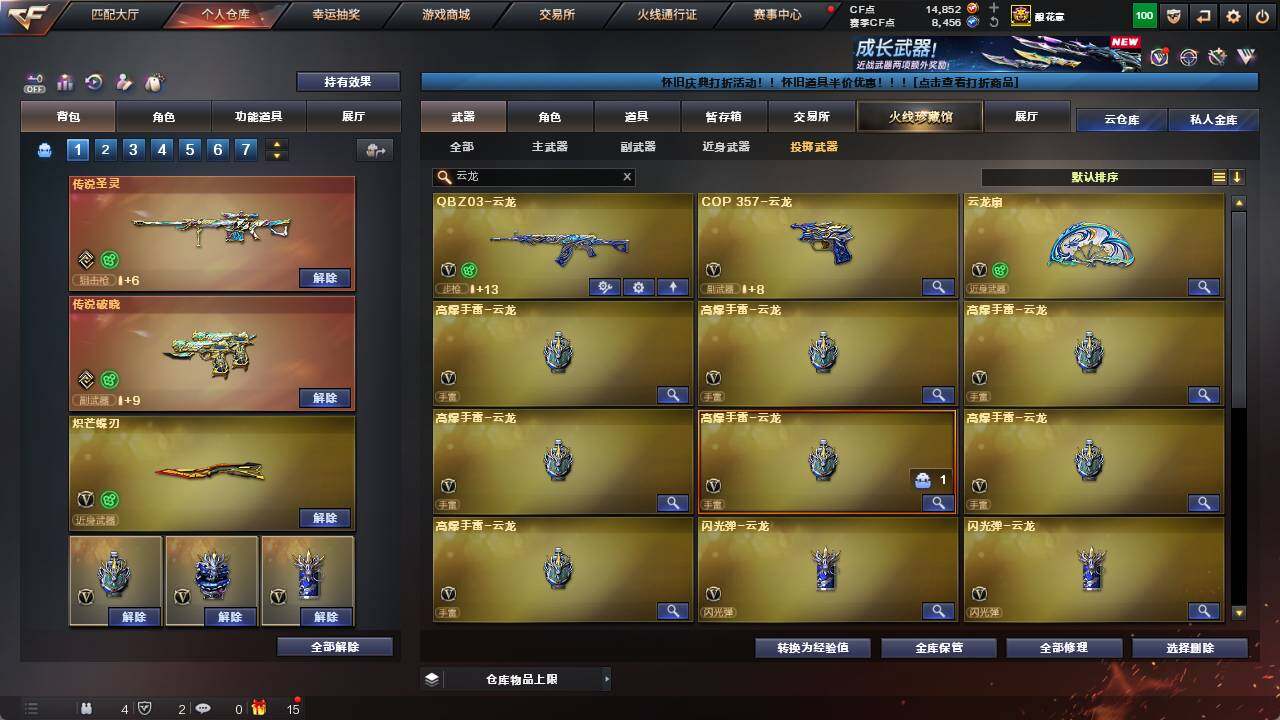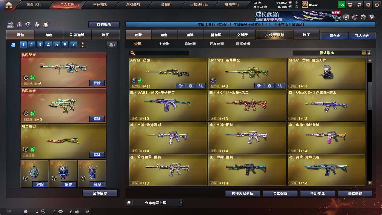 【人偶武器】:雷神-小红,COP-白鲨,毁灭-孙三炮,裁决-雪莉杨,巴雷特-零-水下丽影,AWM-灵狐-15周年嘉年华,M4A1-雷神-精英刀锋,Cat-刀锋,黄金迷你深渊冰龙*2,迷你深渊冰龙,迷你超能女侍,迷你波特博士,迷你牛牛,闪光弹-小乔