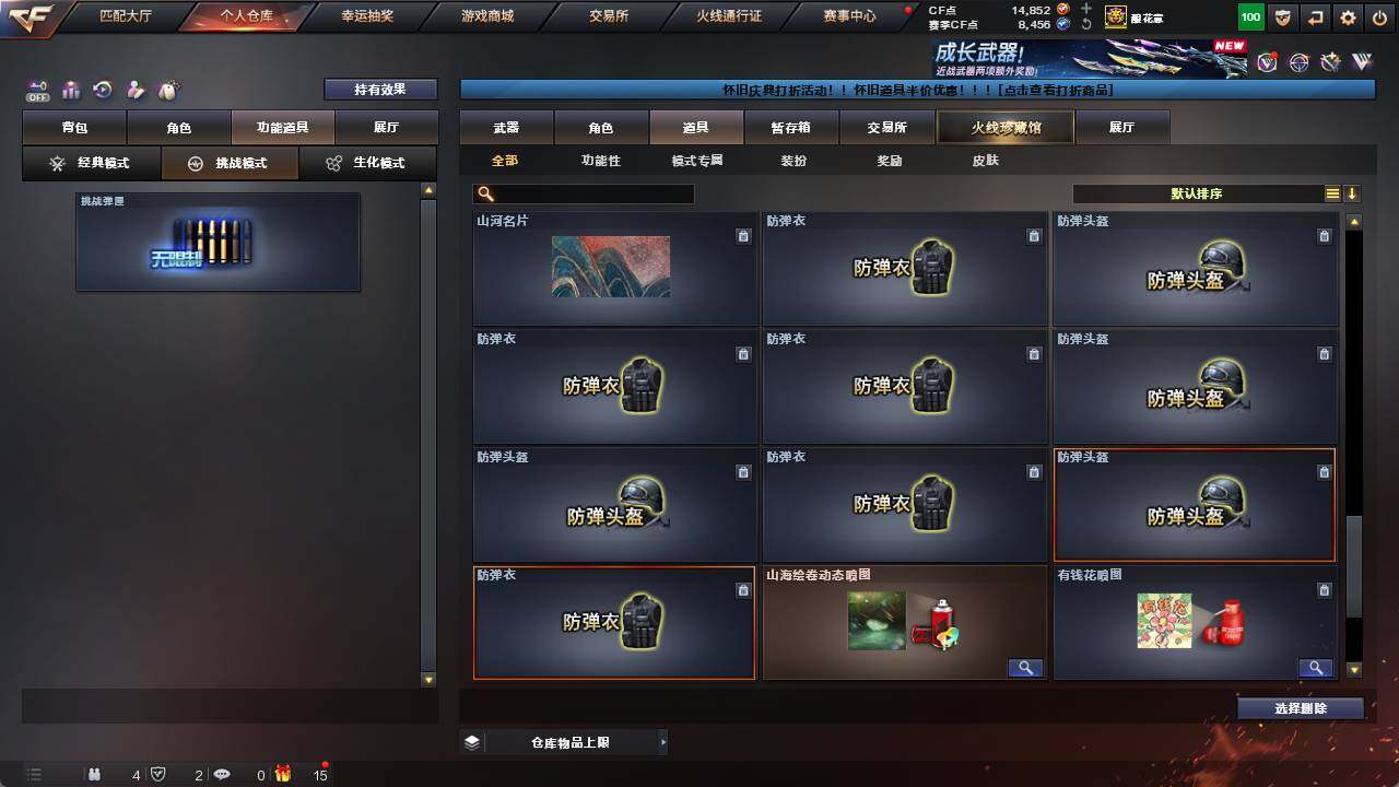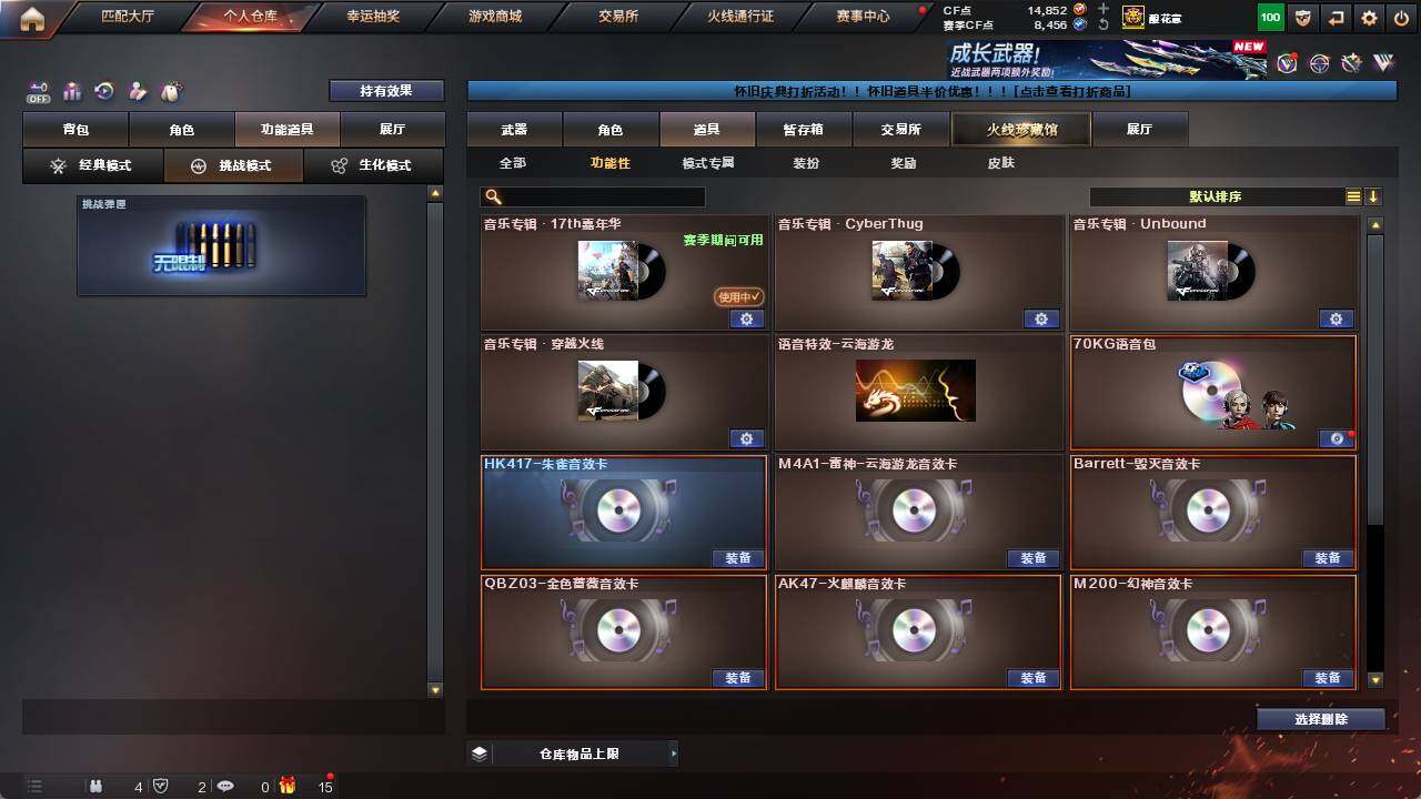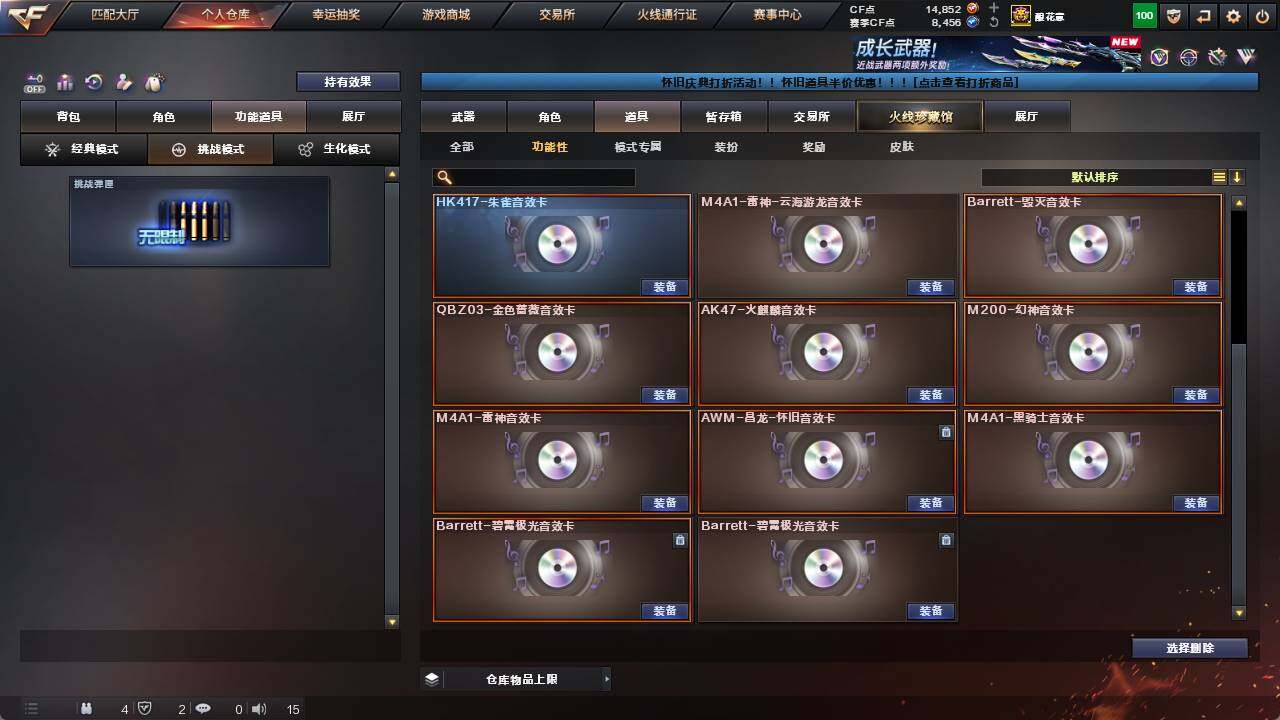 【音效卡】:M200-幻神音效卡,AK47-火麒麟音效卡,M4A1-雷神音效卡,M4A1-雷神-云海游龙音效卡,M4A1-黑骑士音效卡,Barrett-毁灭音效卡,QBZ03-金色蔷薇音效卡,HK417-朱雀音效卡,70KG语音包