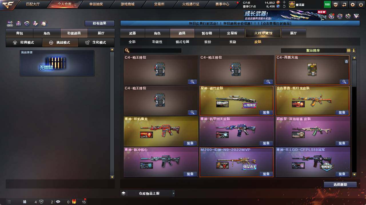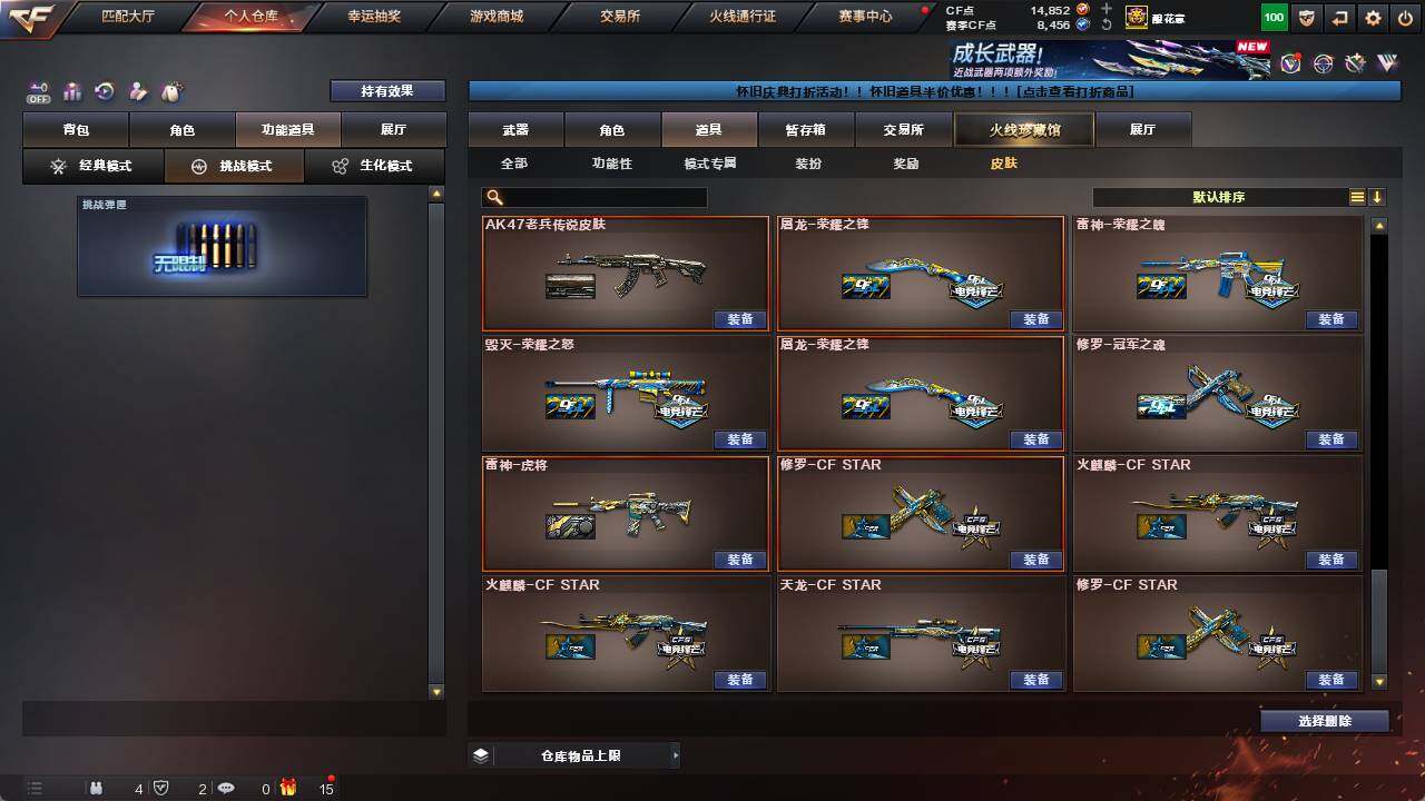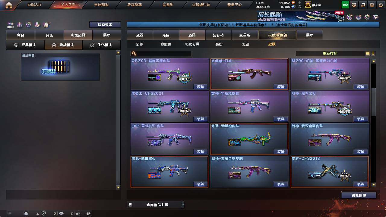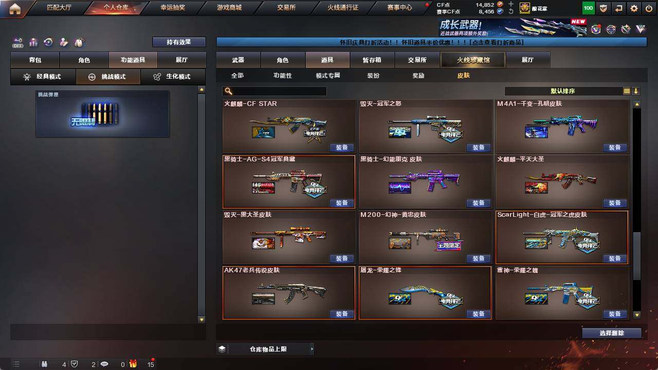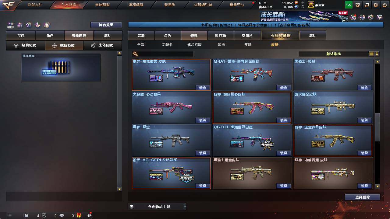 【稀有皮肤】:M200-幻神-黄忠皮肤,幻神-冠军之幻,M200-幻神-荣耀世冠白鲨,M200-幻神-N9-2022MVP,幻神-动感闪耀 皮肤,星神-破竹皮肤,ScarLight-白虎-冠军之虎皮肤,QBZ03-荣耀世冠白鲨,QBZ03-巅峰荣耀皮肤,雷神-荣耀之魄,雷神-星空,雷神-虎将,雷神-R.LGD-CFPLS18冠军,雷神-脉冲核心,雷神-炽焰魔龙,火麒麟-平天大圣,火麒麟-百城,火麒麟-心动糖果,黑骑士-暗月,黑骑士-CFS2021,黑骑士-AG-S4冠军典藏,毁灭-荣耀之怒,毁灭耀金皮肤,毁灭-冠军之怒,毁灭-黑大圣皮肤,极光-高能霹雳 皮肤,修罗-冠军之魂,屠龙-荣耀之锋*2