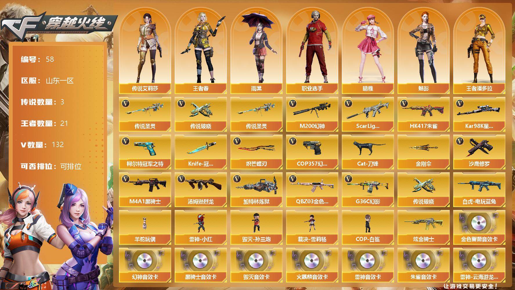 [12691301]山东一区-132V-21王者-1炫金 【传说武器】:传说圣灵,传说破晓 【传说角色】:传说艾莉莎 【热门武器】:传说圣灵,传说破晓,G36C-幻影,QBZ03-金色蔷薇,Scar Light-白虎,HK417-朱雀,M200-幻神,白虎-电玩蓝兔,柯尔特-冠军之特,Kar98K-星神,Cat-刀锋,M4A1-黑骑士*2,汤姆逊-烈龙*6,加特林-炼狱*2,羊驼玩偶*2,雷神-小红,毁灭-孙三炮,裁决-雪莉杨,COP-白鲨,COP 357-幻灵*3,沙鹰-修罗*3,Knife-冠军之刃,炽芒蝶刃,金刚伞 【王者炫金武器】:炫金骑士 【音效卡】:M200-幻神音效卡,AK47-火麒麟音效卡,M4A1-雷神音效卡,M4A1-雷神-云海游龙音效卡,M4A1-黑骑士音效卡,Barrett-毁灭音效卡,QBZ03-金色蔷薇音效卡,HK417-朱雀音效卡,70KG语音包 【稀有皮肤】:M200-幻神-黄忠皮肤,幻神-冠军之幻,M200-幻神-荣耀世冠白鲨,M200-幻神-N9-2022MVP,幻神-动感闪耀 皮肤,星神-破竹皮肤,ScarLight-白虎-冠军之虎皮肤,QBZ03-荣耀世冠白鲨,QBZ03-巅峰荣耀皮肤,雷神-荣耀之魄,雷神-星空,雷神-虎将,雷神-R.LGD-CFPLS18冠军,雷神-脉冲核心,雷神-炽焰魔龙,火麒麟-平天大圣,火麒麟-百城,火麒麟-心动糖果,黑骑士-暗月,黑骑士-CFS2021,黑骑士-AG-S4冠军典藏,毁灭-荣耀之怒,毁灭耀金皮肤,毁灭-冠军之怒,毁灭-黑大圣皮肤,极光-高能霹雳 皮肤,修罗-冠军之魂,屠龙-荣耀之锋*2 【角色】:传说艾莉莎,王者春,王者潘多拉,灵狐者-职业经理,魅影,幽,雨棠,晴雅,战地猎狐,铁骑荣耀,职业选手 【人偶武器】:雷神-小红,COP-白鲨,毁灭-孙三炮,裁决-雪莉杨,巴雷特-零-水下丽影,AWM-灵狐-15周年嘉年华,M4A1-雷神-精英刀锋,Cat-刀锋,黄金迷你深渊冰龙*2,迷你深渊冰龙,迷你超能女侍,迷你波特博士,迷你牛牛,闪光弹-小乔 【暴走生化】:黑龙吞噬者,超级对讲机 【挑战大师】:神圣爆裂者-末日III,试炼破坏者III,激光毁灭者III-白马银枪,冰龙粉碎者-白马银枪 【英雄级武器】:QBZ03-云龙,COP 357-云龙,M4A1-神工天巧,USP-神工天巧,唐刀-神工天巧,擎天-竞技荣光