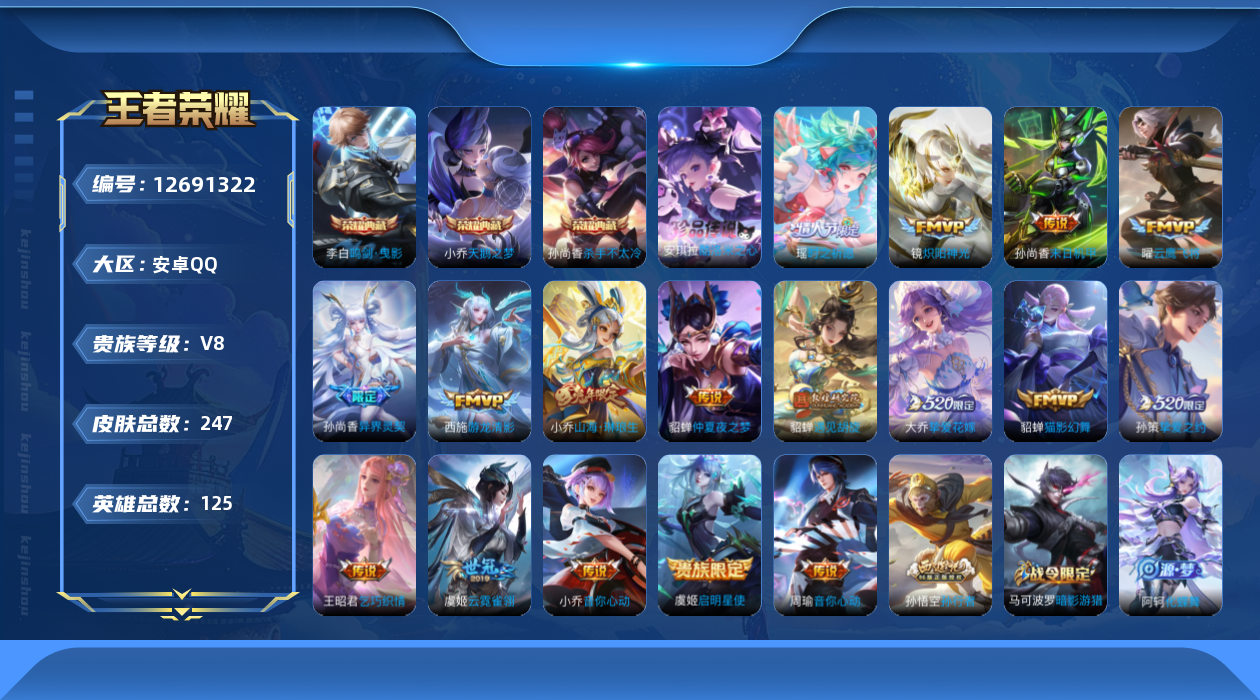 [12691322]安卓Q-V5-荣耀黄金IV段位-125英雄-247皮肤-3典藏-0珍品无双-0无双-1珍品传说-17传说-71史诗