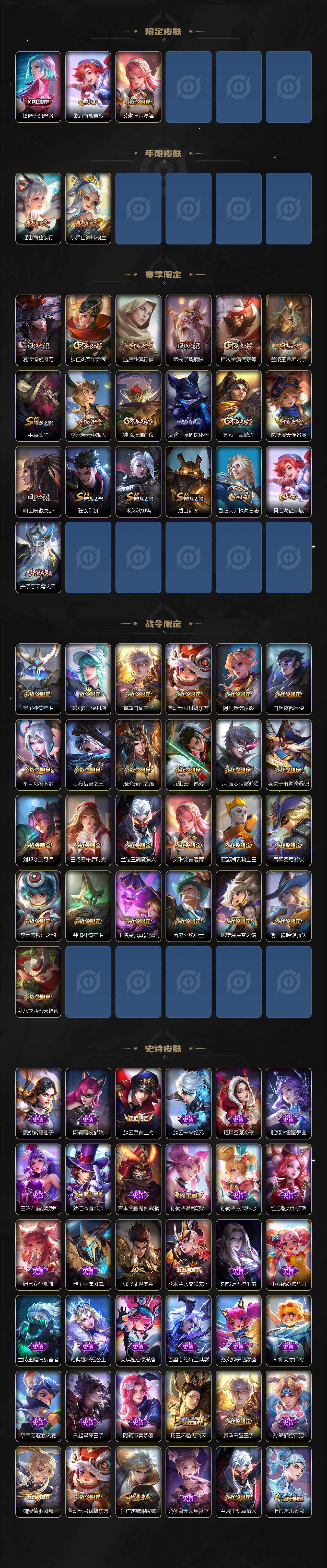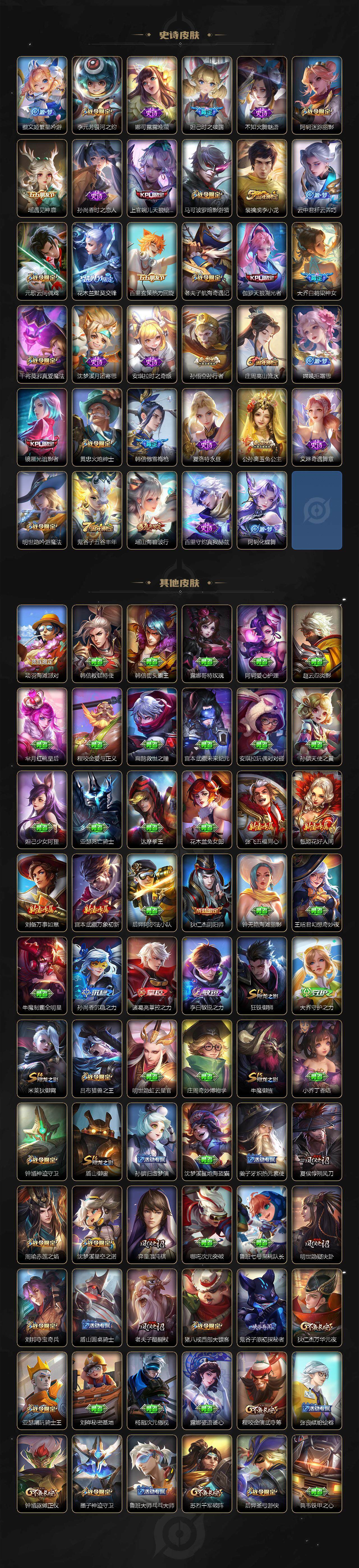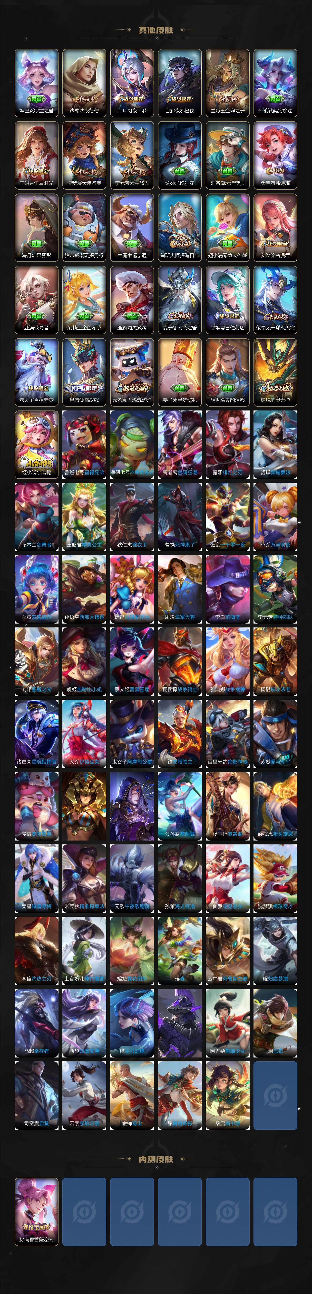 【限定皮肤】:虞姬夏日便利店,姜子牙天穹之誓,狄仁杰阴阳师,小乔山海琳琅生,赵云皇家上将,墨子神迹守卫,妲己时之彼端,嬴政白昼王子,孙尚香蔷薇恋人,孙尚香异界灵契,鲁班七号狮舞东方,庄周高山流水,阿轲迷踪丽影,白起夜都怪侠,芈月幻夜卜梦,吕布猎兽之王,周瑜赤莲之焰,元歌云间偶戏,夏侯惇朔风刀,马可波罗暗影游猎,狄仁杰魔术师,狄仁杰万华元夜,达摩沙漠行僧,项羽海滩派对,老夫子醍醐杖,老夫子航海奇遇记,貂蝉遇见胡旋,程咬金演武夺筹,刘邦夺宝奇兵,韩信傲雪梅枪,王昭君午后时光,兰陵王驯魔猎人,兰陵王金庭之子,花木兰默契交锋,亚瑟潮玩骑士王,孙悟空孙行者,牛魔御旌,后羿圣弓游侠,李元芳银河之约,李元芳云中旅人,虞姬启明星使,钟馗神迹守卫,钟馗驱傩正仪,杨玉环遇见飞天,干将莫邪真爱魔法,蔡文姬繁星吟游,鬼谷子原初探秘者,鬼谷子五谷丰年,大乔白鹤梁神女,大乔挚爱花嫁,黄忠火炮绅士,苏烈千军破阵,弈星混沌棋,公孙离玉兔公主,沈梦溪星空之诺,沈梦溪大漠名商,明世隐疑决卦,明世隐吟游魔法,裴擒虎李小龙,狂铁御狮,米莱狄御霄,瑶时之祈愿,瑶山海碧波行,云中君纤云弄巧,伽罗天狼溯光者,盾山御銮,孙策挚爱之约,猪八戒西部大镖客,上官婉儿梁祝,上官婉儿天狼绘梦者,嫦娥拒霜思,鲁班大师探海日志,镜匿光追影者,桑启海盐诗旅,艾琳流音漫舞
