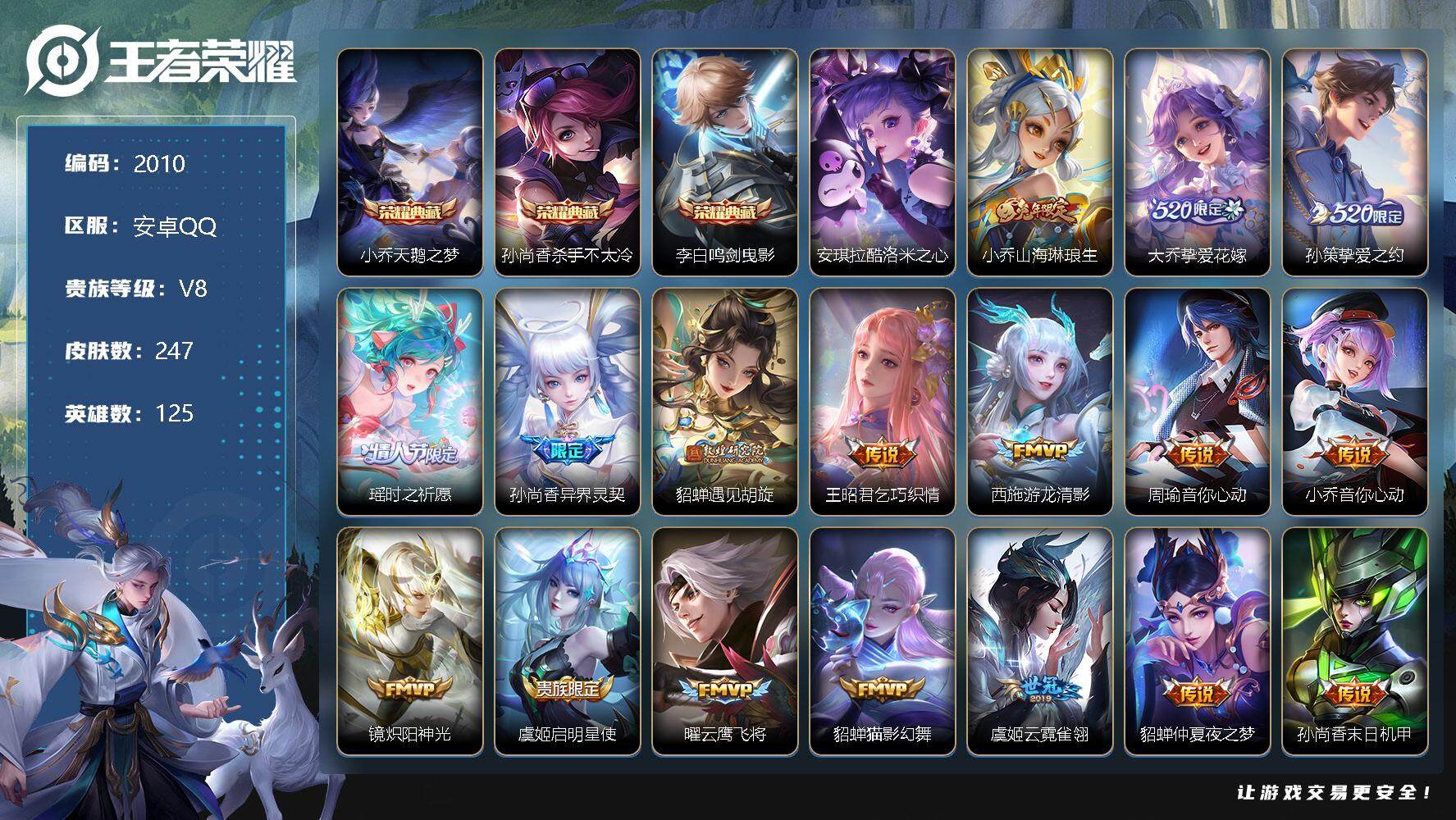 [12691322]安卓Q-V5-荣耀黄金IV段位-125英雄-247皮肤-3典藏-0珍品无双-0无双-1珍品传说-17传说-71史诗 【荣耀典藏】:小乔天鹅之梦,孙尚香杀手不太冷,李白鸣剑曳影 【珍品传说】:安琪拉酷洛米之心 【传说皮肤】:小乔山海琳琅生,大乔挚爱花嫁,孙策挚爱之约,瑶时之祈愿,孙尚香异界灵契,貂蝉遇见胡旋,王昭君乞巧织情,西施游龙清影,周瑜音你心动,小乔音你心动,镜炽阳神光,虞姬启明星使,曜云鹰飞将,貂蝉猫影幻舞,虞姬云霓雀翎,貂蝉仲夏夜之梦,孙尚香末日机甲 【限定皮肤】:虞姬夏日便利店,姜子牙天穹之誓,狄仁杰阴阳师,小乔山海琳琅生,赵云皇家上将,墨子神迹守卫,妲己时之彼端,嬴政白昼王子,孙尚香蔷薇恋人,孙尚香异界灵契,鲁班七号狮舞东方,庄周高山流水,阿轲迷踪丽影,白起夜都怪侠,芈月幻夜卜梦,吕布猎兽之王,周瑜赤莲之焰,元歌云间偶戏,夏侯惇朔风刀,马可波罗暗影游猎,狄仁杰魔术师,狄仁杰万华元夜,达摩沙漠行僧,项羽海滩派对,老夫子醍醐杖,老夫子航海奇遇记,貂蝉遇见胡旋,程咬金演武夺筹,刘邦夺宝奇兵,韩信傲雪梅枪,王昭君午后时光,兰陵王驯魔猎人,兰陵王金庭之子,花木兰默契交锋,亚瑟潮玩骑士王,孙悟空孙行者,牛魔御旌,后羿圣弓游侠,李元芳银河之约,李元芳云中旅人,虞姬启明星使,钟馗神迹守卫,钟馗驱傩正仪,杨玉环遇见飞天,干将莫邪真爱魔法,蔡文姬繁星吟游,鬼谷子原初探秘者,鬼谷子五谷丰年,大乔白鹤梁神女,大乔挚爱花嫁,黄忠火炮绅士,苏烈千军破阵,弈星混沌棋,公孙离玉兔公主,沈梦溪星空之诺,沈梦溪大漠名商,明世隐疑决卦,明世隐吟游魔法,裴擒虎李小龙,狂铁御狮,米莱狄御霄,瑶时之祈愿,瑶山海碧波行,云中君纤云弄巧,伽罗天狼溯光者,盾山御銮,孙策挚爱之约,猪八戒西部大镖客,上官婉儿梁祝,上官婉儿天狼绘梦者,嫦娥拒霜思,鲁班大师探海日志,镜匿光追影者,桑启海盐诗旅,艾琳流音漫舞 【年限皮肤】:瑶山海碧波行,小乔山海琳琅生 【赛季限定】:夏侯惇朔风刀,狄仁杰万华元夜,达摩沙漠行僧,老夫子醍醐杖,程咬金演武夺筹,兰陵王金庭之子,牛魔御旌,李元芳云中旅人,钟馗驱傩正仪,鬼谷子原初探秘者,苏烈千军破阵,弈星混沌棋,沈梦溪大漠名商,明世隐疑决卦,狂铁御狮,米莱狄御霄,盾山御銮,鲁班大师探海日志,桑启海盐诗旅,姜子牙天穹之誓 【战令限定】:墨子神迹守卫,虞姬夏日便利店,嬴政白昼王子,鲁班七号
