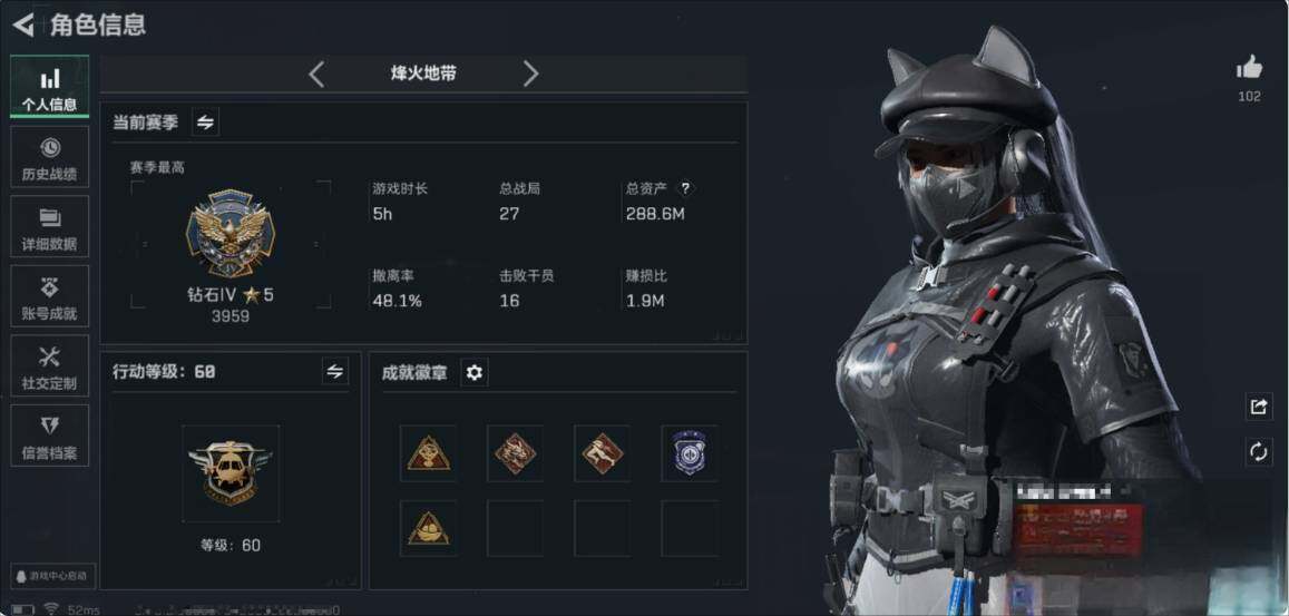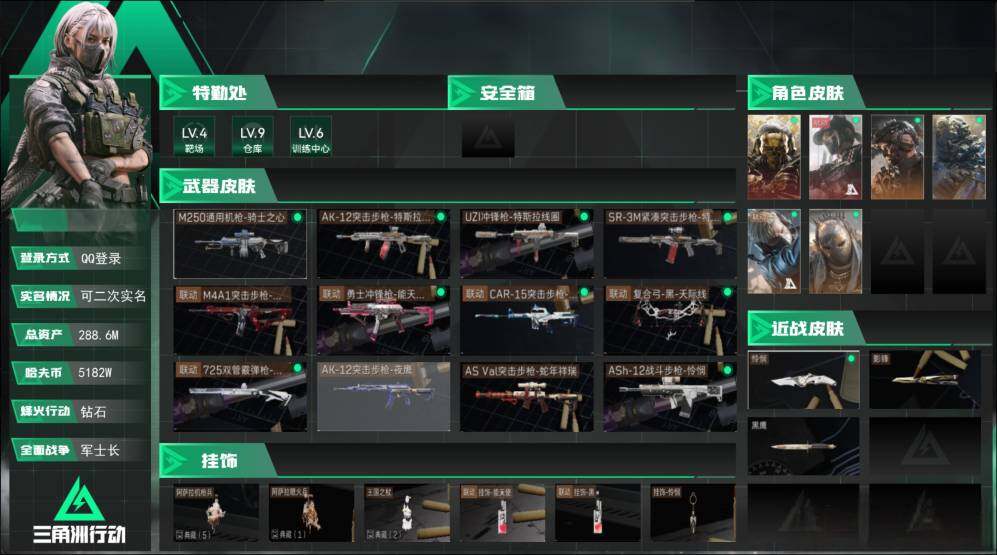 [12692068]V97396总资产:288.6M,哈夫币:5182W,武器皮肤260,烽火60级:钻石,通行证19级:烽火地带限定版 【安全箱】高级安全箱;【特勤处等级】仓库LV.9,指挥中心LV.5,训练中心LV.6,靶场LV.4,潜水中心LV.0,收藏室LV.1;【干员皮肤6】:红狼蚀金玫瑰,露娜黑天际线,威龙铁面判官,无名夜鹰,蜂医送葬人无题密令,牧羊人街头之王;【已有捆绑包5】:蚀金玫瑰捆绑包,怜悯捆绑包,影锋捆绑包,特斯拉线圈捆绑包,黑天际线捆绑包;【近战皮肤】:近战武器-怜悯,近战武器-影锋,近战武器-黑鹰;【步枪皮肤】:AK-12突击步枪-特斯拉线圈,M4A1突击步枪-阿米娅,CAR-15突击步枪-阿米娅,AK-12突击步枪-夜鹰,ASVal突击步枪-蛇年祥瑞,ASh-12战斗步枪-怜悯,M7战斗步枪-怜悯,M7战斗步枪-维京,M4A1突击步枪-蚀金玫瑰,QBZ95-1突击步枪-破军,腾龙突击步枪-无垢,SCAR-H战斗步枪-囚徒,M16A4突击步枪-竞赛选手,ASh-12战斗步枪-守夜人,SG552突击步枪-尖端治疗,ASVal突击步枪-尖端治疗,PTR-32突击步枪-英雄,AKM突击