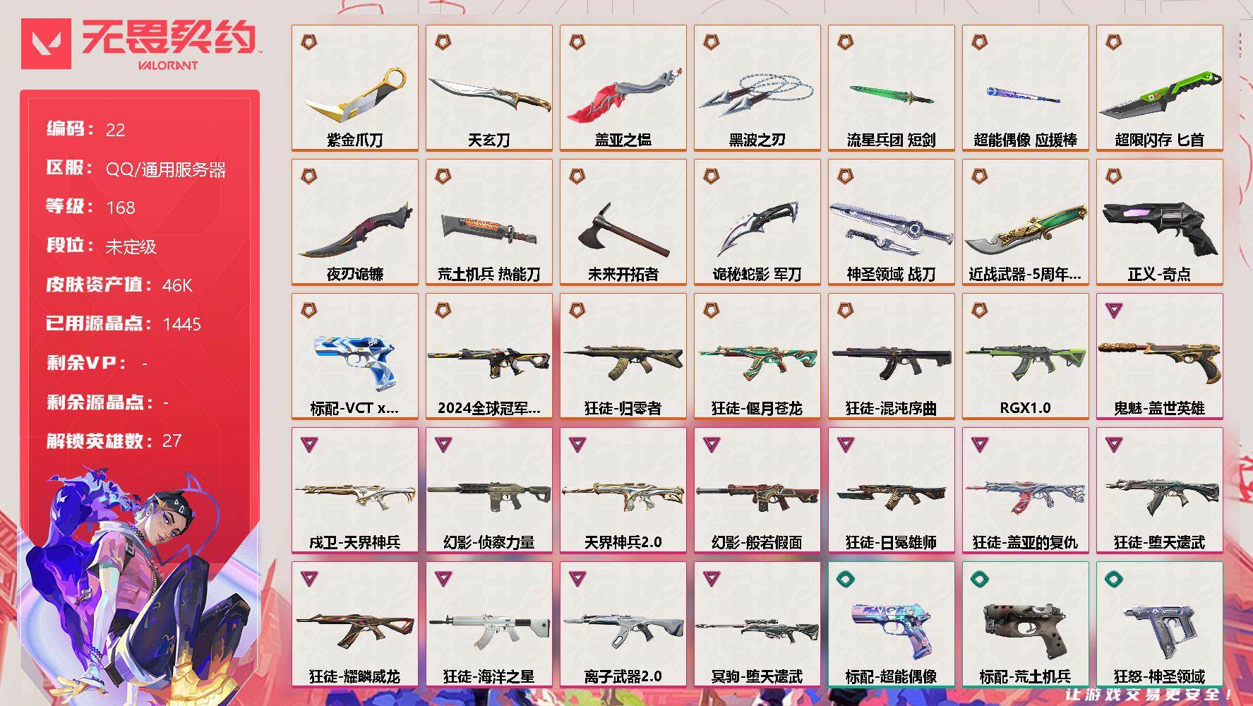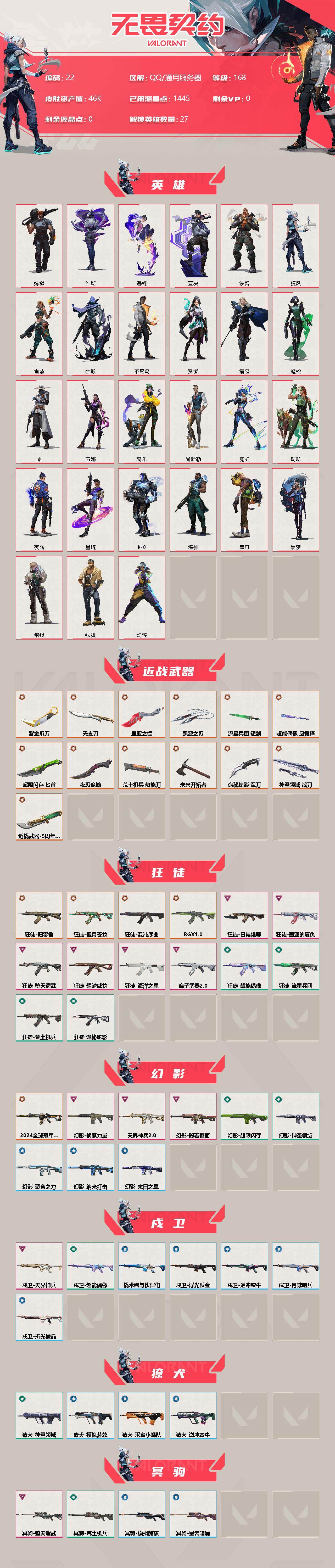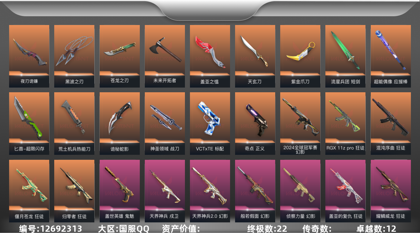 [12692313]【英雄】:幻棱,炼狱,维斯,暮蝶,钛狐,壹决,铁臂,捷风,雷兹,幽影,不死鸟,贤者,猎枭,蝰蛇,零,芮娜,奇乐,尚勃勒,霓虹,斯凯,夜露,星礈,K/O,海神,盖可,黑梦,钢锁 【近战 武器】:近战武器-5周年//公测重制版 苍龙之刃,近战武器-紫金爪刀,近战武器-黑波之刃,近战武器-未来开拓者,近战武器-流星兵团 短剑,近战武器-超能偶像 应援棒,近战武器-超限闪存 匕首,近战武器-盖亚之愠,近战武器-荒土机兵 热能刀,近战武器-天玄刀,近战武器-夜刃诡镰,近战武器-诡秘蛇影 军刀,近战武器-神圣领域 战刀 【狂徒】:狂徒-归零者,狂徒-混沌序曲,狂徒-偃月苍龙,狂徒-RGX 11z Pro,狂徒-堕天遗武,狂徒-盖亚的复仇,狂徒-海洋之星,狂徒-日冕雄师,狂徒-耀鳞威龙,狂徒-离子武器//2.0,狂徒-超能偶像,狂徒-荒土机兵,狂徒-流星兵团,狂徒-诡秘蛇影 【幻影】:幻影-2024全球冠军赛,幻影-般若假面,幻影-天界神兵//2.0,幻影-侦察力量,幻影-超限闪存,幻影-神圣领域,幻影-聚合之力,幻影-纳米打击,幻影-末日之翼 【戍卫】:戍卫-天界神兵,戍卫-超能偶像,戍卫-浮光跃金,戍卫-逆冲蛮牛,戍卫-战术熊与伙伴们,戍卫-月球哨兵,戍卫-折光棱晶 【獠犬】:獠犬-神圣领域,獠犬-采蜜小蜂队,獠犬-模拟赫兹,獠犬-逆冲蛮牛 【冥驹】:冥驹-堕天遗武,冥驹-荒土机兵,冥驹-模拟赫兹,冥驹-星云暗涌 【飞将】:飞将-聚合之力,飞将-战术熊与伙伴们,飞将-末日之翼 【莽侠】:莽侠-超限闪存,莽侠-诡秘蛇影,莽侠-纤云弄巧,莽侠-月球哨兵 【战神】:战神-神圣领域,战神-采蜜小蜂队,战神-浮光跃金 【奥丁】:奥丁-流星兵团,奥丁-纳米打击,奥丁-末日之翼 【判官】:判官-超能偶像,判官-诡秘蛇影,判官-采蜜小蜂队,判官-纳米打击x 【雄鹿】:雄鹿-模拟赫兹,雄鹿-逆冲蛮牛,雄鹿-月球哨兵 【骇灵】:骇灵-荒土机兵,骇灵-流星兵团,骇灵-浮光跃金,骇灵-星云暗涌 【蜂刺】:蜂刺-超限闪存,蜂刺-聚合之力,蜂刺-纤云弄巧,蜂刺-星云暗涌,蜂刺-折光棱晶 【标配】:标配-超能偶像,标配-荒土机兵,标配-浮光跃金,标配-战术熊与伙伴们,标配-折光棱晶 【VCT手枪】:标配-VCT x TE 【正义】:正义-奇点,正义-超限闪存,正义-复古浪潮,正义-纳米打击,正义-纤云弄