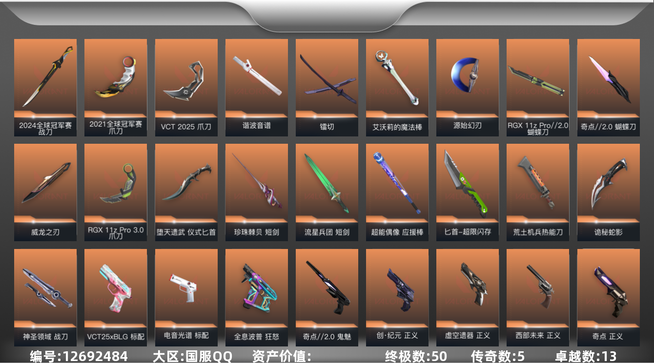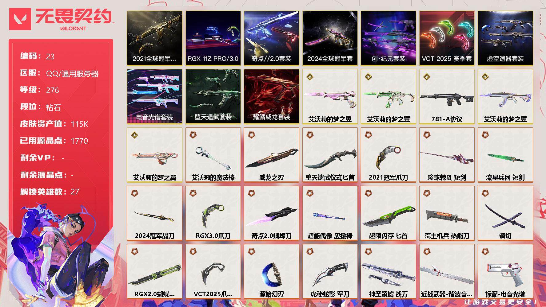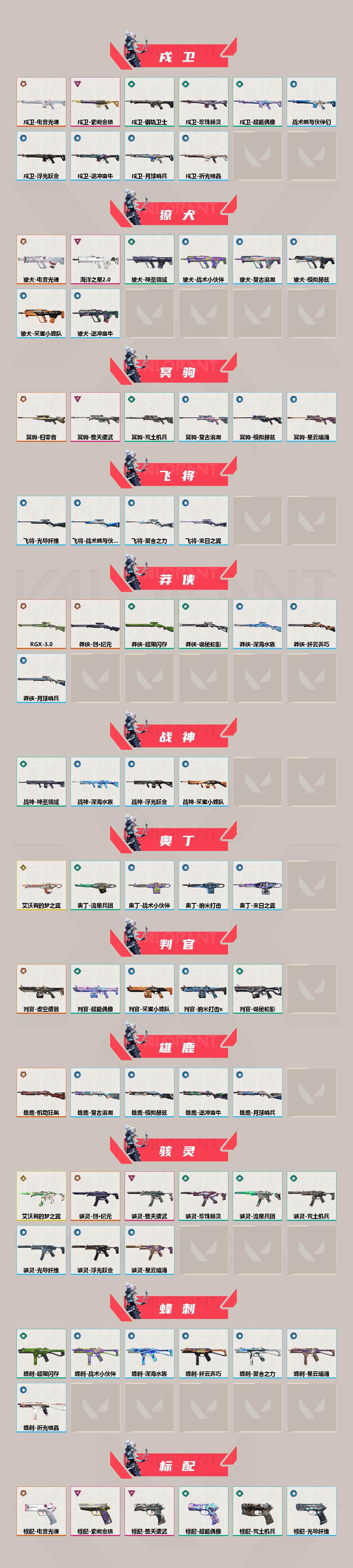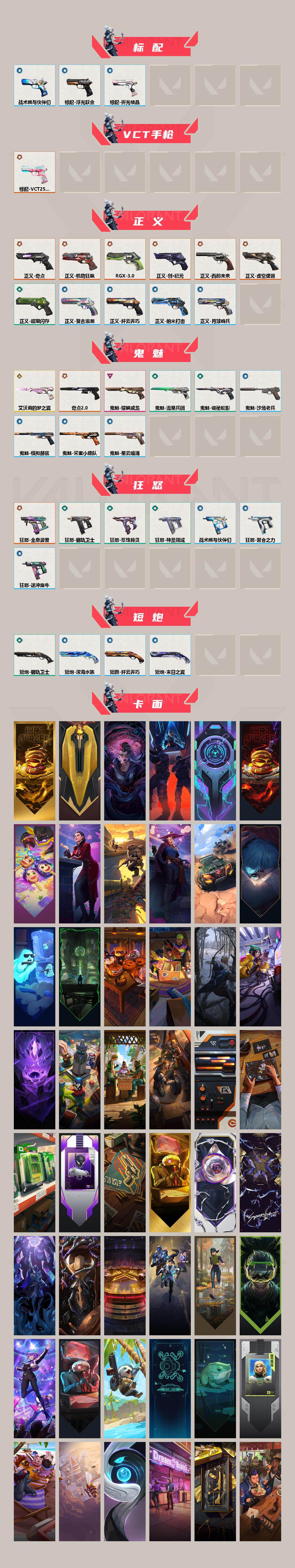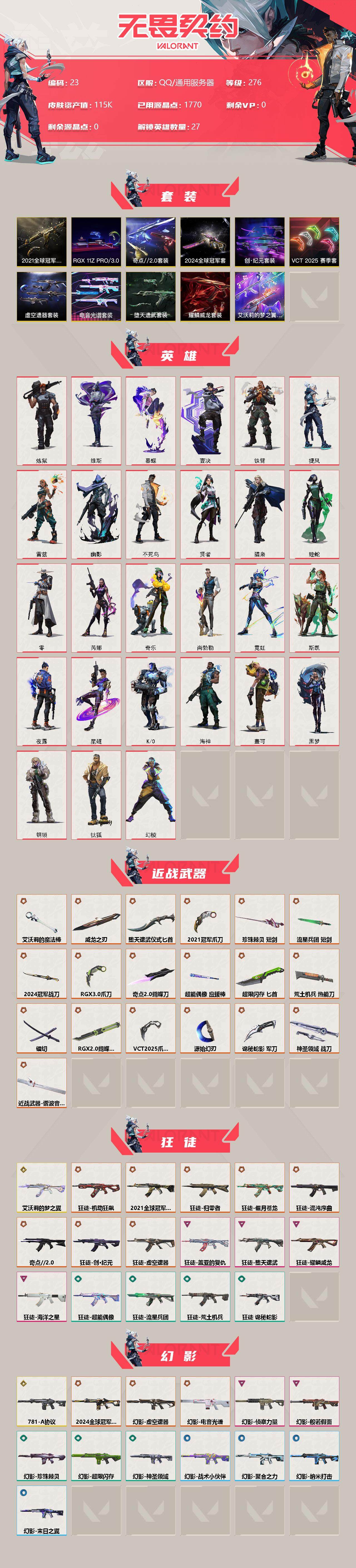 [12692484]【套装】:2024全球冠军赛套装,2021全球冠军赛套装,艾沃莉的梦之翼套装,电音光谱套装,虚空遗器套装,VCT 2025 赛季套装,创·纪元套装,RGX 11z Pro//3.0套装,奇点//2.0套装,耀鳞威龙套装,堕天遗武套装 【英雄】:幻棱,炼狱,维斯,暮蝶,钛狐,壹决,铁臂,捷风,雷兹,幽影,不死鸟,贤者,猎枭,蝰蛇,零,芮娜,奇乐,尚勃勒,霓虹,斯凯,夜露,星礈,K/O,海神,盖可,黑梦,钢锁 【近战 武器】:近战武器-2024全球冠军赛 战刀,近战武器-2021全球冠军赛 爪刀,近战武器-谐波音谱,近战武器-RGX 11z Pro//2.0 蝴蝶刀,近战武器-奇点//2.0 蝴蝶刀,近战武器-VCT 2025 爪刀,近战武器-RGX 11z Pro//3.0 爪刀,近战武器-镭切,近战武器-艾沃莉的魔法棒,近战武器-威龙之刃,近战武器-源始幻刃,近战武器-珍珠棘贝 短剑,近战武器-流星兵团 短剑,近战武器-超能偶像 应援棒,近战武器-超限闪存 匕首,近战武器-堕天遗武 仪式匕首,近战武器-荒土机兵 热能刀,近战武器-诡秘蛇影 军刀,近战武器-神圣领域 战刀 【狂徒】:狂徒-艾沃莉的梦之翼,狂徒-2021全球冠军赛,狂徒-归零者,狂徒-混沌序曲,狂徒-机动狂飙,狂徒-奇点//2.0,狂徒-偃月苍龙,狂徒-创·纪元,狂徒-虚空遗器,狂徒-堕天遗武,狂徒-盖亚的复仇,狂徒-海洋之星,狂徒-耀鳞威龙,狂徒-超能偶像,狂徒-荒土机兵,狂徒-流星兵团,狂徒-诡秘蛇影 【幻影】:幻影-781-A协议,幻影-2024全球冠军赛,幻影-虚空遗器,幻影-电音光谱,幻影-般若假面,幻影-侦察力量,幻影-超限闪存,幻影-珍珠棘贝,幻影-神圣领域,幻影-聚合之力,幻影-纳米打击,幻影-战术小伙伴,幻影-末日之翼,幻影-电音光谱 【戍卫】:戍卫-电音光谱,戍卫-紫阙金琅,戍卫-超能偶像,戍卫-钢轨卫士,戍卫-珍珠棘贝,戍卫-浮光跃金,戍卫-逆冲蛮牛,戍卫-战术熊与伙伴们,戍卫-月球哨兵,戍卫-折光棱晶,戍卫-电音光谱 【獠犬】:獠犬-电音光谱,獠犬-海洋之星//2.0,獠犬-神圣领域,獠犬-采蜜小蜂队,獠犬-复古浪潮,獠犬-模拟赫兹,獠犬-逆冲蛮牛,獠犬-战术小伙伴,獠犬-电音光谱 【冥驹】:冥驹-归零者,冥驹-堕天遗武,冥驹-荒土机兵,冥驹-复古浪潮,冥驹-模拟赫兹,冥驹-星