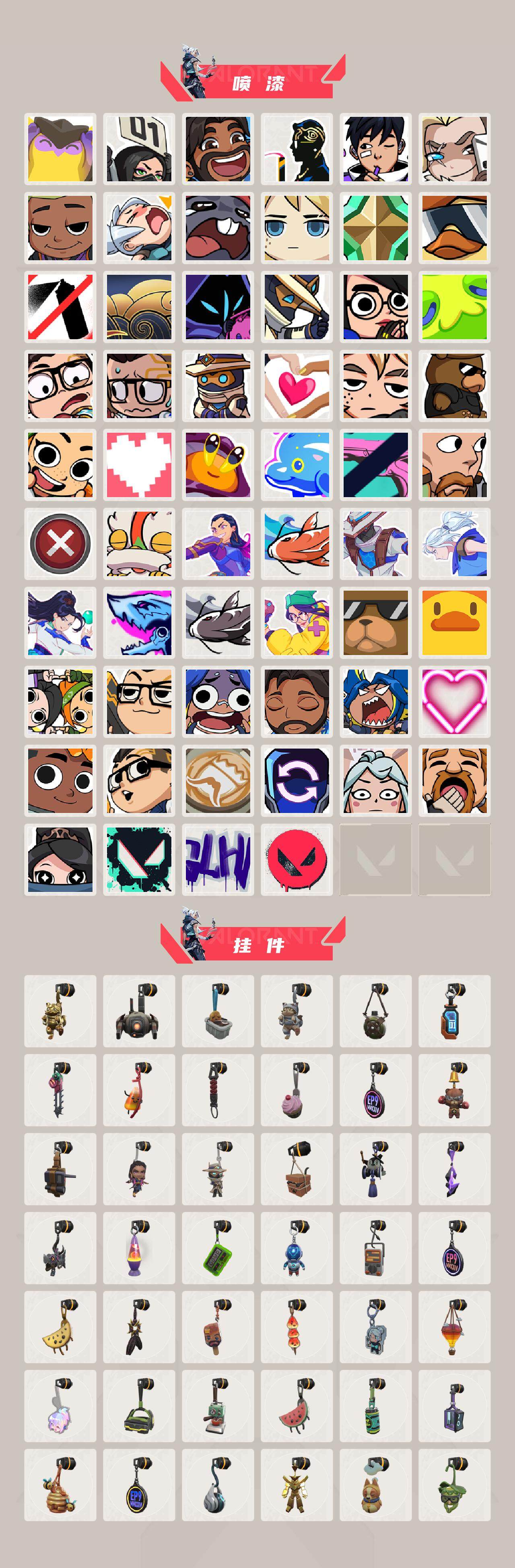 - [12912995]【套装】:滋滋X特攻队套装,掠影//2.0套装 【英雄】:幻棱,炼狱,钛狐,捷风,幽影,不死鸟,贤者,猎枭,芮娜,夜露,钢锁 【近战 武器】:近战武器-影钩,近战武器-嘟昂嘟昂超弹力水球拳套,近战武器-魔术火花,近战武器-镭切,近战武器-神圣领域 战刀,近战武器-魔术火花 【狂徒】:狂徒-滋滋X特攻队,狂徒-掠影,狂徒-盖亚的复仇,狂徒-奇幻朋克//3.0 【幻影】:幻影-侦察力量,幻影-掠影//2.0,幻影-奇幻朋克//3.0,幻影-神圣领域 【戍卫】:戍卫-月球哨兵 【獠犬】:獠犬-神圣领域 【冥驹】:冥驹-滋滋X特攻队,冥驹-起源,冥驹-星云暗涌 【莽侠】:莽侠-月球哨兵 【战神】:战神-神圣领域 【奥丁】:奥丁-掠影//2.0 【雄鹿】:雄鹿-月球哨兵 【骇灵】:骇灵-掠影//2.0,骇灵-星云暗涌 【蜂刺】:蜂刺-星云暗涌 【标配】:标配-紫阙金琅,标配-神罚 【正义】:正义-掠影,正义-传奇制造,正义-纳米打击,正义-月球哨兵 【鬼魅】:鬼魅-掠影//2.0,鬼魅-诡秘蛇影,鬼魅-星云暗涌 【狂怒】:狂怒-神圣领域 【卡面】:终章:激斗汉堡 卡面,进入射程 卡面,《双城之战》拥抱 卡面,精灵大战 卡面,欢迎来到底城 卡面,南瓜盛典 卡面,红鳞松叶 卡面,无畏契约:尚勃勒 卡面,打造专属狂徒 卡面,表象之下 卡面,无畏契约GO!第一卷:芮娜 卡面,盖可工牌 卡面,无畏契约GO!第一卷:零 卡面,无垠星环 卡面,别冒尖 卡面,代号红色 卡面,新兵报到 卡面,V契约 卡面,无畏契约 卡面 【喷漆】:嗨宝南瓜灯 喷漆,嘭! 喷漆,都算到了 喷漆,控场勿近 喷漆,小丑猫 喷漆,分身有术 喷漆,致命优雅 喷漆,买装还是存钱 喷漆,暴走萝莉 喷漆,飓刃涂鸦 喷漆 ,放下武器 喷漆,爆泉领域 喷漆,胜利属于无畏契约 喷漆,GLHF 喷漆,无畏契约 喷漆 【挂饰】:终章:猫猫木乃伊 挂饰,悠闲鸡块 挂饰,伞绳 挂饰,《双城之战》小蛋糕 挂饰,第九季//第三幕 纪念币 挂饰,丢麦 挂饰,Z世代特饮 挂饰,有事联系 挂饰,天外飞客 挂饰,《双城之战》魄罗 挂饰,无畏契约 纪念币 挂饰