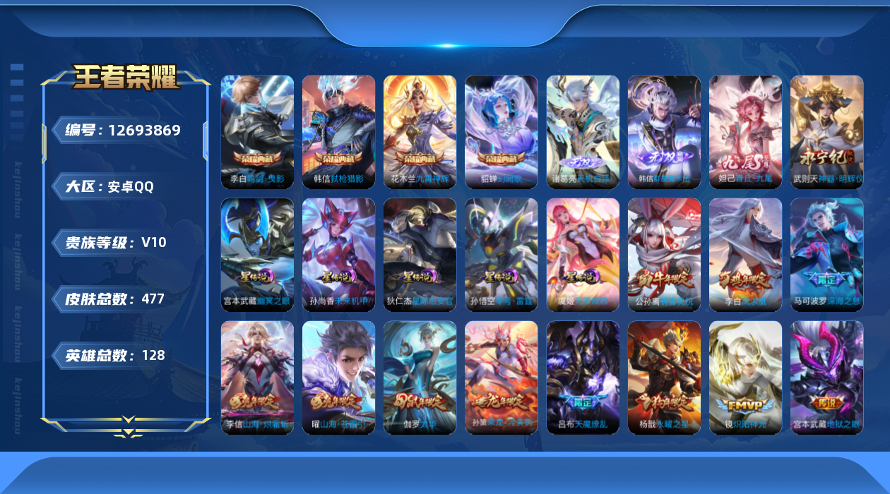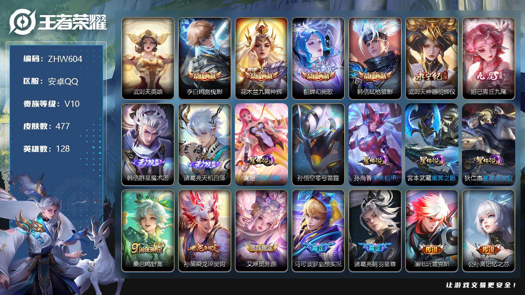 [12693869]安卓Q-V10-至尊星耀III段位-128英雄-477皮肤-4典藏-4无双-49传说-160史诗