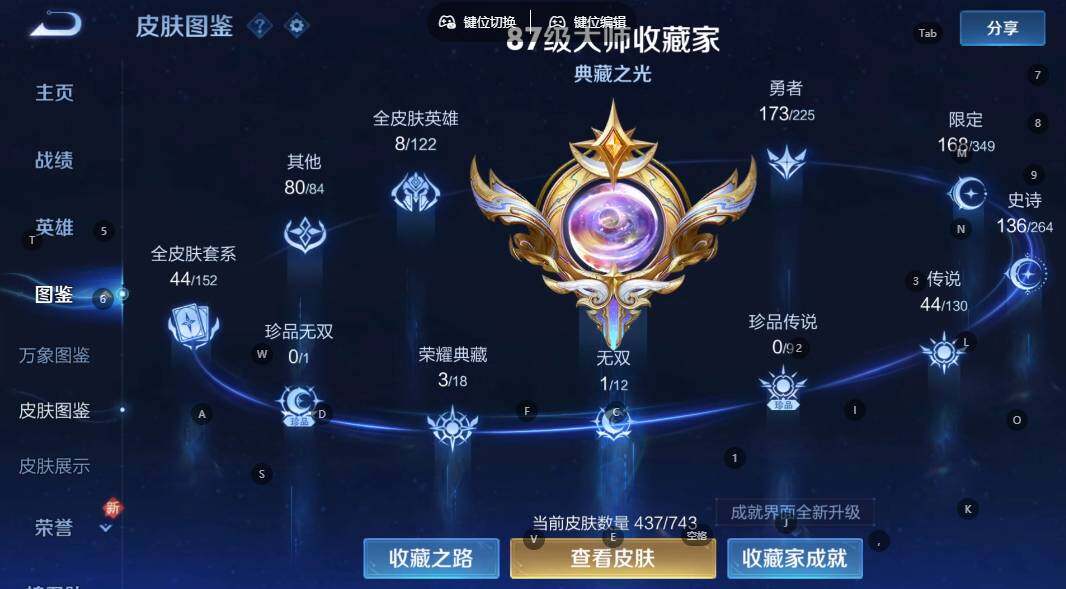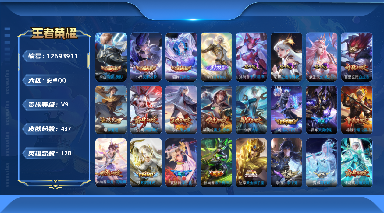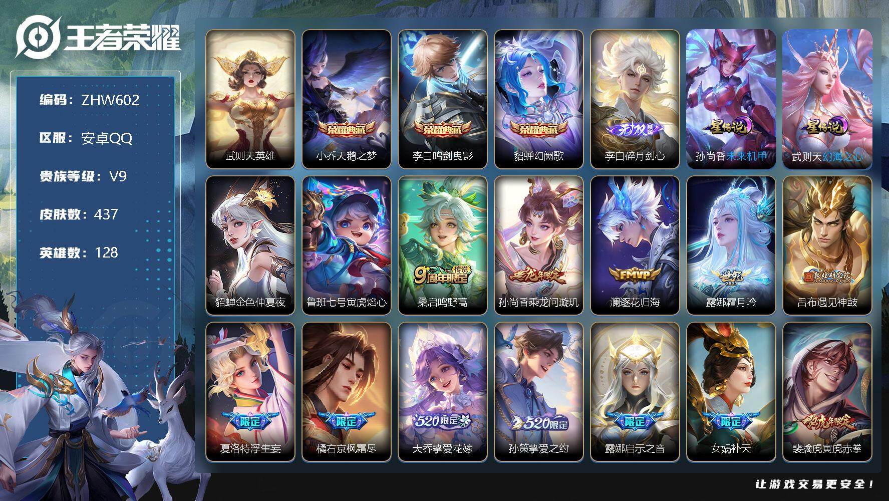 [12693911]安卓Q-V9-至尊星耀III段位-128英雄-437皮肤-4典藏4星传说-1无双-44传说-136史诗