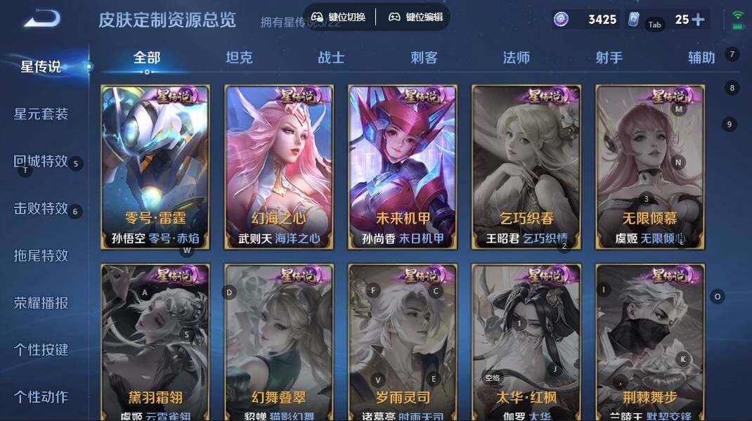 亚瑟狮心王,庄周蜃楼王,孙膑妖精王,扁鹊炼金王,虞姬凯尔特女王,白起狰,太乙真人饕餮,曹操烛龙,芈月重明,典韦穷奇,狂铁御狮,米莱狄御霄,牛魔御旌,盾山御銮,夏侯惇朔风刀,明世隐疑决卦,老夫子醍醐杖,鬼谷子原初探秘者,狄仁杰万华元夜,程咬金演武夺筹,钟馗驱傩正仪,苏烈千军破阵,吕布猎兽之王,嬴政白昼王子,女娲朔望之晖,钟馗神迹守卫,鲁班七号狮舞东方,沈梦溪星空之诺,李元芳银河之约,马可波罗暗影游猎,蒙犽狂想玩偶喵,弈星混沌棋,达摩沙漠行僧,兰陵王金庭之子,沈梦溪大漠名商,李元芳云中旅人,桑启海盐诗旅,裴擒虎擒涛扼浪,鲁班大师探海日志,张良古海寻踪