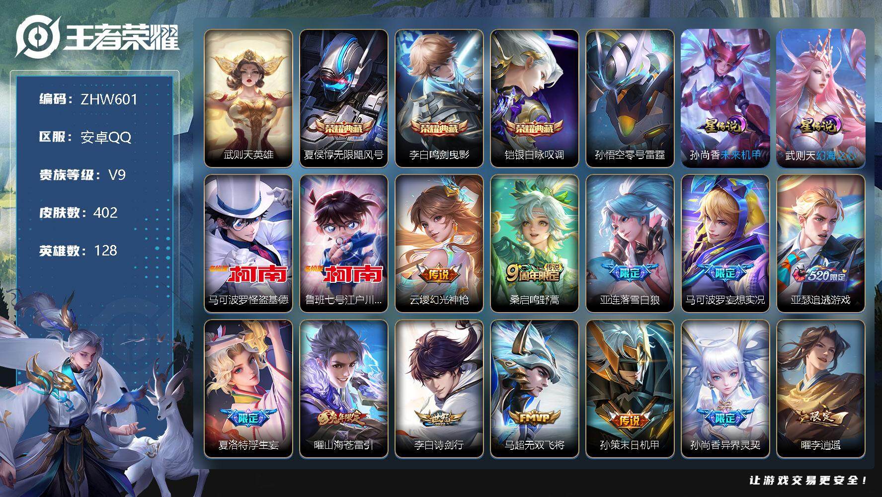 [12693989]安卓Q-V9-最强王者段位-128英雄-402皮肤-3典藏3星传说-2珍品传说-30传说-116史诗 【英雄全皮】:刘禅全皮,孙权全皮,太乙真人全皮,鬼谷子全皮,猪八戒全皮,蒙恬全皮,夏洛特全皮,空空儿全皮,影全皮 【荣耀典藏】:武则天英雄,夏侯惇无限飓风号,李白鸣剑曳影,铠银白咏叹调 【珍品传说】:马可波罗怪盗基德,鲁班七号江户川柯南 【传说皮肤】:云缨幻光神枪,桑启鸣野蒿,亚连落雪白狼,马可波罗妄想实况,亚瑟追逃游戏,夏洛特浮生妄,曜山海苍雷引,李白诗剑行,马超无双飞将,孙策末日机甲,孙尚香异界灵契,曜李逍遥 ,公孙离祈雪灵祝,镜炽阳神光,虞姬启明星使,孙悟空零号赤焰,关羽武圣,李信一念神魔,干将莫邪久胜战神,虞姬云霓雀翎,达摩黄金狮子座,百里玄策白虎志,花木兰冠军飞将,李白凤求凰,孙尚香末日机甲,宫本武藏地狱之眼,孙悟空地狱火,吕布天魔缭乱,武则天海洋之心,狄仁杰超时空战士 【限定皮肤】:白起狰,姜子牙天穹之誓,杨戬破阵退雄兵,狄仁杰阴阳师,虞姬凯尔特女王,赵云皇家上将,赵云龙胆,妲己时之彼端,嬴政优雅恋人,嬴政白昼王子,孙尚香异界灵契,鲁班七号狮舞东方,庄周蜃楼王,庄周高山流水,高渐离死亡摇滚,钟无艳王者之锤,钟无艳超时空战士,孙膑妖精王,扁鹊炼金王,白起夜都怪侠,芈月重明,吕布天魔缭乱,吕布猎兽之王,元歌无心,夏侯惇朔风刀,甄姬游园惊梦,甄姬落雪兰心,曹操烛龙,典韦穷奇,马可波罗逐梦之星,马可波罗暗影游猎,马可波罗山海玄木吟,马可波罗妄想实况,狄仁杰魔术师,狄仁杰万华元夜,达摩沙漠行僧,项羽海滩派对,项羽霸王别姬,老夫子醍醐杖,关羽冰锋战神,关羽武圣,貂蝉逐梦之音,程咬金演武夺筹,韩信逐梦之影,王昭君午后时光,兰陵王金庭之子,花木兰青春决赛季,花木兰瑞麟志,亚瑟狮心王,亚瑟追逃游戏,孙悟空至尊宝,孙悟空零号赤焰,牛魔御旌,李元芳银河之约,李元芳云中旅人,虞姬霸王别姬,虞姬启明星使,钟馗神迹守卫,钟馗驱傩正仪,杨玉环遇见飞天,女娲朔望之晖,干将莫邪冰霜恋舞曲,干将莫邪胡桃夹子,雅典娜黎明之约,蔡文姬繁星吟游,太乙真人饕餮,太乙真人华丽摇滚,鬼谷子原初探秘者,鬼谷子五谷丰年,苏烈玄武志,苏烈千军破阵,百里玄策白虎志,百里玄策原初追逐者,百里守约朱雀志,弈星混沌棋,梦奇顽趣,梦奇天降福星,公孙离祈雪灵祝,沈梦溪星空之诺,沈梦溪大漠名商,明世隐疑决卦,明世隐吟游