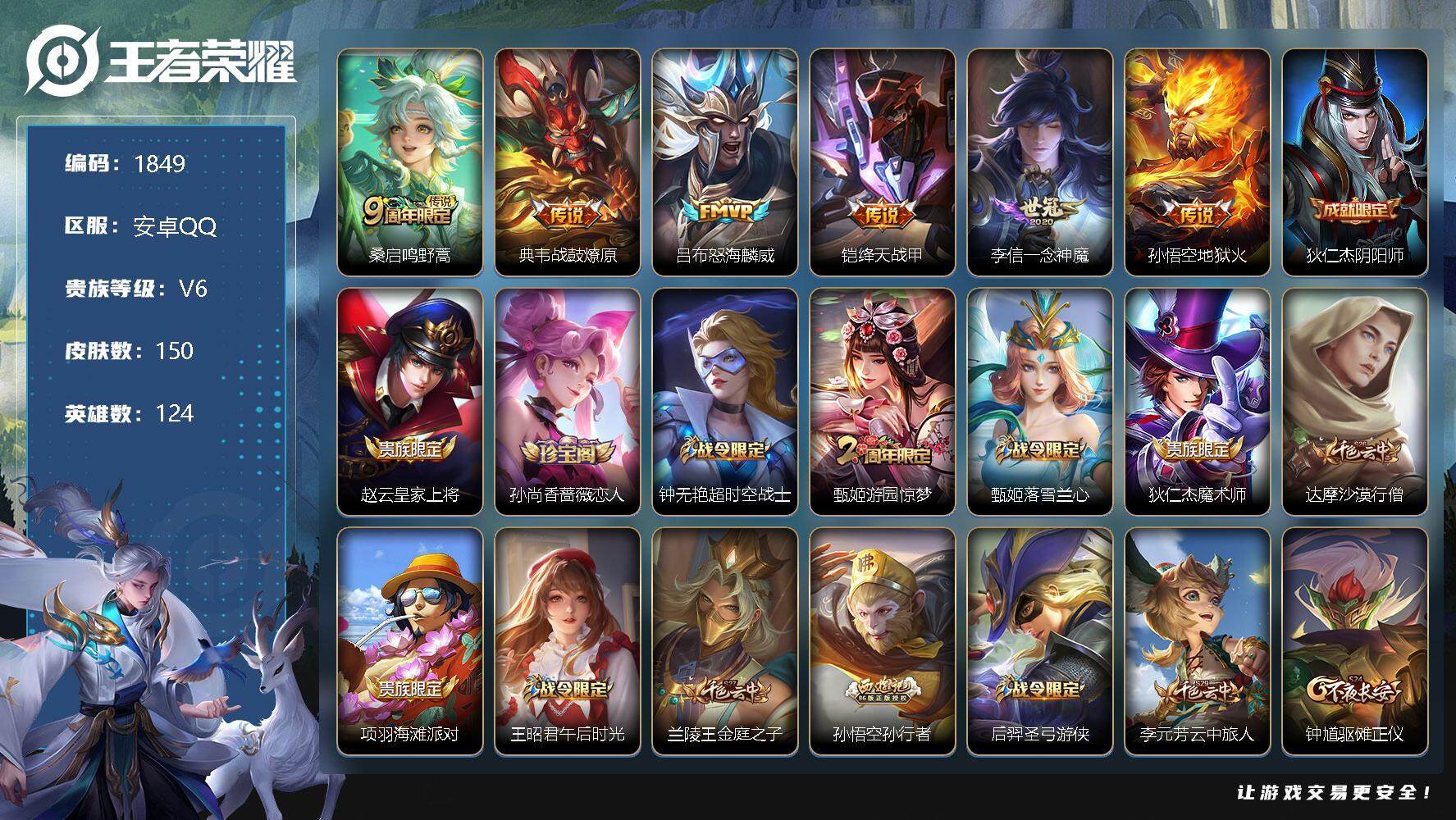 [12694247]安卓Q-V5-荣耀黄金II段位-124英雄-150皮肤-0典藏-0珍品无双-0无双-0珍品传说-6传说-35史诗