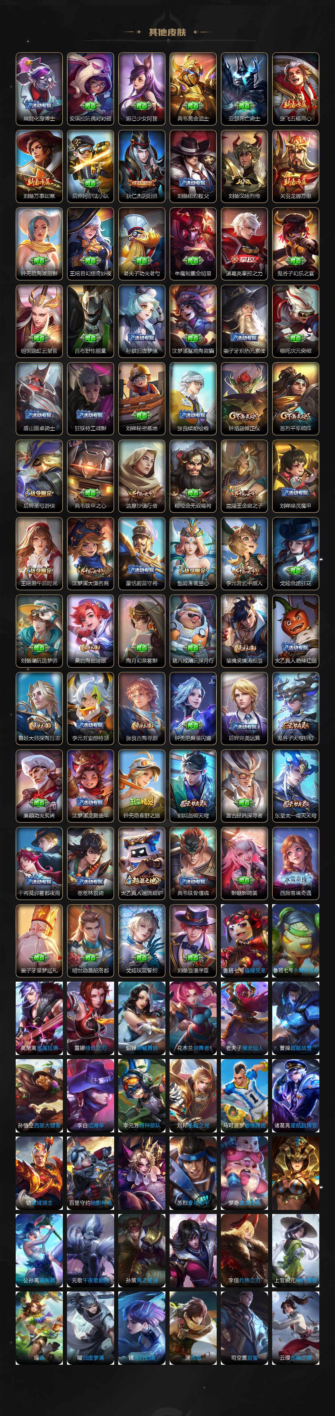 【限定皮肤】:狄仁杰阴阳师,赵云皇家上将,孙尚香蔷薇恋人,钟无艳超时空战士,甄姬游园惊梦,甄姬落雪兰心,狄仁杰魔术师,达摩沙漠行僧,项羽海滩派对,王昭君午后时光,兰陵王金庭之子,孙悟空孙行者,后羿圣弓游侠,李元芳云中旅人,钟馗驱傩正仪,干将莫邪真爱魔法,鬼谷子五谷丰年,铠青龙志,苏烈千军破阵,沈梦溪大漠名商,裴擒虎李小龙,裴擒虎擒涛扼浪,狂铁电玩高手,鲁班大师探海日志,桑启海盐诗旅,阿古朵江河有灵,张良古海寻踪,鬼谷子天穹祈灯,沈梦溪龙舞盛年,刘邦剑破天穹