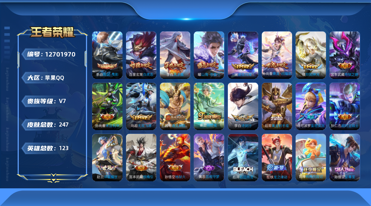[12701970]苹果Q-V5-永恒钻石II段位-123英雄-247皮肤-1典藏-0珍品无双-0无双-0珍品传说-18传说-71史诗