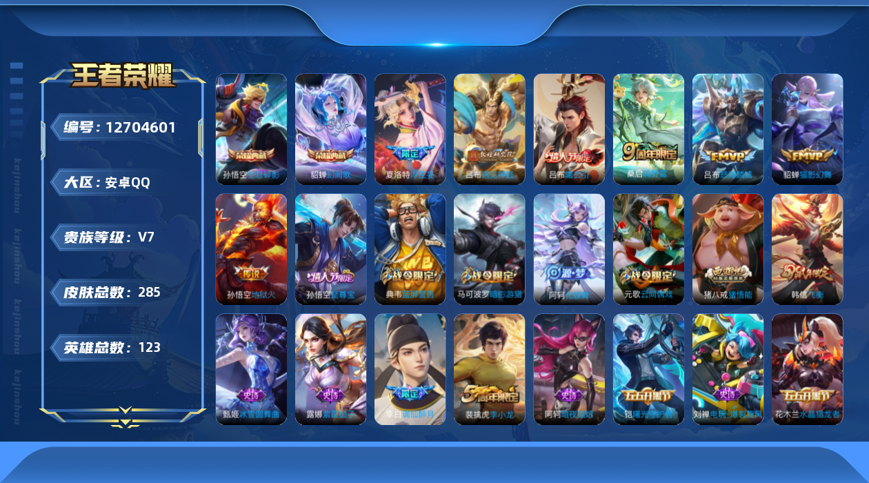 [12704601]安卓Q-V6-至尊星耀I段位-123英雄-285皮肤-2典藏-0珍品无双-0无双-0珍品传说-7传说-72史诗