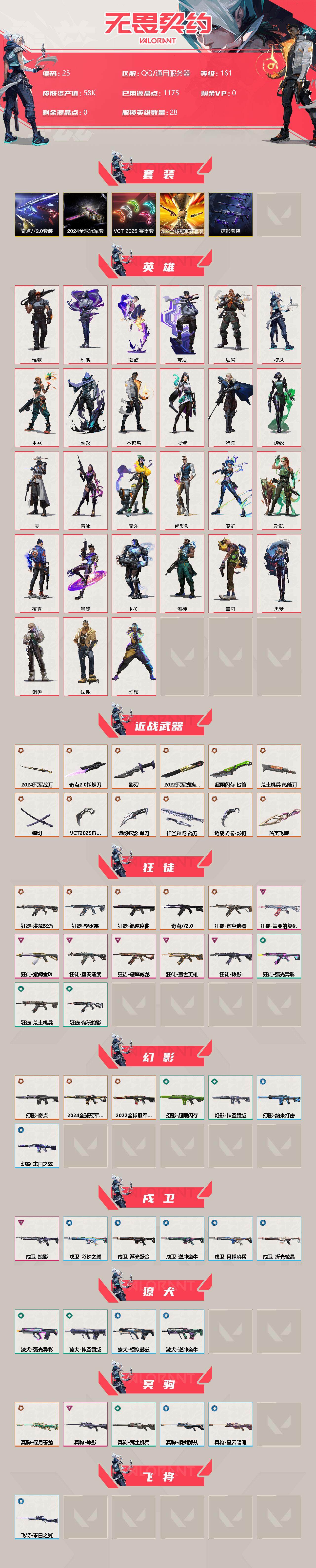 [12706484]【套装】:2024全球冠军赛套装,2022全球冠军赛套装,VCT 2025 赛季套装,奇点//2.0套装,掠影套装 【英雄】:幻棱,炼狱,维斯,暮蝶,钛狐,壹决,铁臂,捷风,雷兹,幽影,不死鸟,贤者,猎枭,蝰蛇,零,芮娜,奇乐,尚勃勒,霓虹,斯凯,夜露,星礈,K/O,海神,盖可,黑梦,钢锁 【近战 武器】:近战武器-2024全球冠军赛 战刀,近战武器-2022全球冠军赛 蝴蝶刀,近战武器-影钩,近战武器-奇点//2.0 蝴蝶刀,近战武器-VCT 2025 爪刀,近战武器-落英飞旋,近战武器-镭切,近战武器-超限闪存 匕首,近战武器-荒土机兵 热能刀,近战武器-影刃,近战武器-诡秘蛇影 军刀,近战武器-神圣领域 战刀 【狂徒】:狂徒-洪荒怒焰,狂徒-混沌序曲,狂徒-奇点//2.0,狂徒-塑水宗,狂徒-虚空遗器,狂徒-堕天遗武,狂徒-掠影,狂徒-盖世英雄,狂徒-盖亚的复仇,狂徒-耀鳞威龙,狂徒-紫阙金琅,狂徒-弧光异彩,狂徒-荒土机兵,狂徒-诡秘蛇影 【幻影】:幻影-2022全球冠军赛,幻影-2024全球冠军赛,幻影-奇点,幻影-超限闪存,幻影-神圣领域,幻影-纳米打击,幻影-末日之翼 【戍卫】:戍卫-掠影,戍卫-彩梦之城,戍卫-浮光跃金,戍卫-逆冲蛮牛,戍卫-月球哨兵,戍卫-折光棱晶 【獠犬】:獠犬-弧光异彩,獠犬-神圣领域,獠犬-模拟赫兹,獠犬-逆冲蛮牛 【冥驹】:冥驹-偃月苍龙,冥驹-掠影,冥驹-荒土机兵,冥驹-模拟赫兹,冥驹-星云暗涌 【飞将】:飞将-末日之翼 【莽侠】:莽侠-超限闪存,莽侠-诡秘蛇影,莽侠-月球哨兵 【战神】:战神-神圣领域,战神-浮光跃金 【奥丁】:奥丁-纳米打击,奥丁-信手涂鸦,奥丁-末日之翼 【判官】:判官-诡秘蛇影,判官-纳米打击x 【雄鹿】:雄鹿-彩梦之城,雄鹿-模拟赫兹,雄鹿-逆冲蛮牛,雄鹿-月球哨兵 【骇灵】:骇灵-荒土机兵,骇灵-浮光跃金,骇灵-信手涂鸦,骇灵-星云暗涌 【蜂刺】:蜂刺-超限闪存,蜂刺-弧光异彩,蜂刺-星云暗涌,蜂刺-折光棱晶 【标配】:标配-荒土机兵,标配-彩梦之城,标配-浮光跃金,标配-折光棱晶 【正义】:正义-西部未来,正义-掠影,正义-离子武器,正义-超限闪存,正义-纳米打击,正义-月球哨兵 【鬼魅】:鬼魅-奇点//2.0,鬼魅-诡秘蛇影,鬼魅-模拟赫兹,鬼魅-信手涂鸦,鬼魅-星云暗涌 【狂怒】:狂怒-