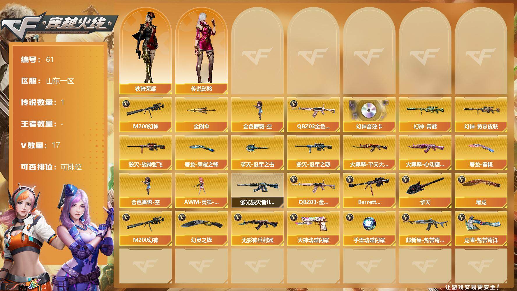 [12706534]山东一区-17V-0王者-0炫金 【传说角色】:传说影煞 【热门武器】:QBZ03-金色蔷薇,M200-幻神,金色蔷薇-空,金刚伞 【音效卡】:M200-幻神音效卡 【稀有皮肤】:M200-幻神-黄忠皮肤,幻神-青鹤,火麒麟-平天大圣,火麒麟-心动糖果,毁灭-冠军之怒,毁灭-战神张飞,屠龙-荣耀之锋,屠龙-春桃 皮肤,擎天-冠军之击 【角色】:传说影煞,铁骑荣耀 【人偶武器】:金色蔷薇-空,AWM-灵狐-15周年嘉年华 【挑战大师】:激光毁灭者III-白马银枪 【英雄级武器】:幻灵之锋,天神-动感闪耀,手雷-动感闪耀,QBZ03-金色蔷薇,无影-神兵利器,Barrett-毁灭,M200-幻神,超新星-热带奇洋,擎天,屠龙,龙啸-热带奇洋 【特殊枪械】: